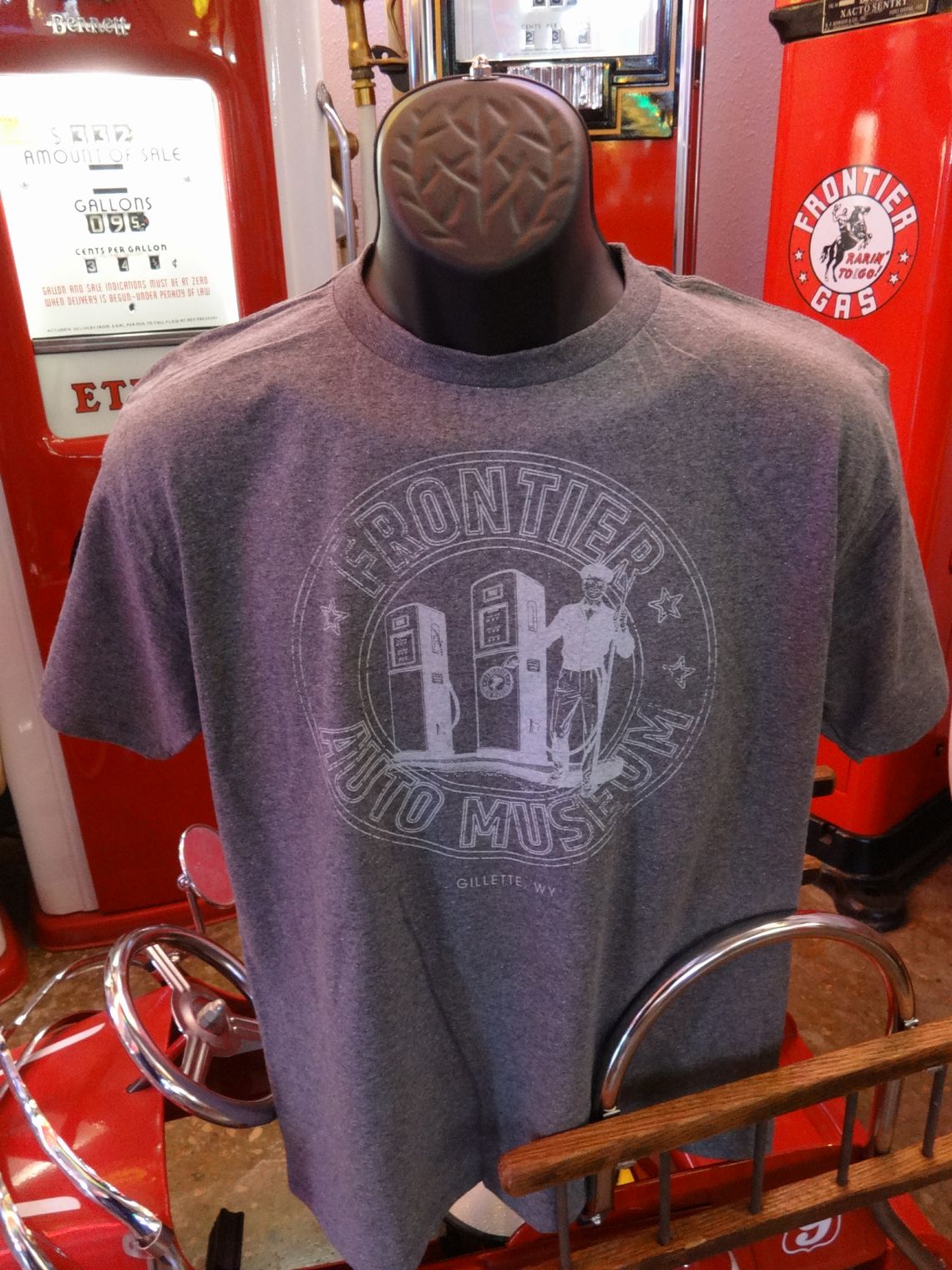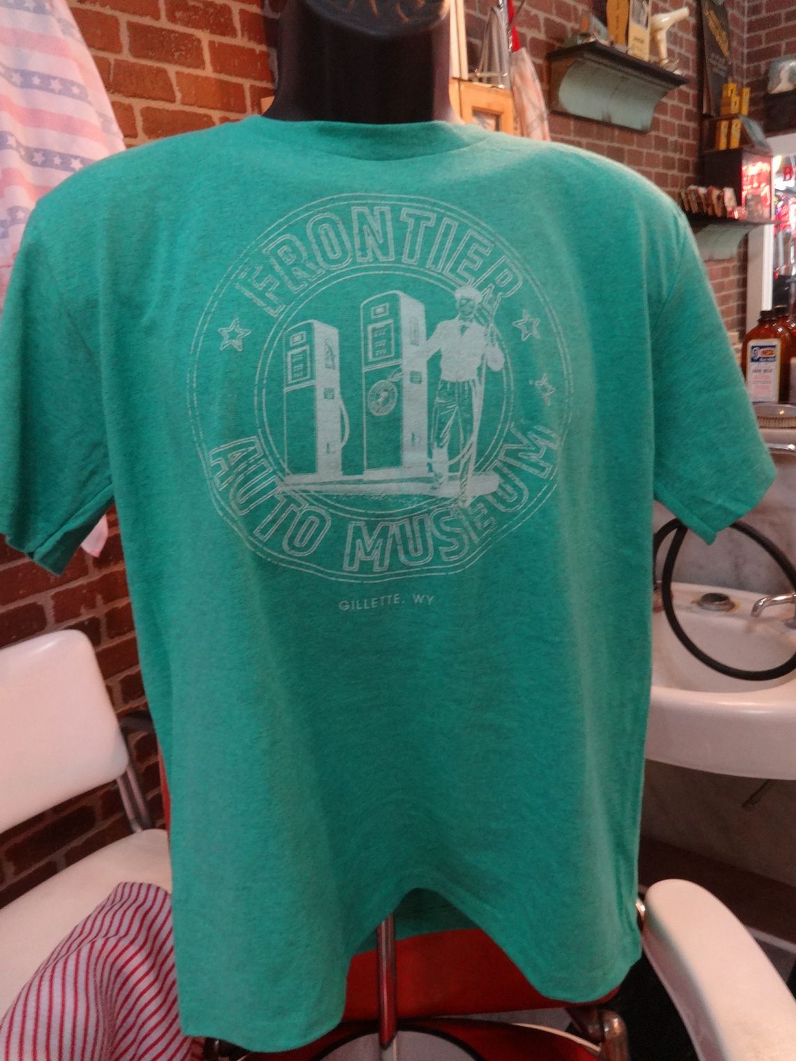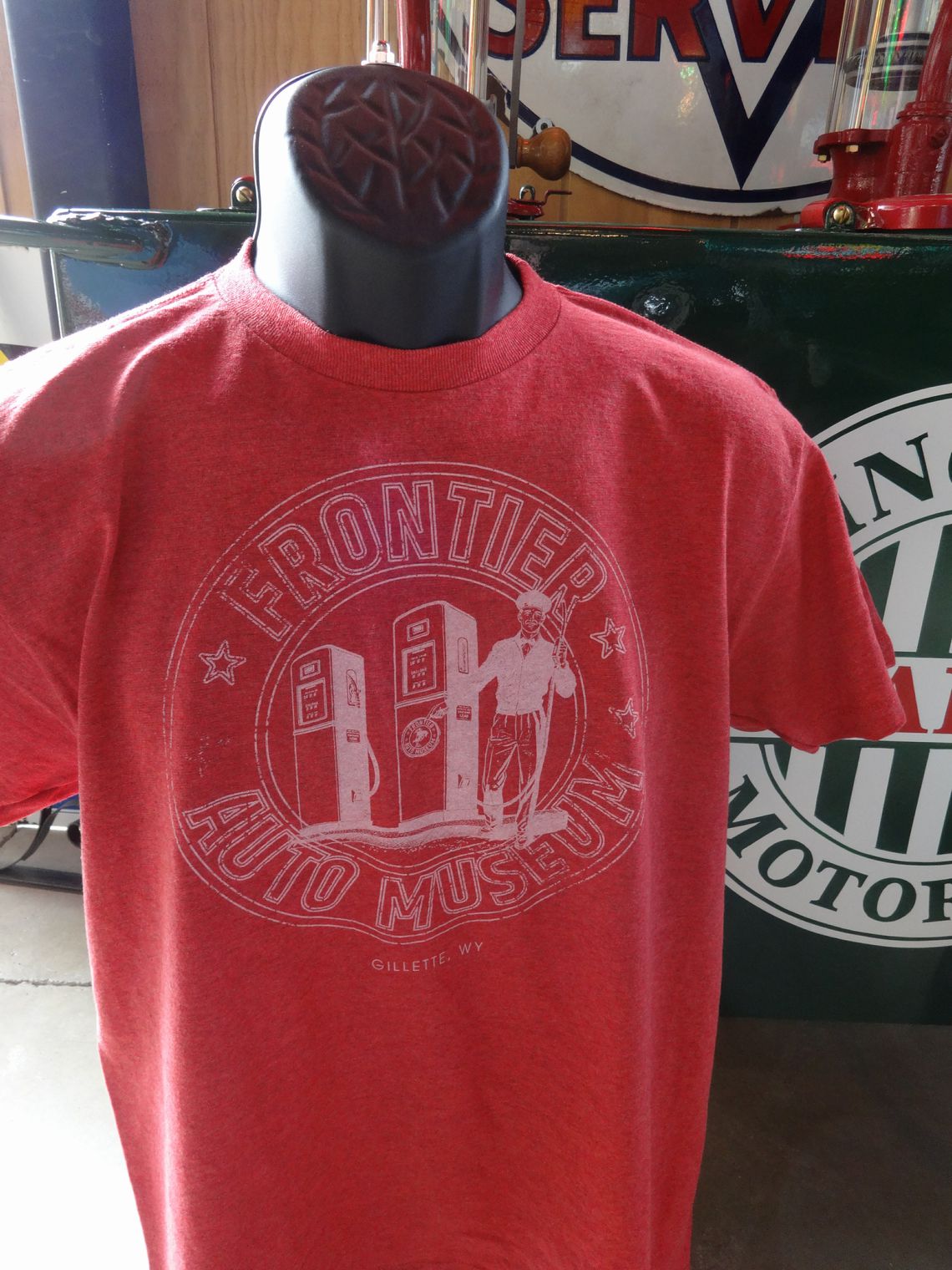 Youth Frontier Gas Guy Shirt in Heathered Red, Green or Gray, 60/40 Cotton/ Poly blend in Youth Sizes Small to XL. Please specify size and color when ordering. Frontier Auto Museum, Gillette, Wyoming.