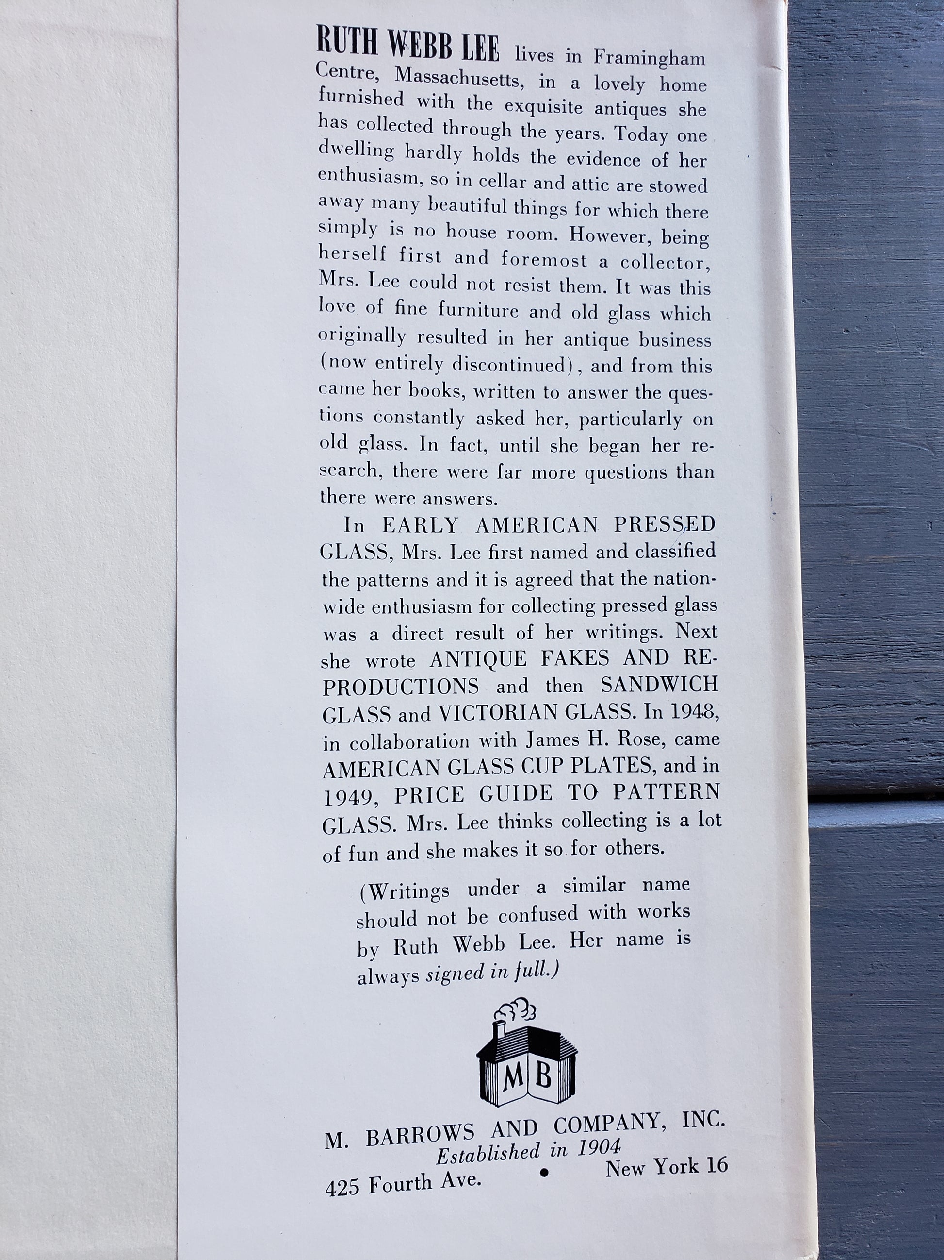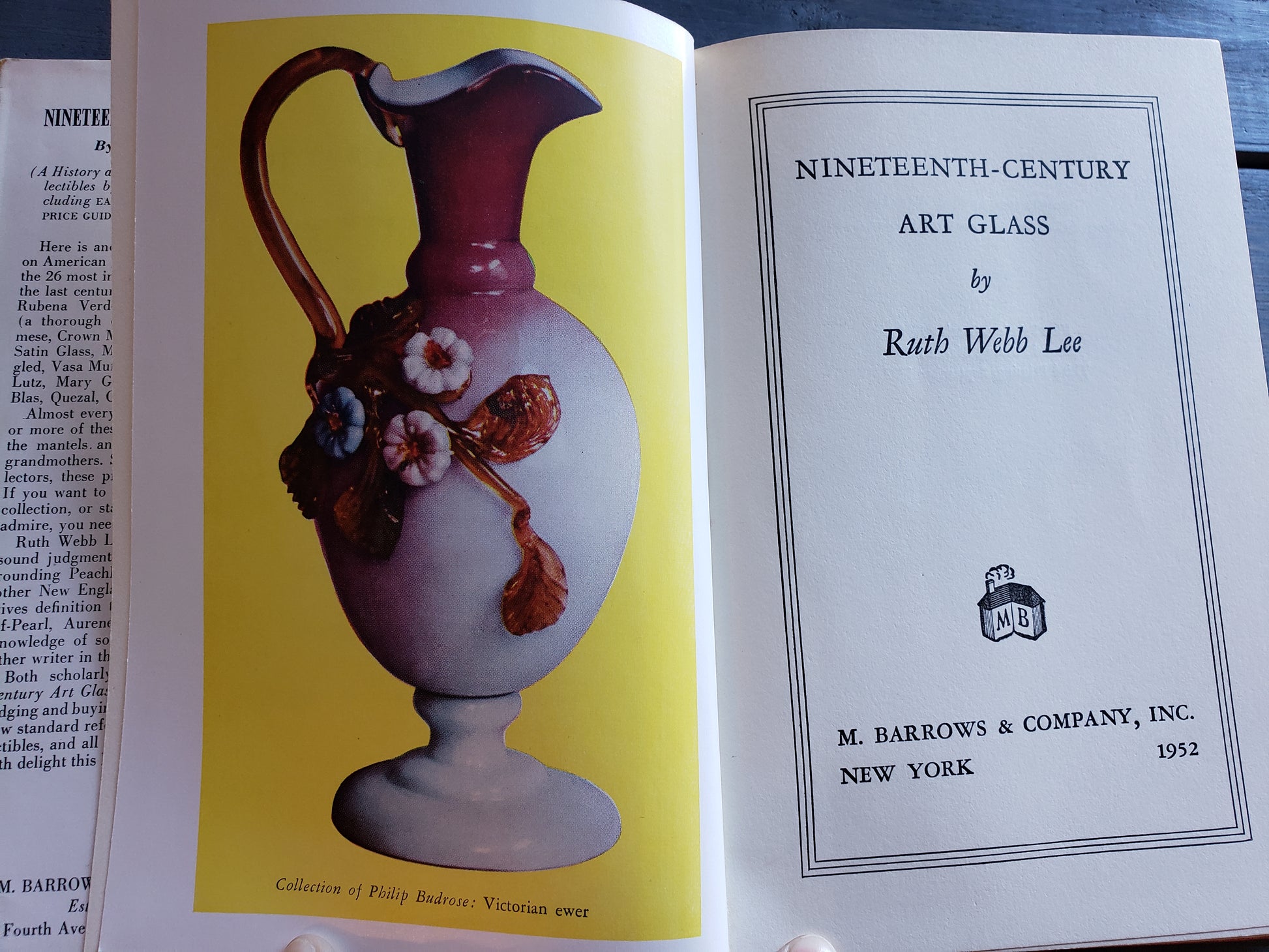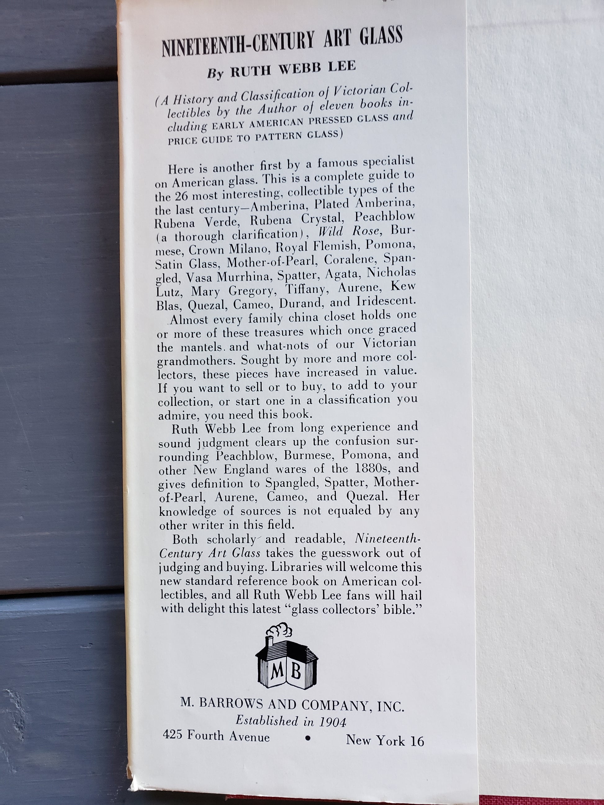 Nineteenth Century Art Glass by Ruth Webb Lee , a 128 page hardback published in 1957. This is a complete guide to the 26 most interesting collectible types of mid century glass: Amberina, Plated Amberina, Rubena Verde, Rubena Crystal, Peachblow, Wild Rose, Burmese, Crown Milano, Royal Flemish, Pomona, Satin Glass, Mother of Pearl, Caralene, Spangled, Vasa Murrhina, Spatter, Agata, Nicholas Lutz, Mary Gregory, Tiffany, Aurene, Kew Blas, Quezal, Cameo, Durand and Iridescent. Fair vintage condition.
