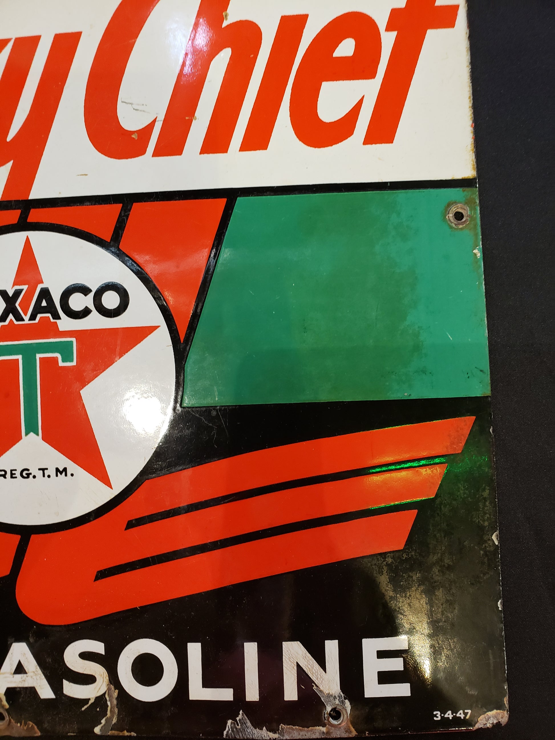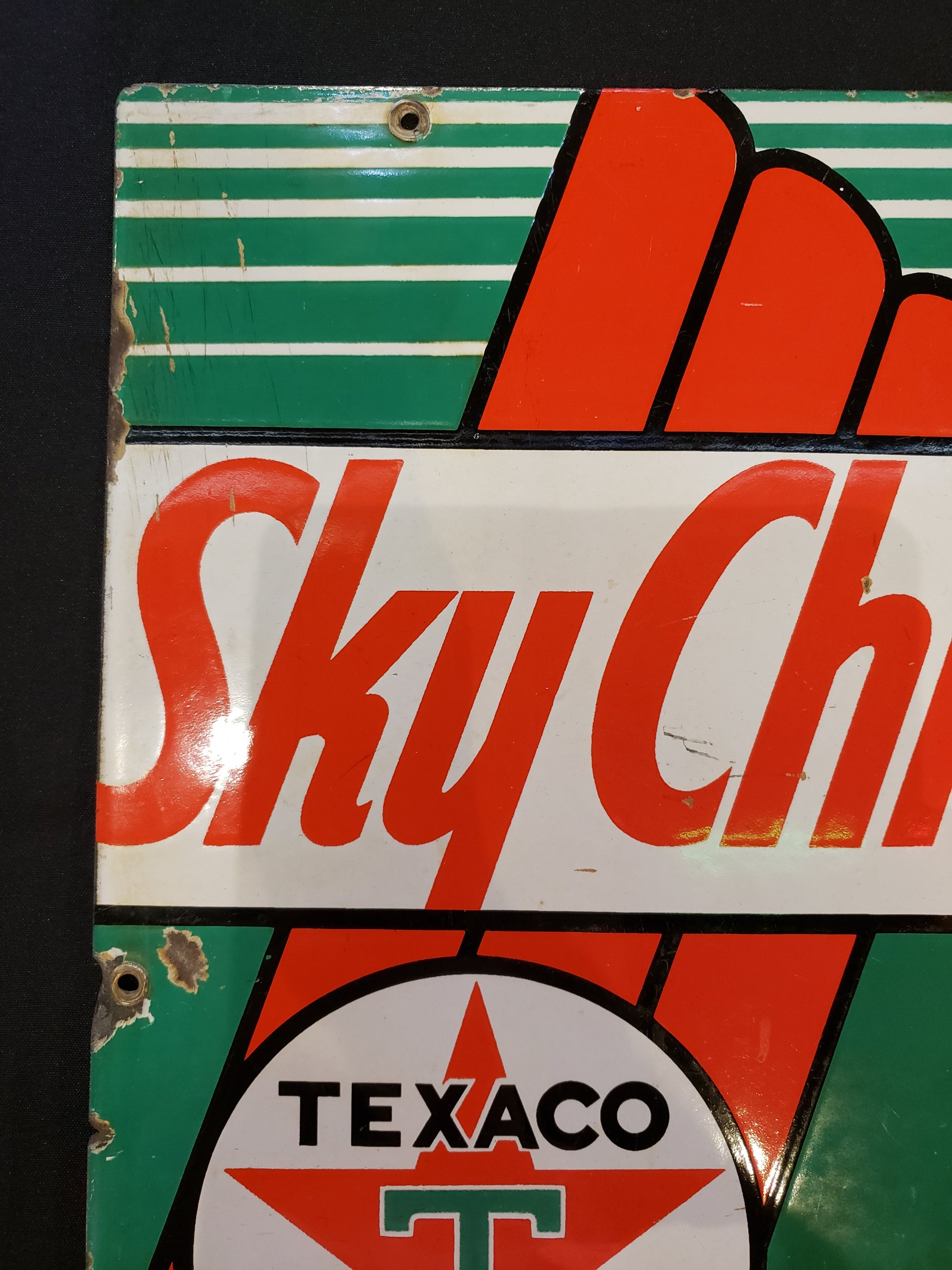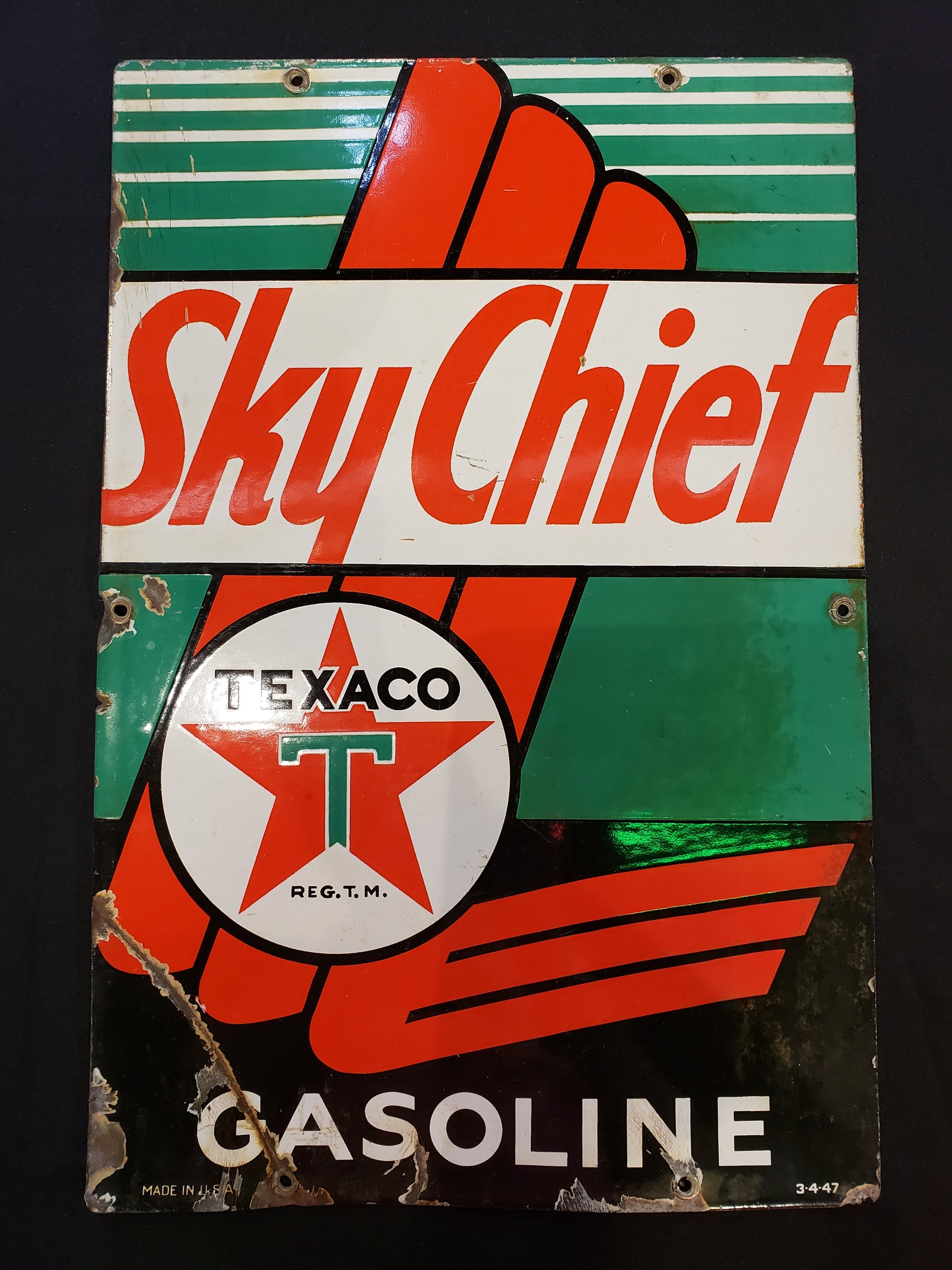 RARE 1950's era gas porcelain gas pump plate advertising Sky Chief Gasoline. This plate measures 18 x 12 inches. This is an original plate in fair used condition. Bright Red, green, black and white colors, this will be a conversation piece in your garage or recreation room or a great addition to your Oil and Gas collection. The lower left corner is creased and there are some chips along the edges, priced accordingly. Lower right corner dated 3-4-47.