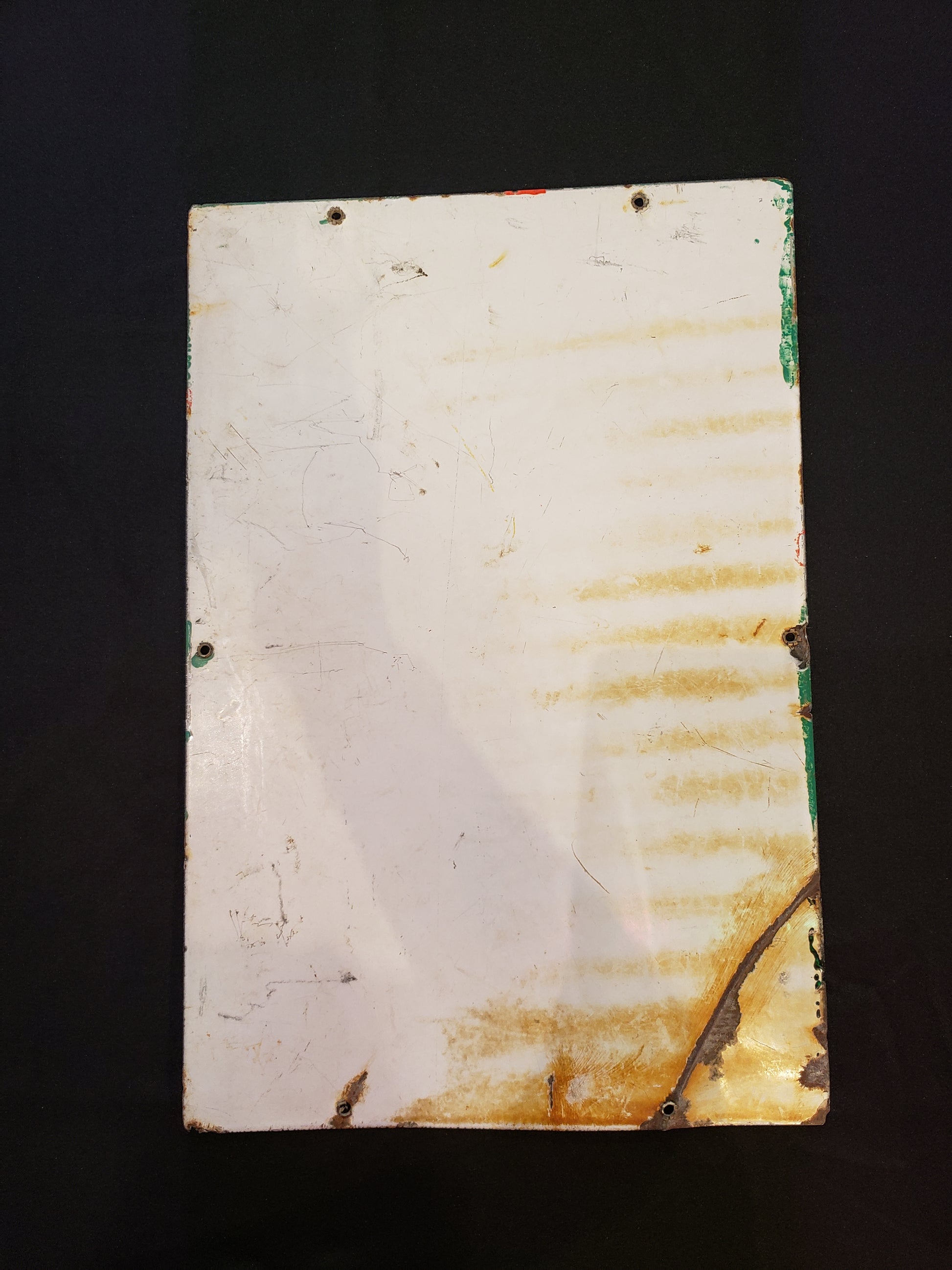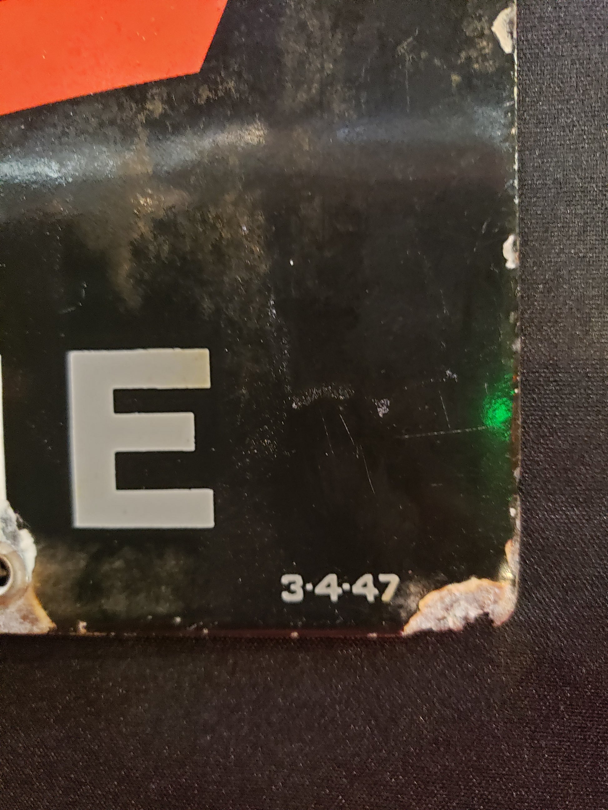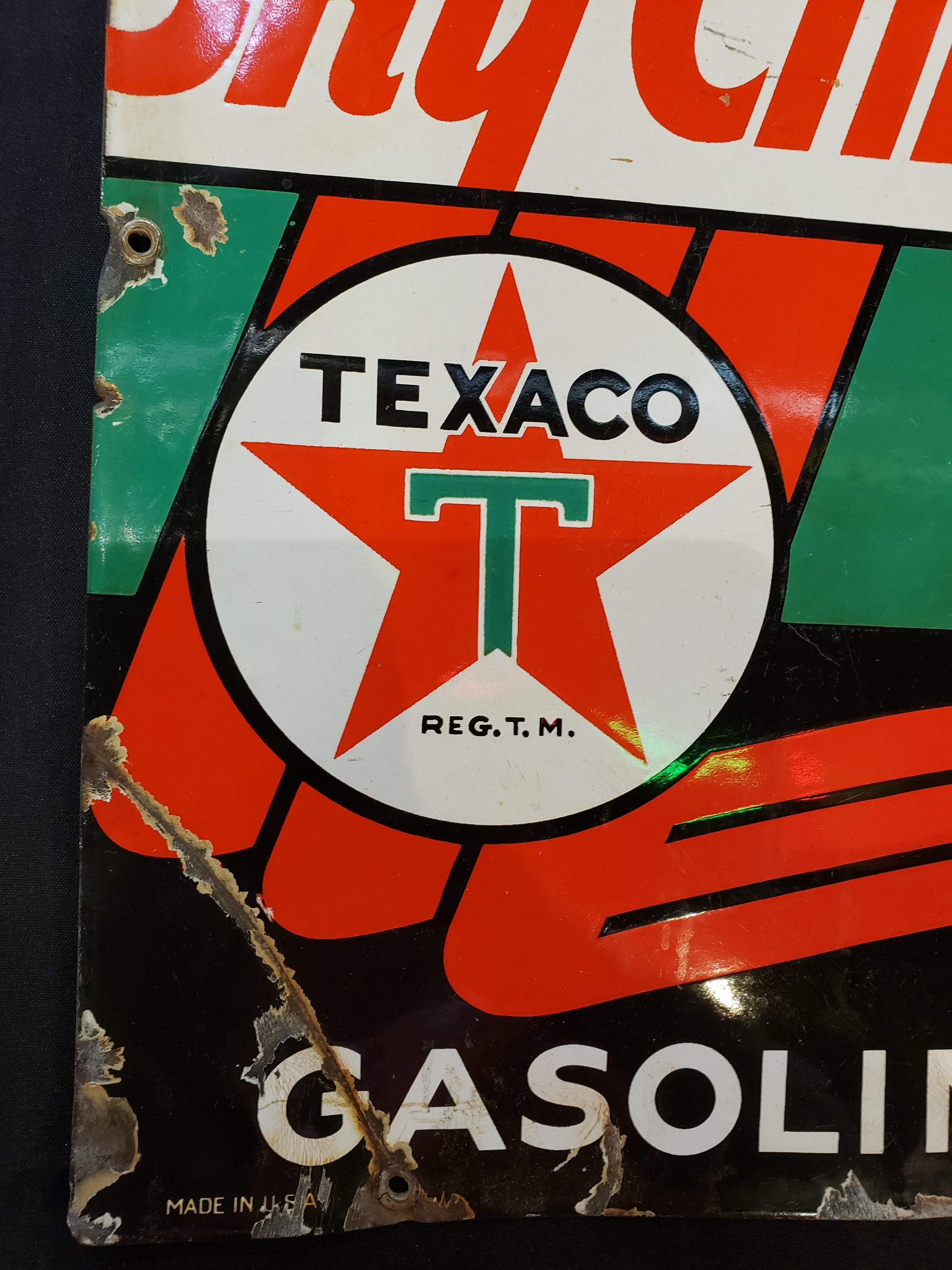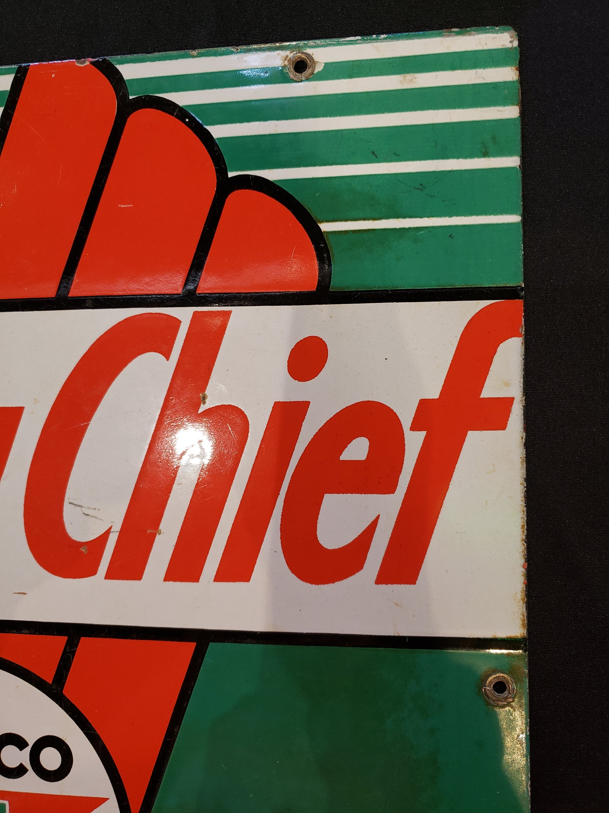 RARE 1950's era gas porcelain gas pump plate advertising Sky Chief Gasoline. This plate measures 18 x 12 inches. This is an original plate in fair used condition. Bright Red, green, black and white colors, this will be a conversation piece in your garage or recreation room or a great addition to your Oil and Gas collection. The lower left corner is creased and there are some chips along the edges, priced accordingly. Lower right corner dated 3-4-47.
