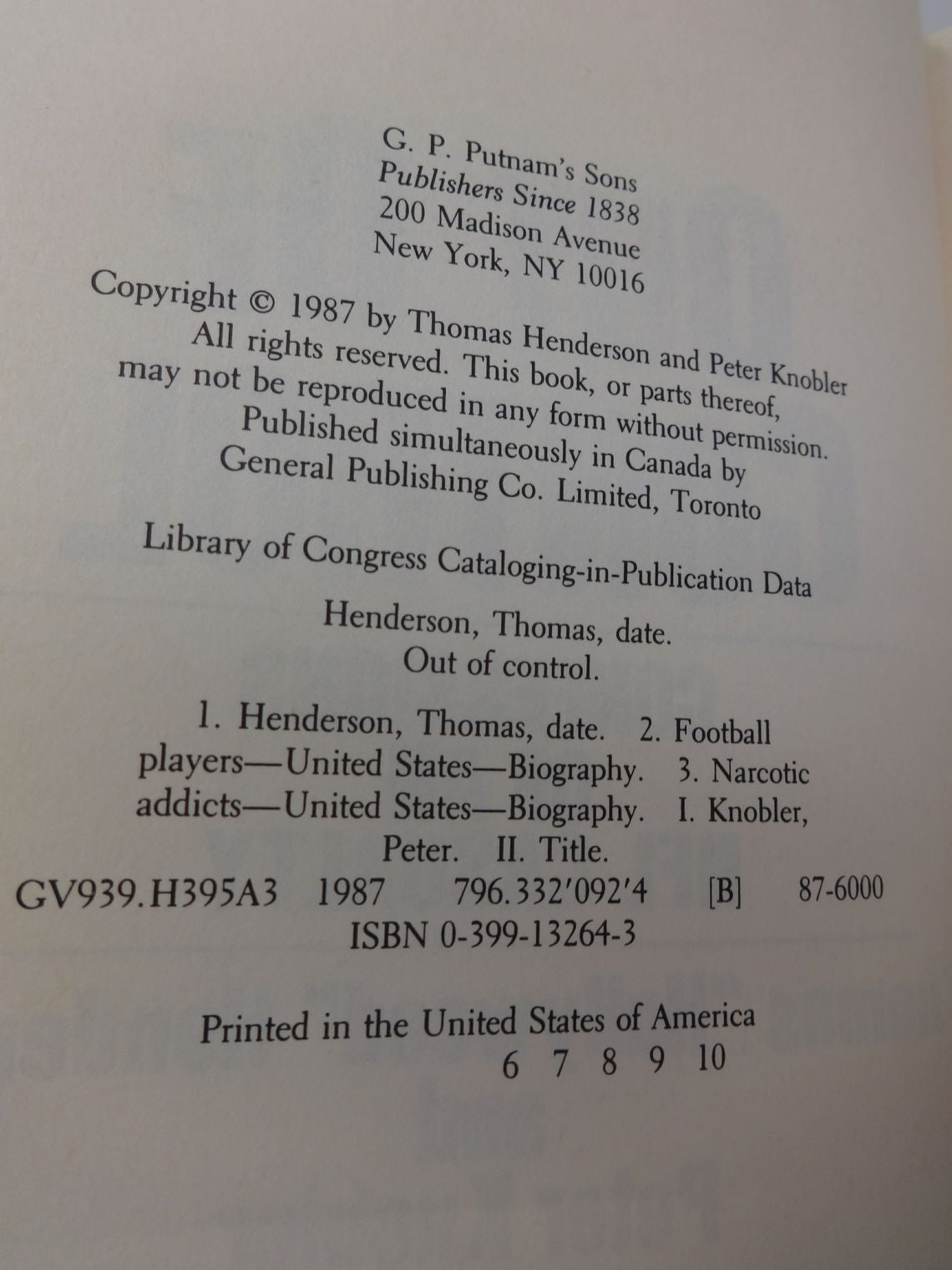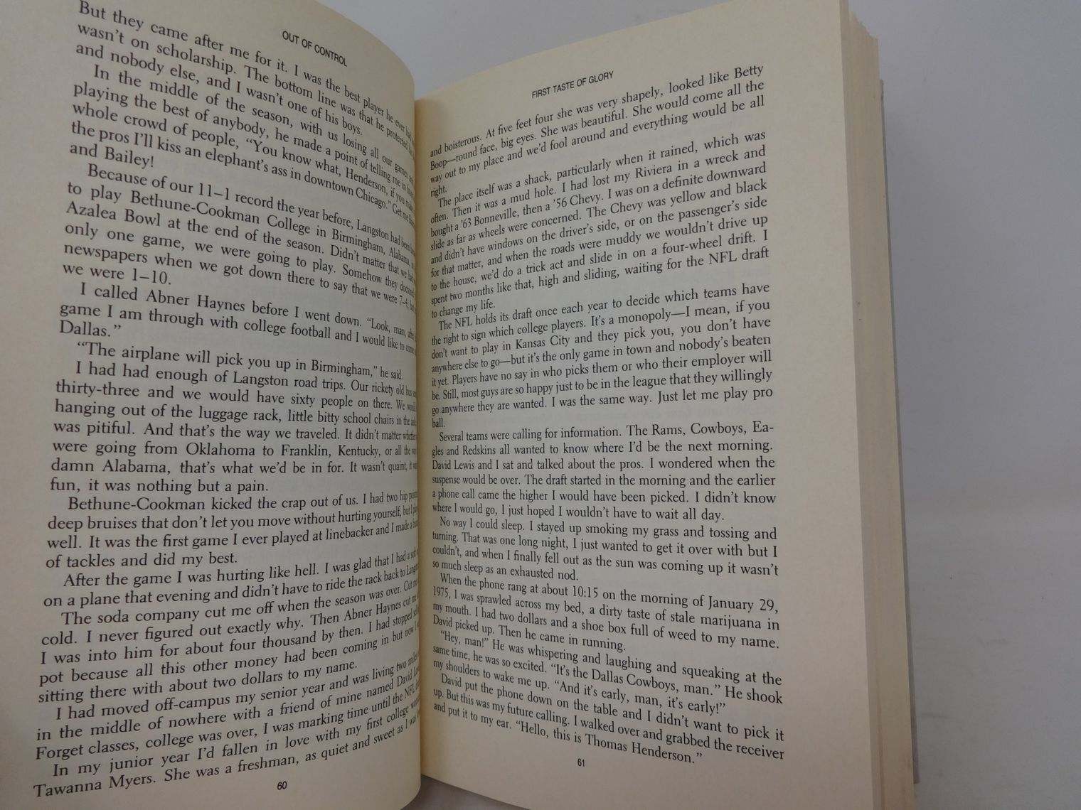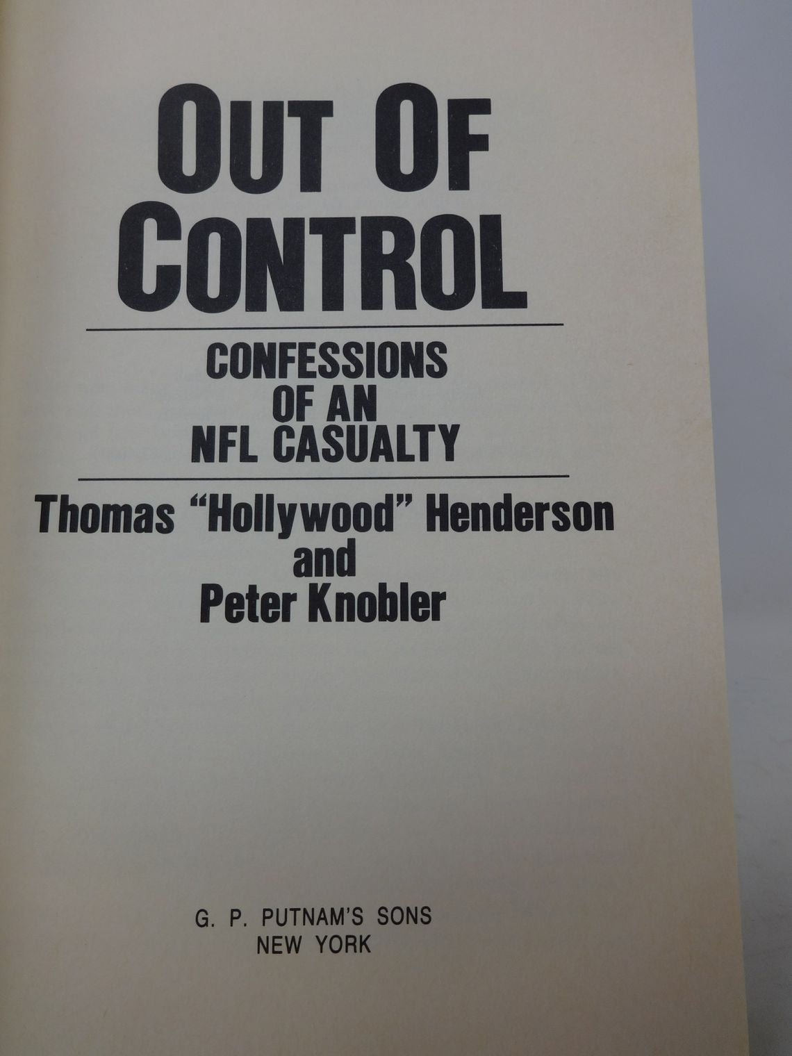 Out of Control, Confessions of a NFL Casualty, by Thomas Henderson and Peter Knobler. (1987) 304 page hardback in fair used condition.