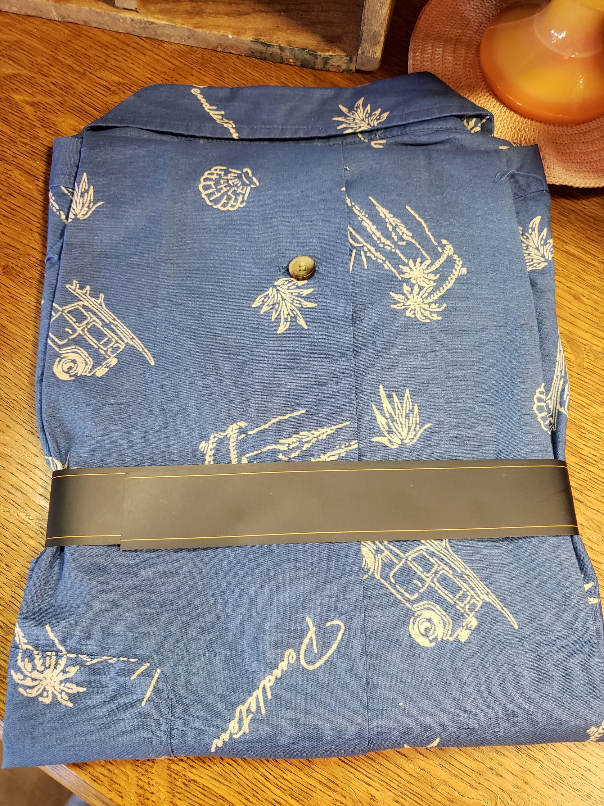 Men's shirt is 100% cotton, machine washable, in a summer fun print. This shirt comes packaged for gift giving. Great light weight vacation shirt with palm trees, beach buggies, surfboards, seashells and the Pendleton logo.