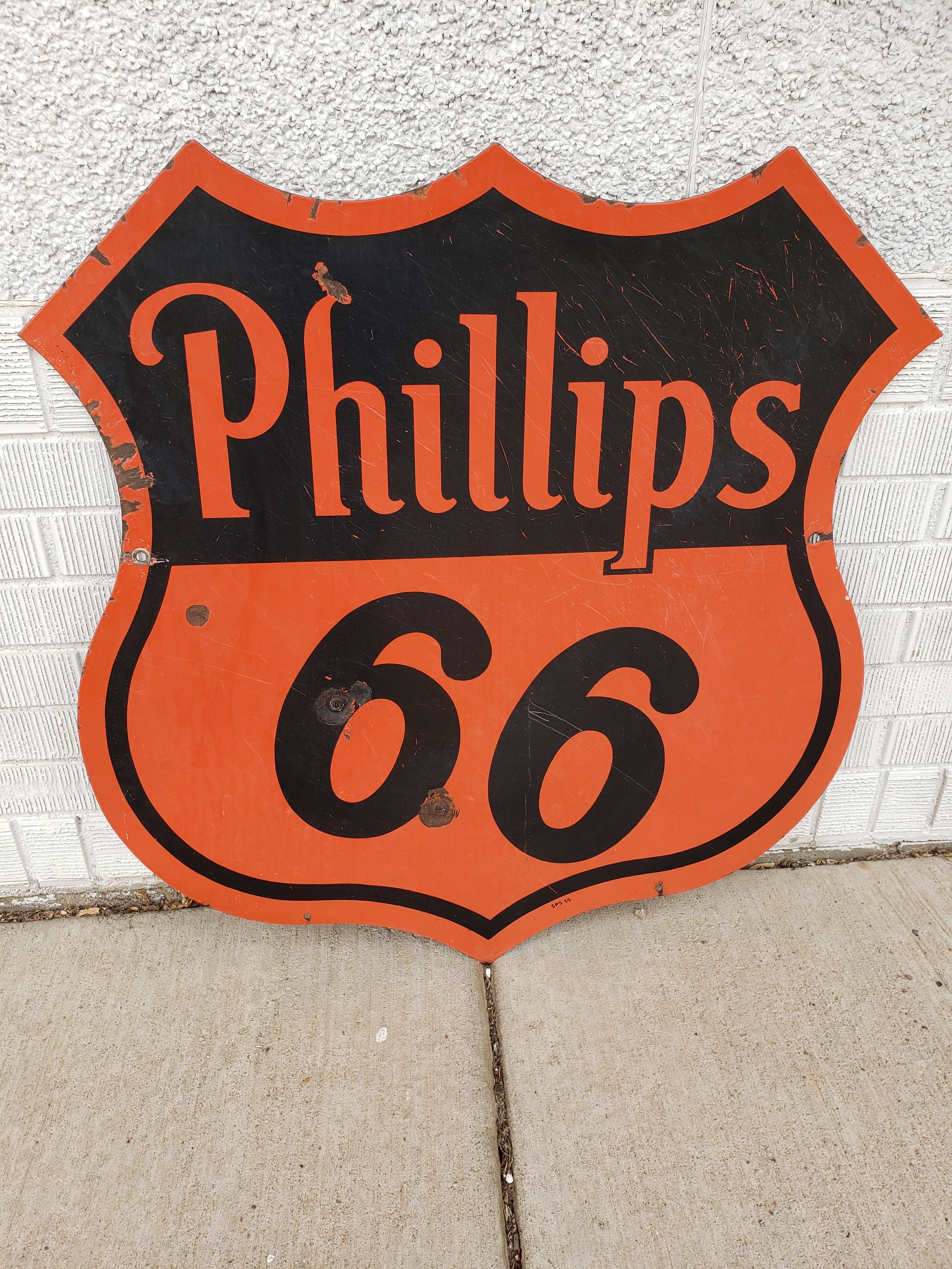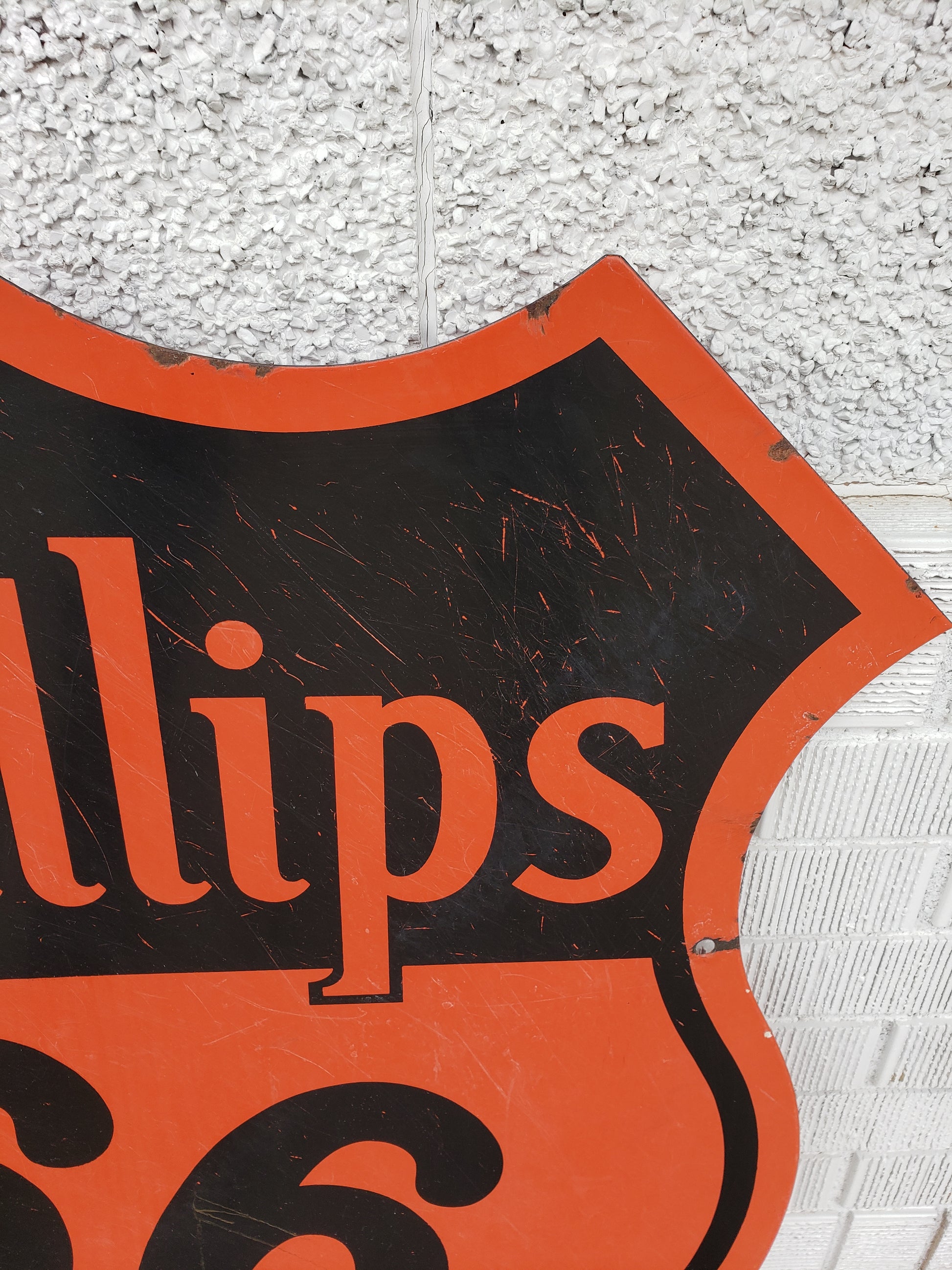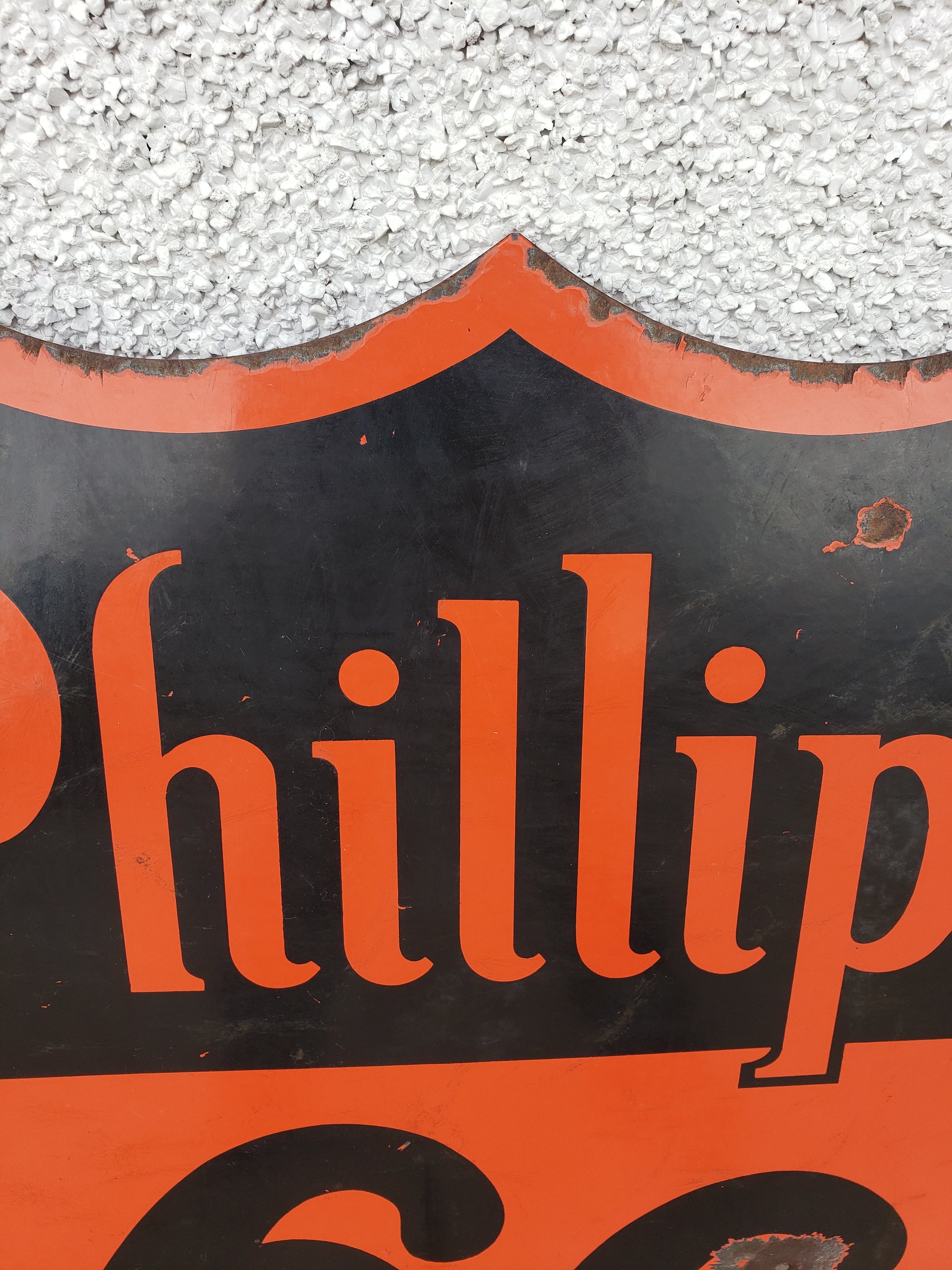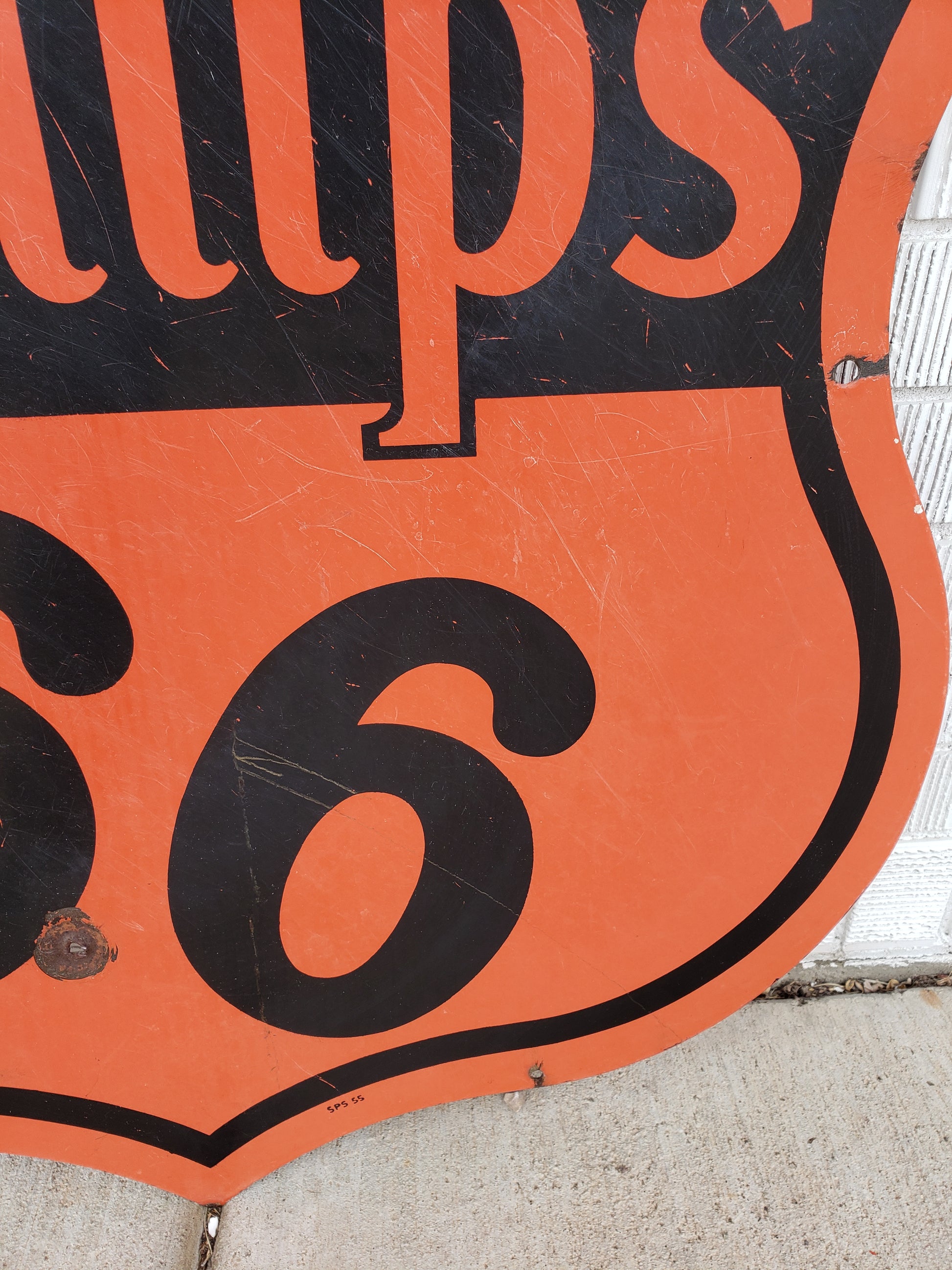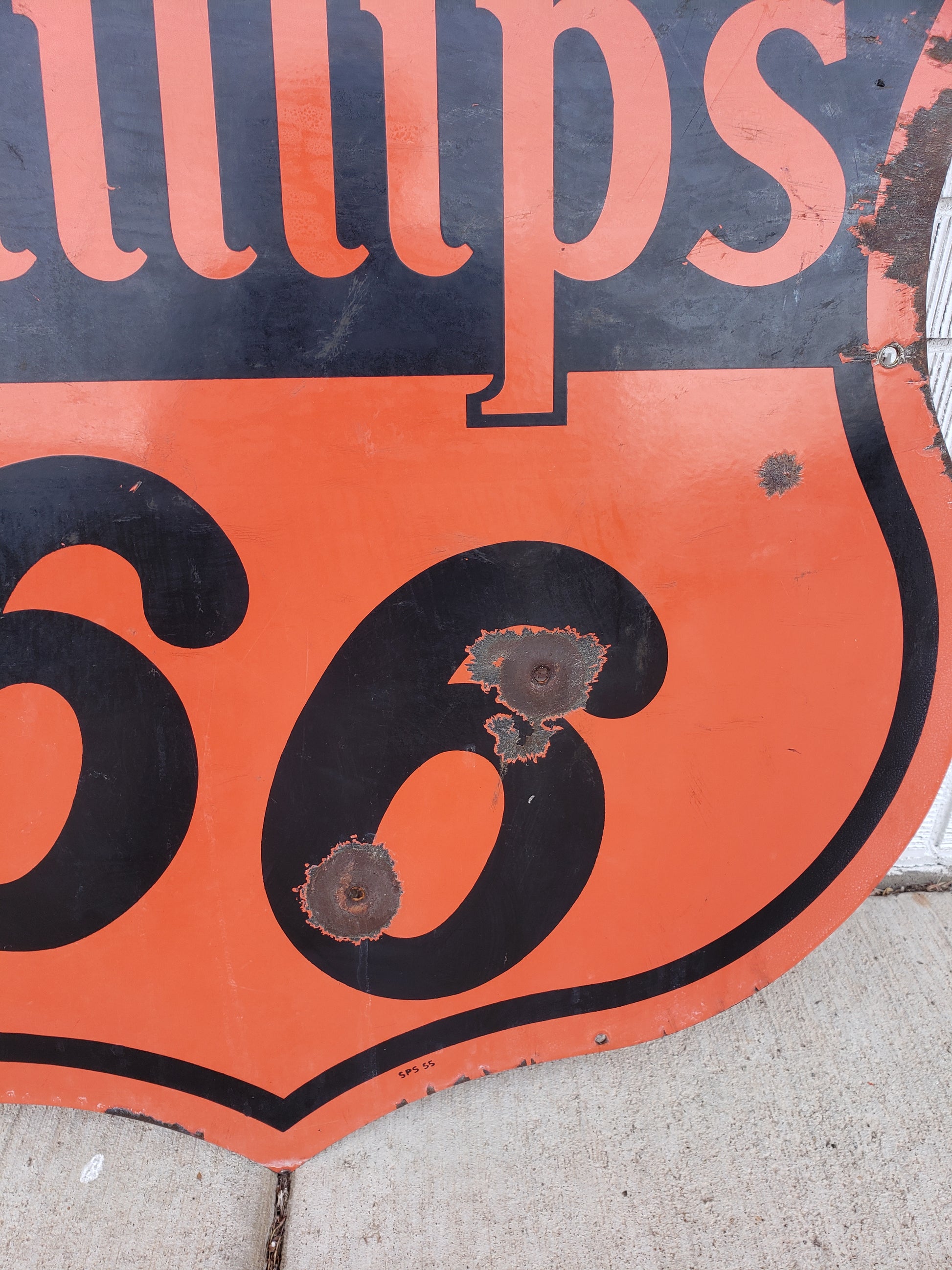 This is an Original vintage porcelain sign from 1955, advertising Phillips 66. It is 30 inches tall and 29.5 inches wide. It has a couple of bullet holes and a few scuffs as well as dings in the porcelain on the body and the edges. This is a survivor, ready to find a new home and bring back fond memories of full service gas stations and cool cars. The orange color is an eye catcher, sure to brighten up your decor. On the bottom of the shield is painted SPS 55 denoting the year it was made.