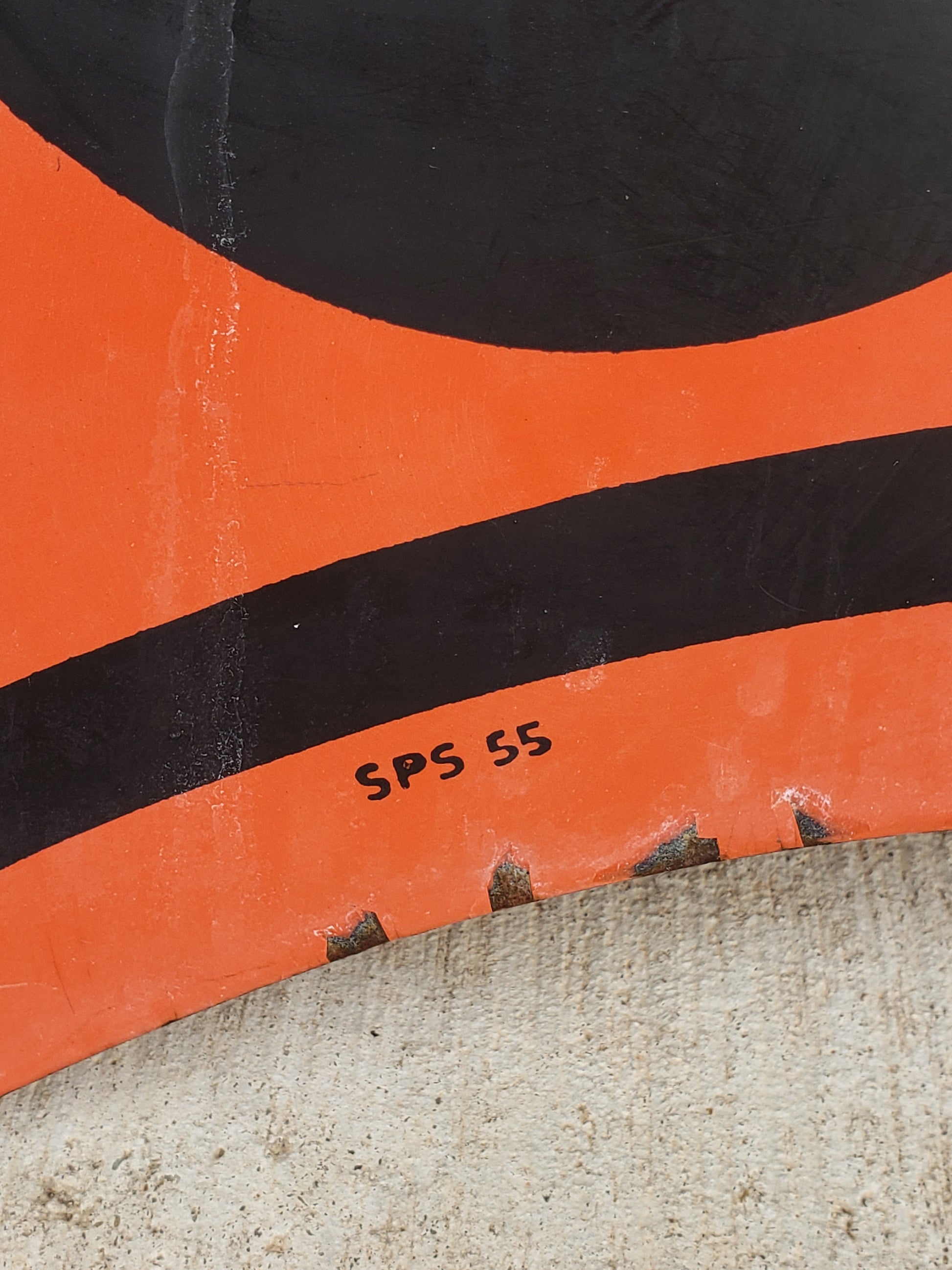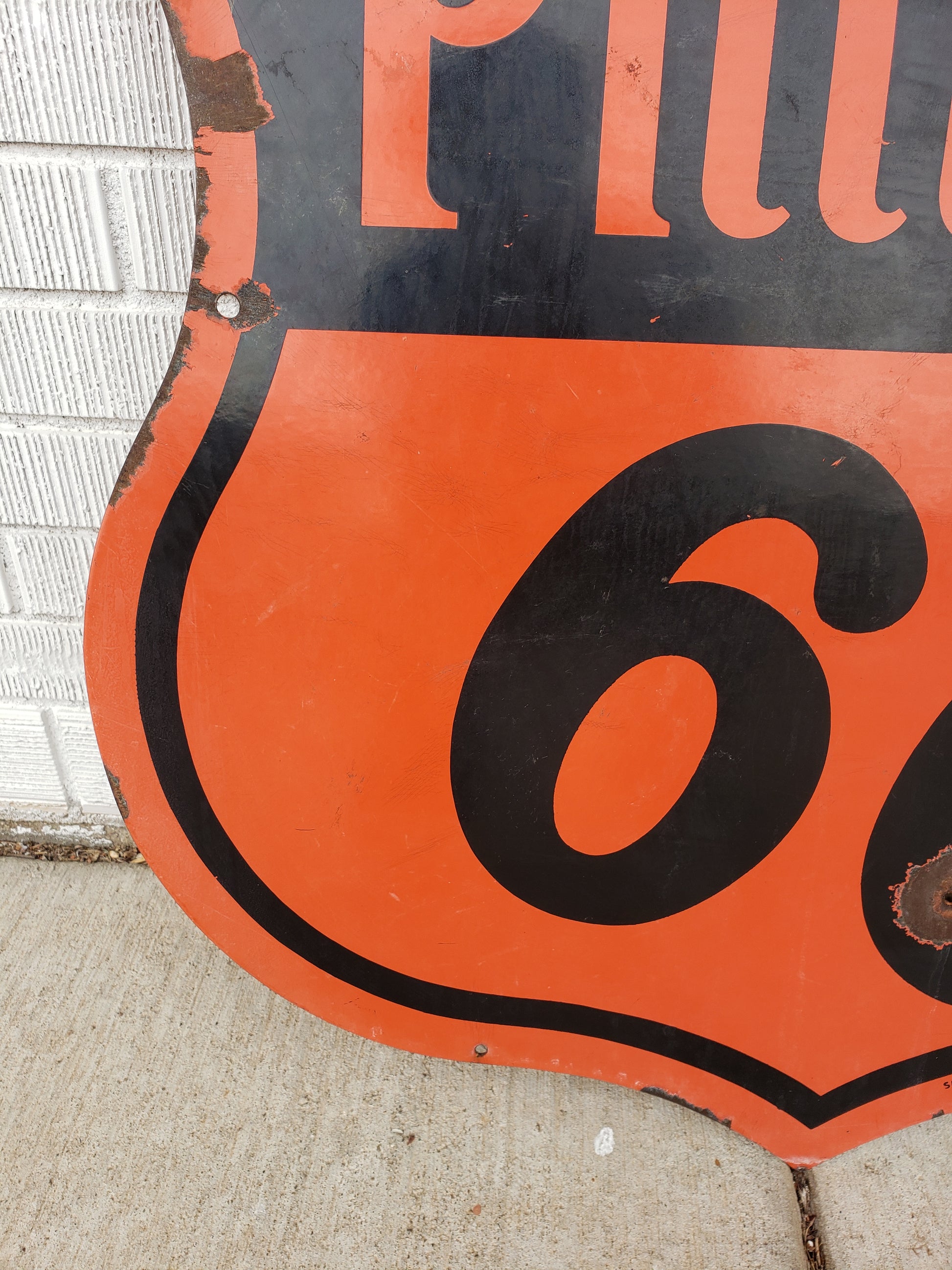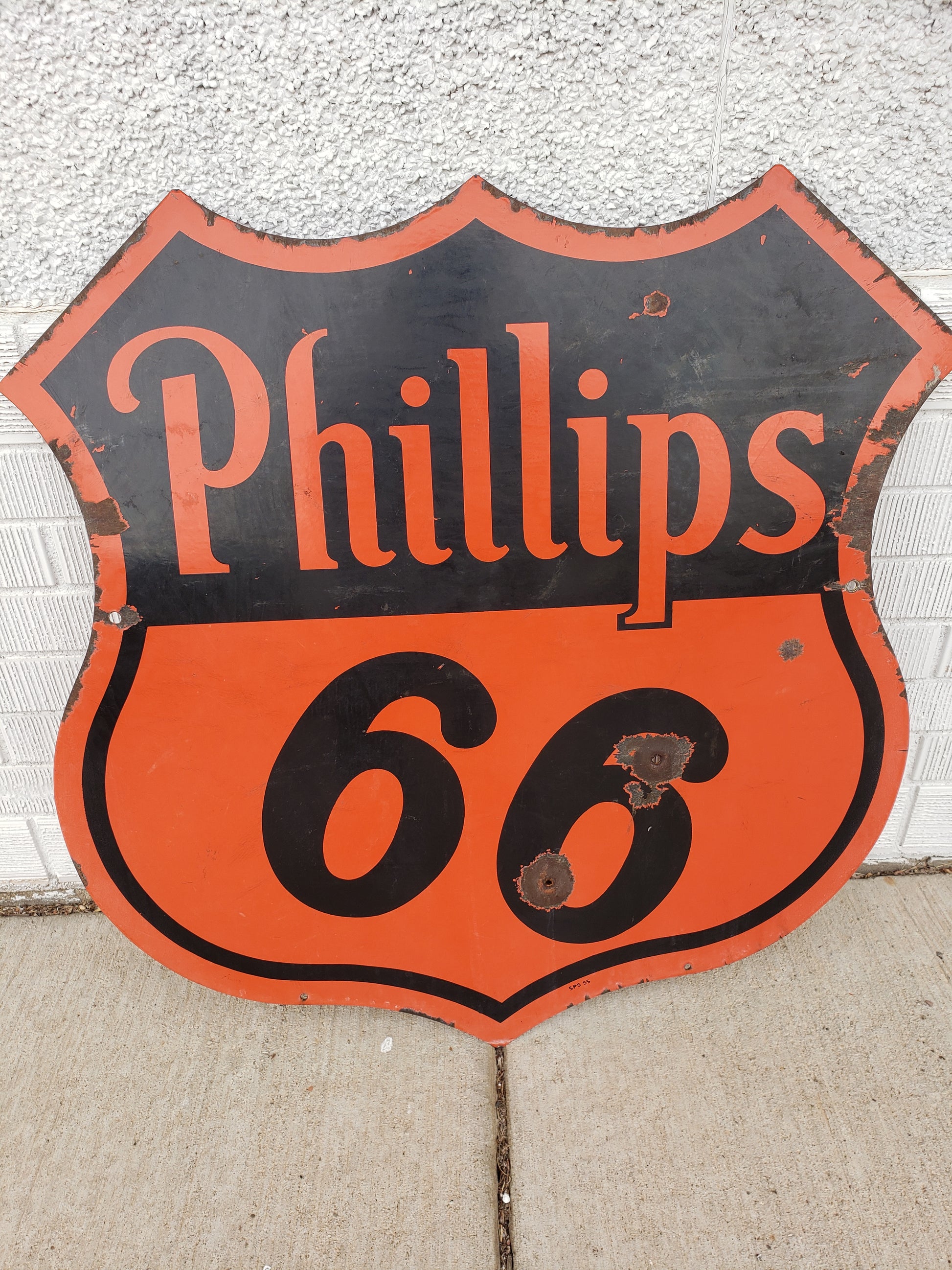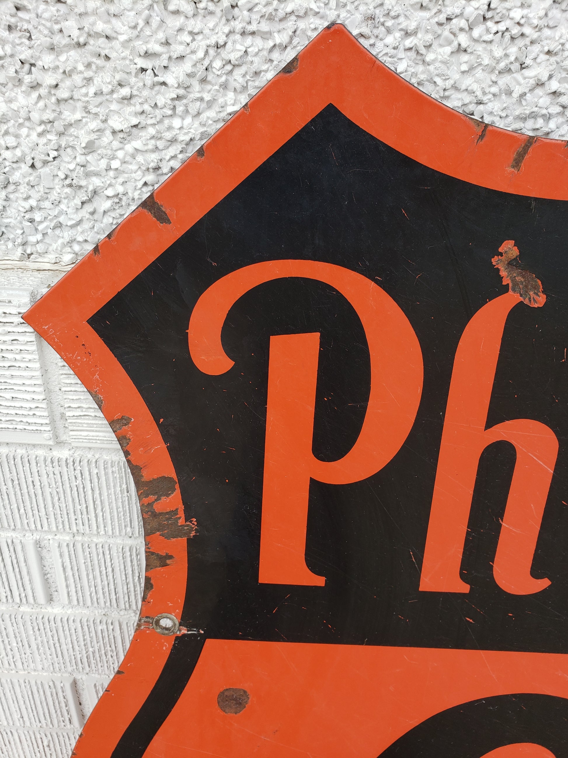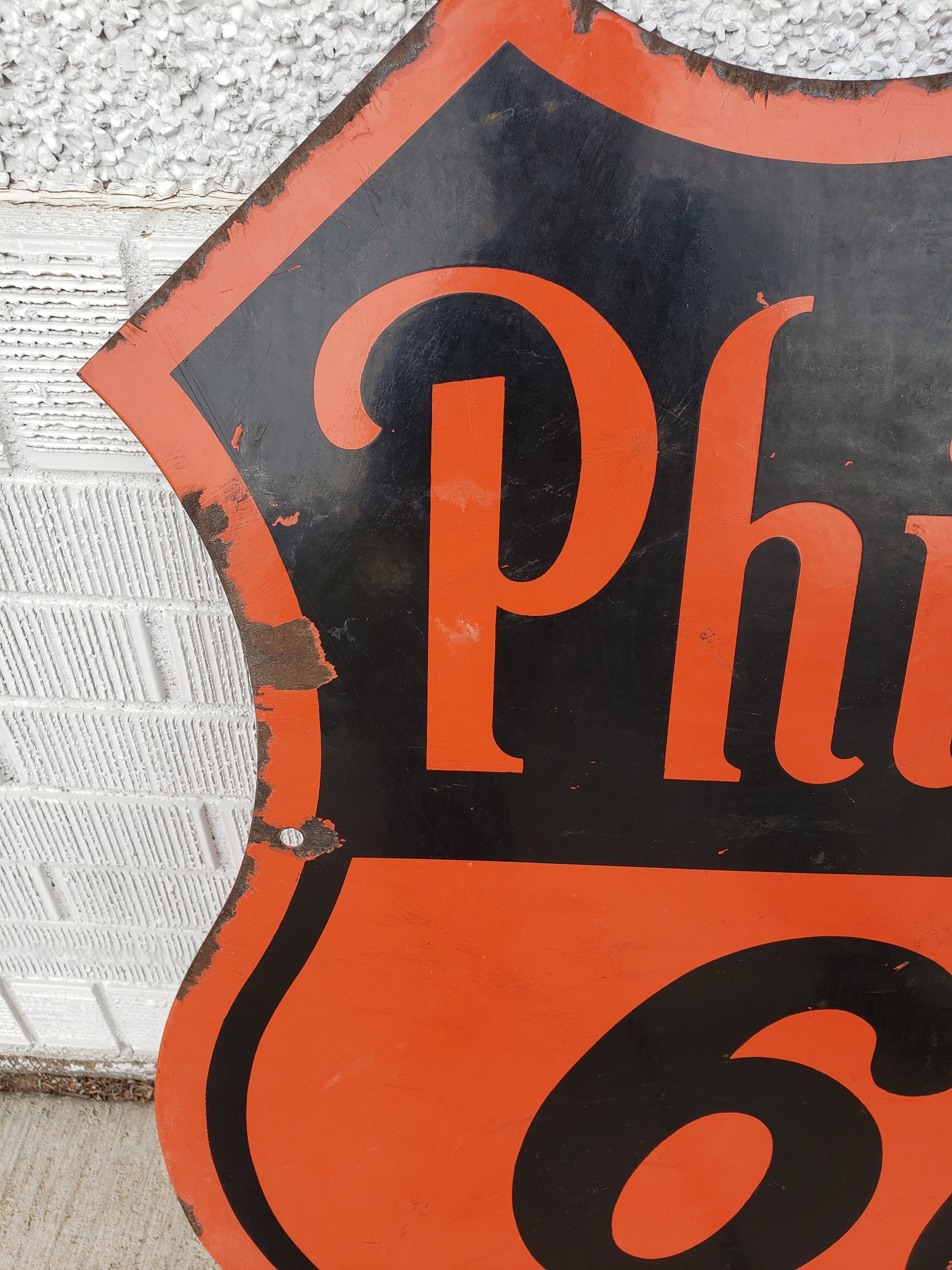 This is an Original vintage porcelain sign from 1955, advertising Phillips 66. It is 30 inches tall and 29.5 inches wide. It has a couple of bullet holes and a few scuffs as well as dings in the porcelain on the body and the edges. This is a survivor, ready to find a new home and bring back fond memories of full service gas stations and cool cars. The orange color is an eye catcher, sure to brighten up your decor. On the bottom of the shield is painted SPS 55 denoting the year it was made.