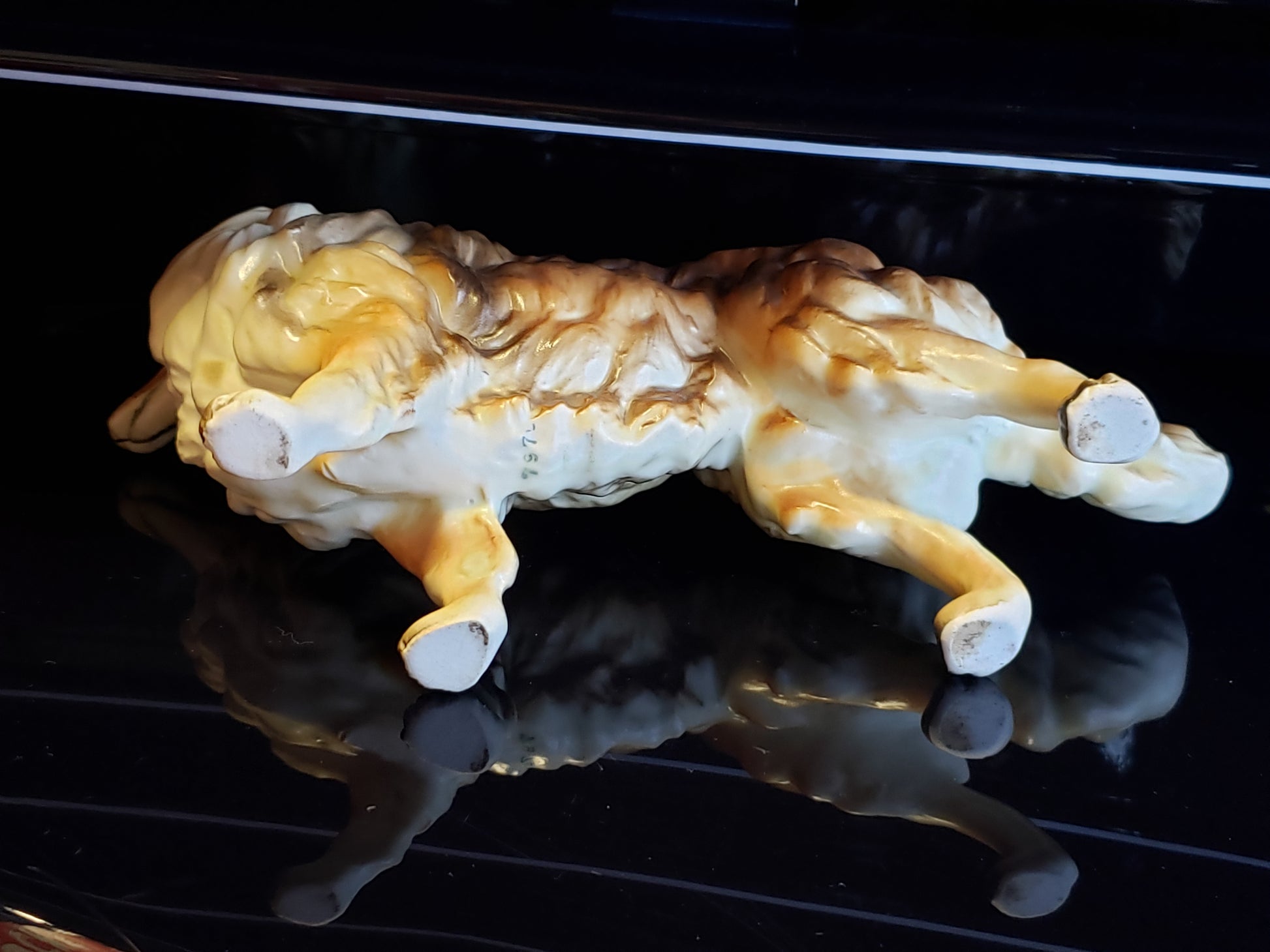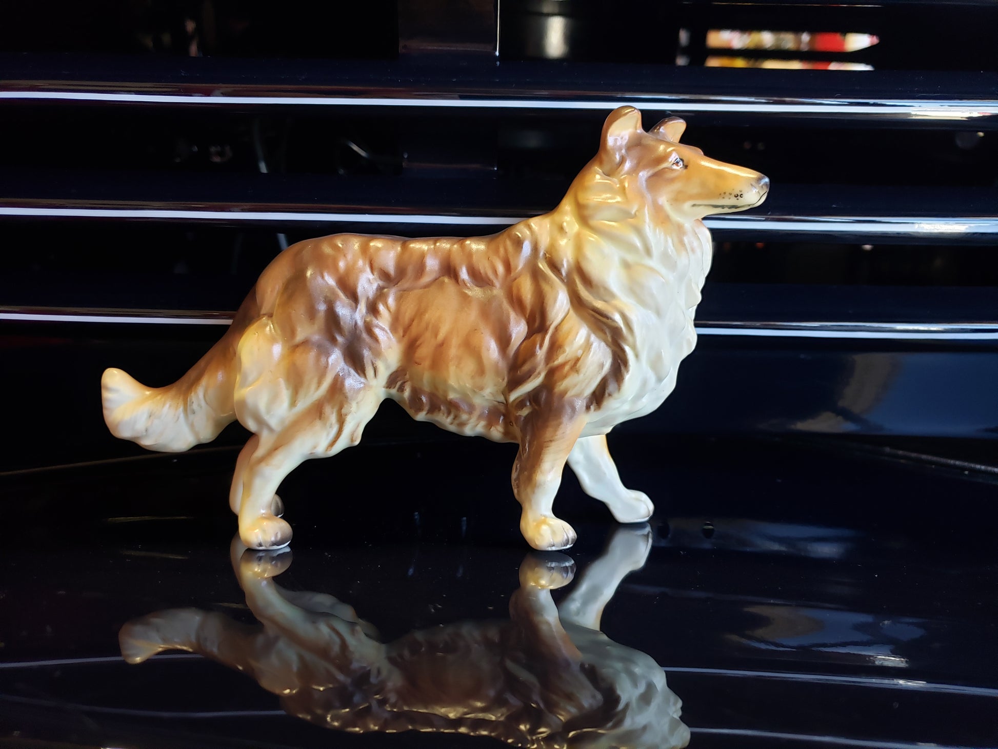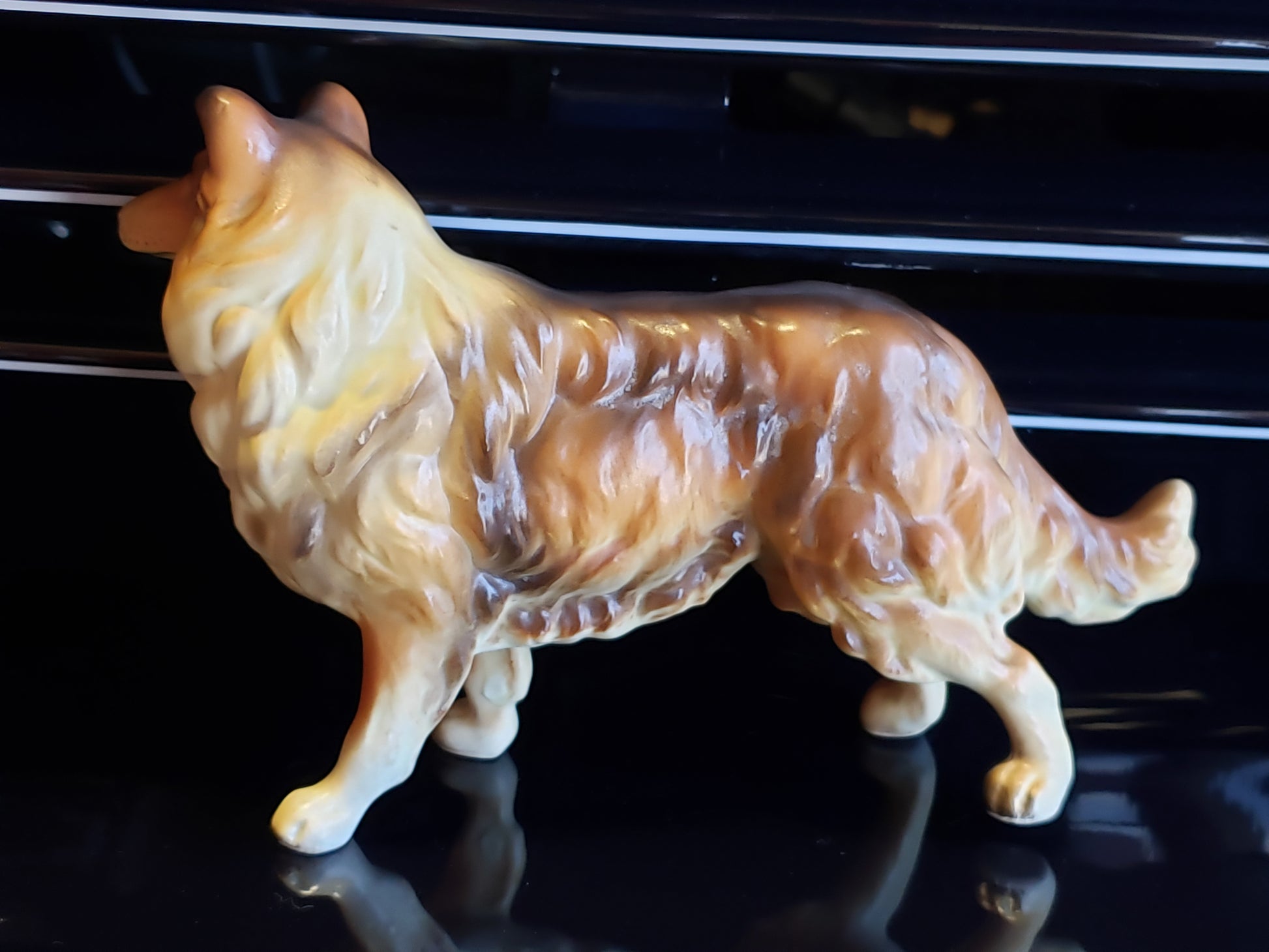 Unleash your love for unique home decor with this vintage porcelain collie figurine. This playful pup will add a touch of whimsy to any room, making it a perfect addition to your collection. So why fetch for a basic figurine when you can have this charming collie? This highly detailed collie is 4.5 inches tall and 7 inches long. Fair vintage condition.