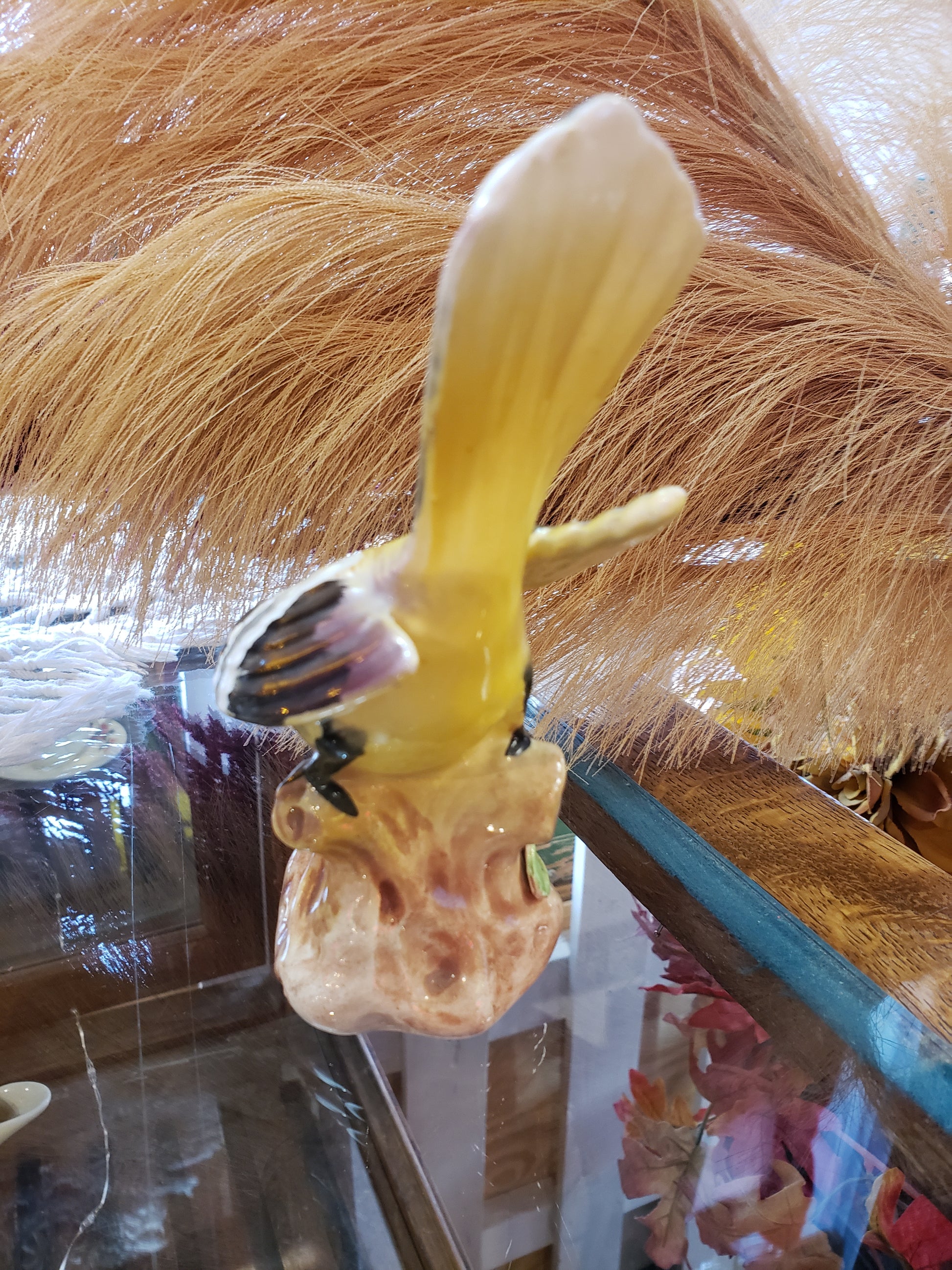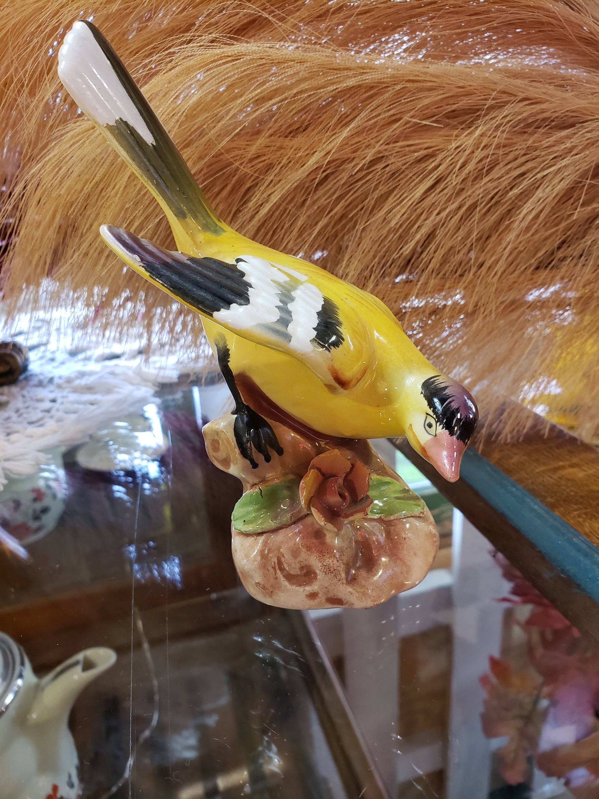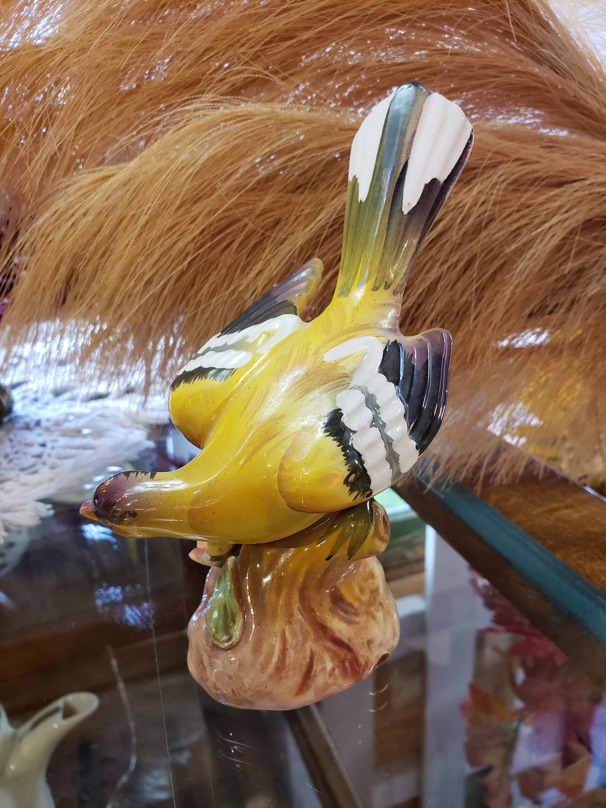 Vintage Gold Finch is porcelain, it is posed with it's tail in the air, showcasing the beautiful white stripes on its' wings and tail. It is perched on a tree branch with a lovely pink flower. No maker's marks, a nice glossy finish. A pretty piece in fair vintage condition.