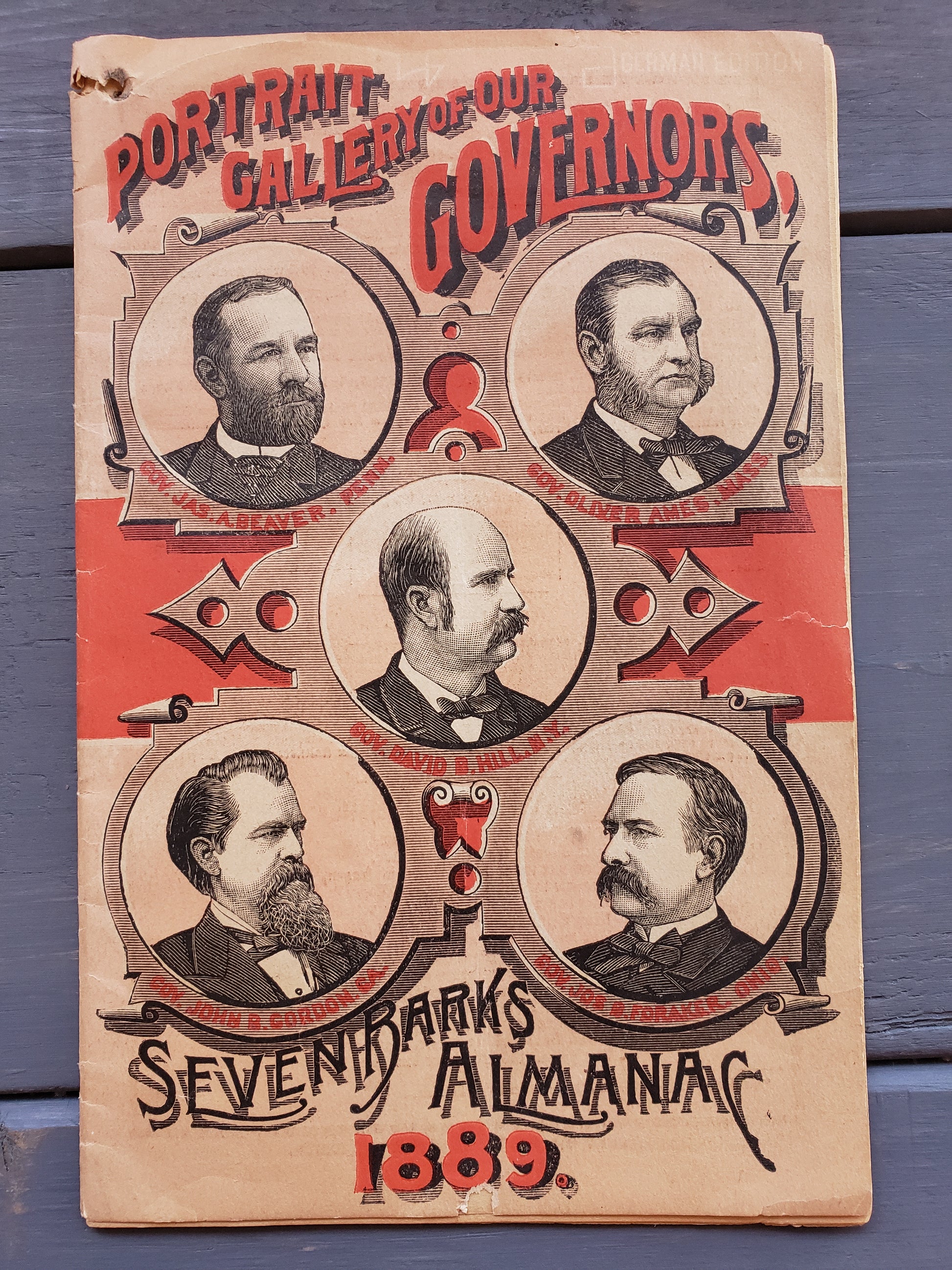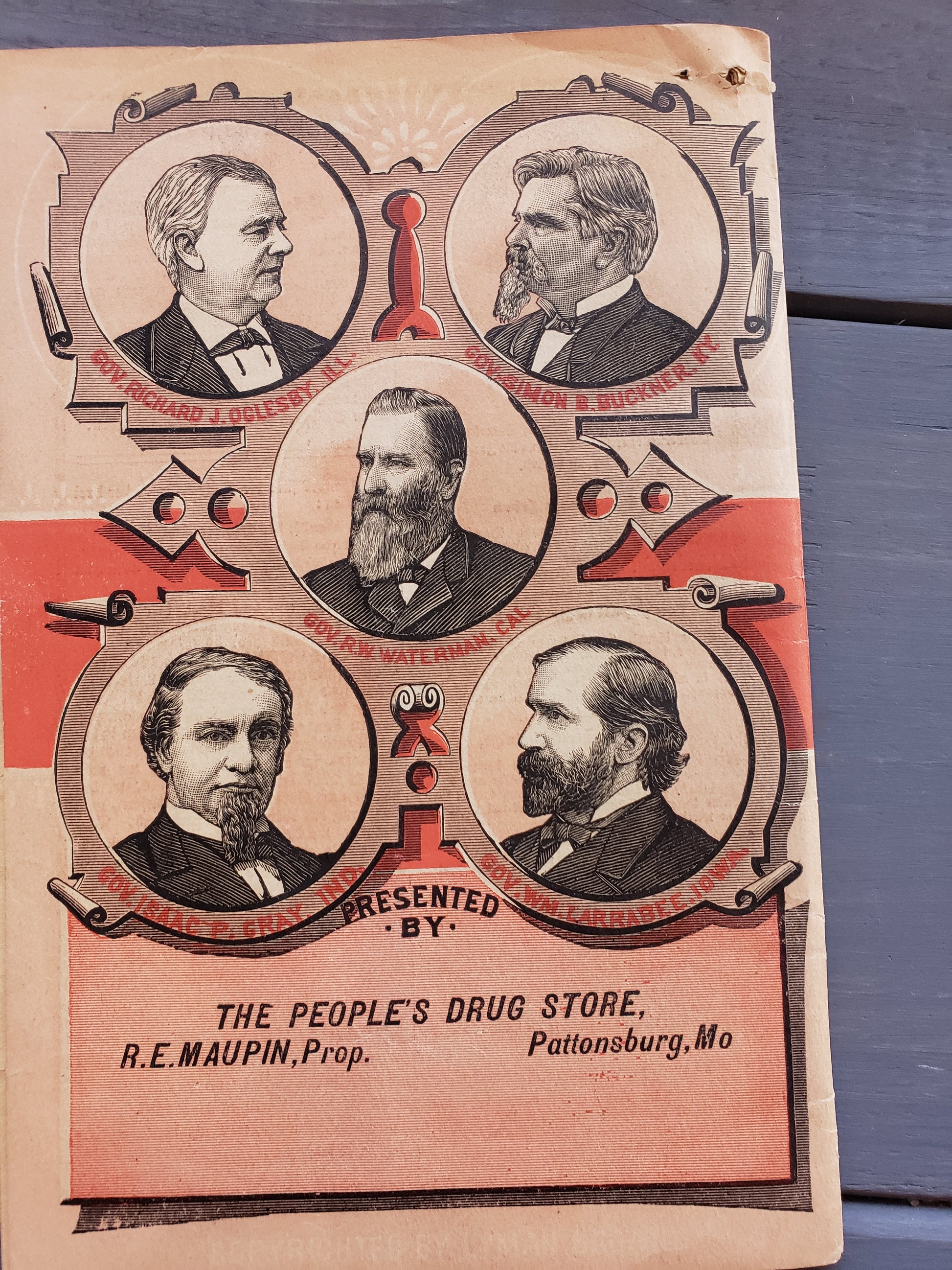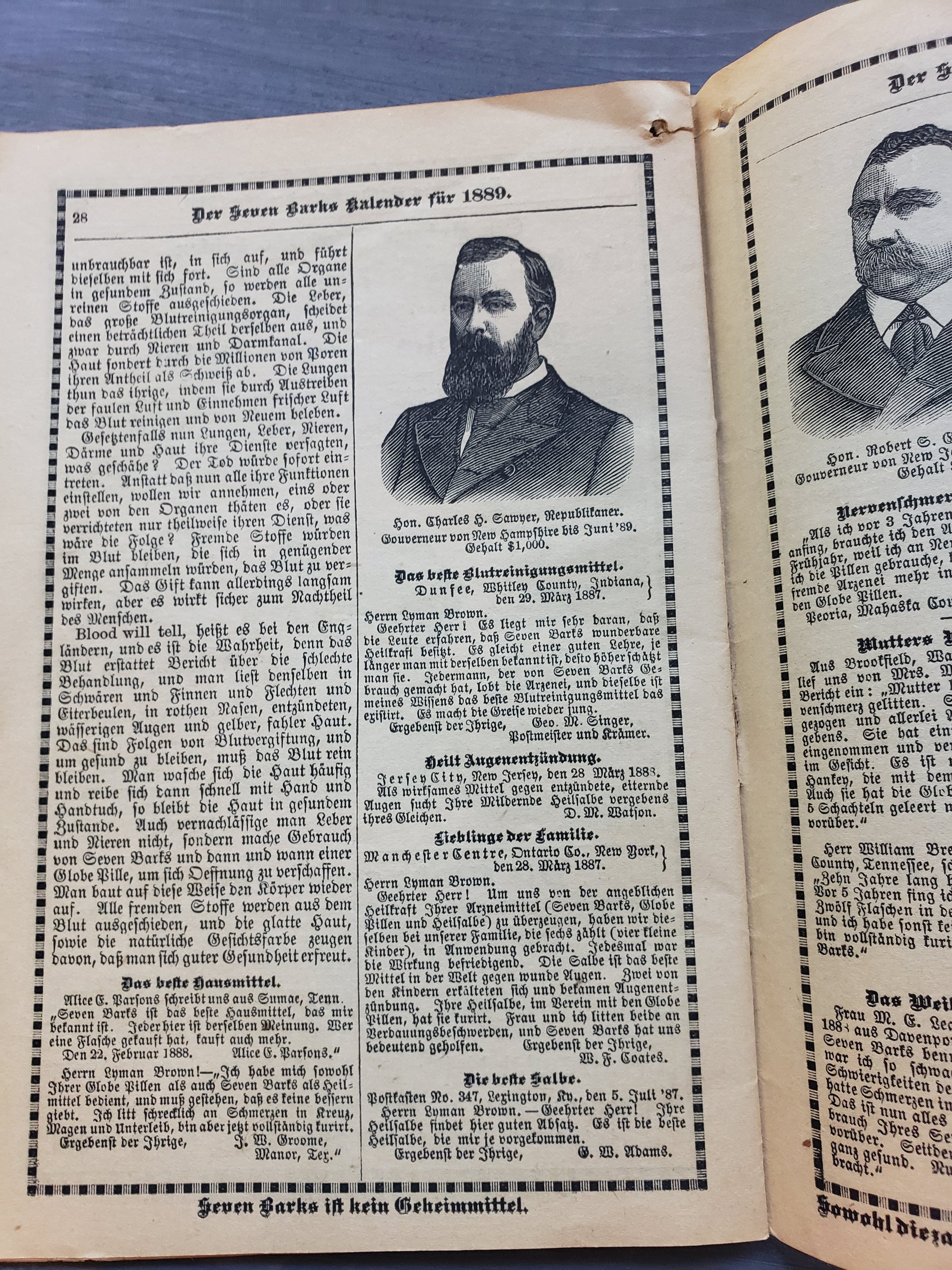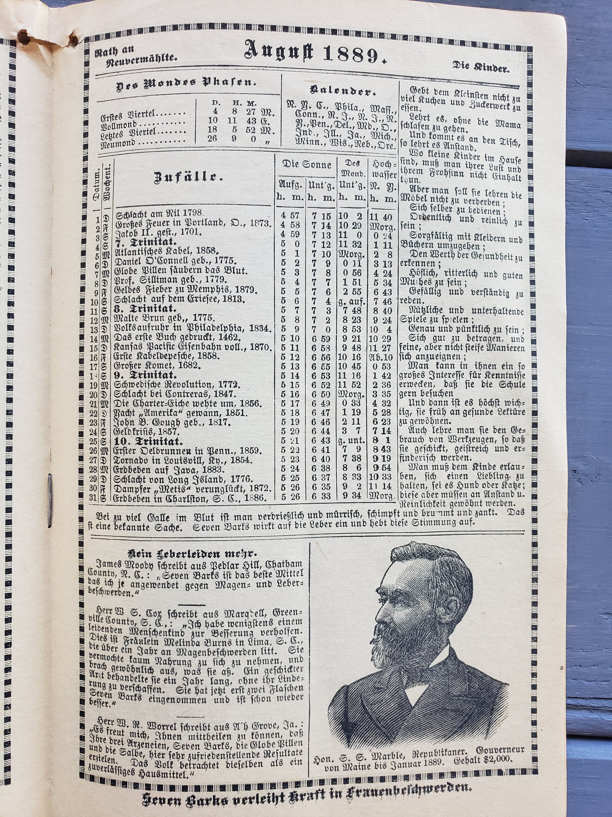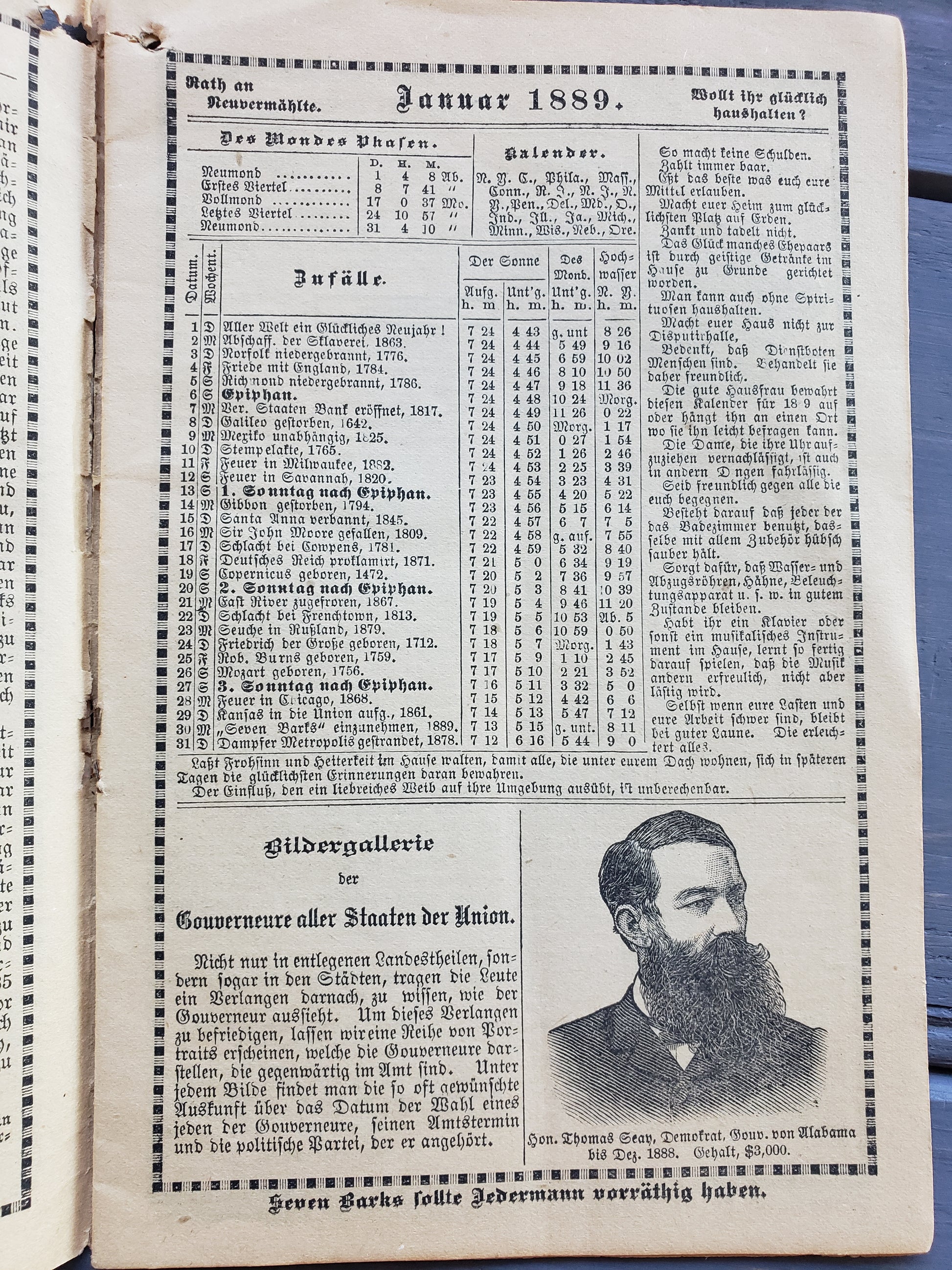 Seven Barks Almanac 1889, presented by the People's Drug Store, R. E. Maupin, Proprieter, Pattonsburg, MO. This almanac is written in German with black and white illustrations. It is worn in the center but quite readable. An interesting piece of history in fair vintage condition.