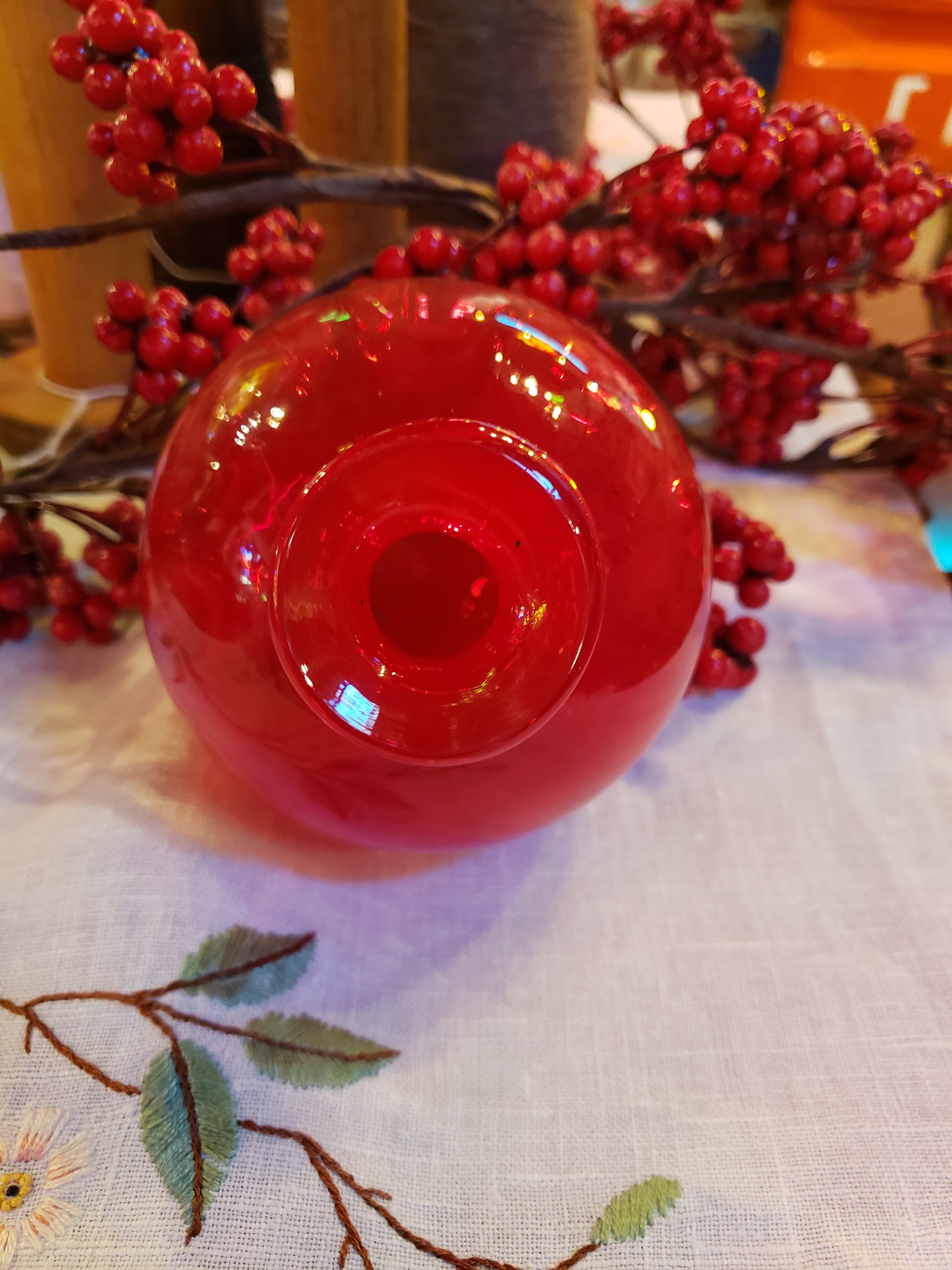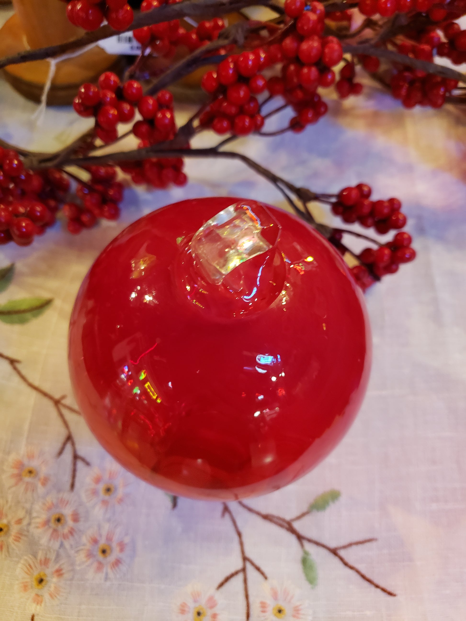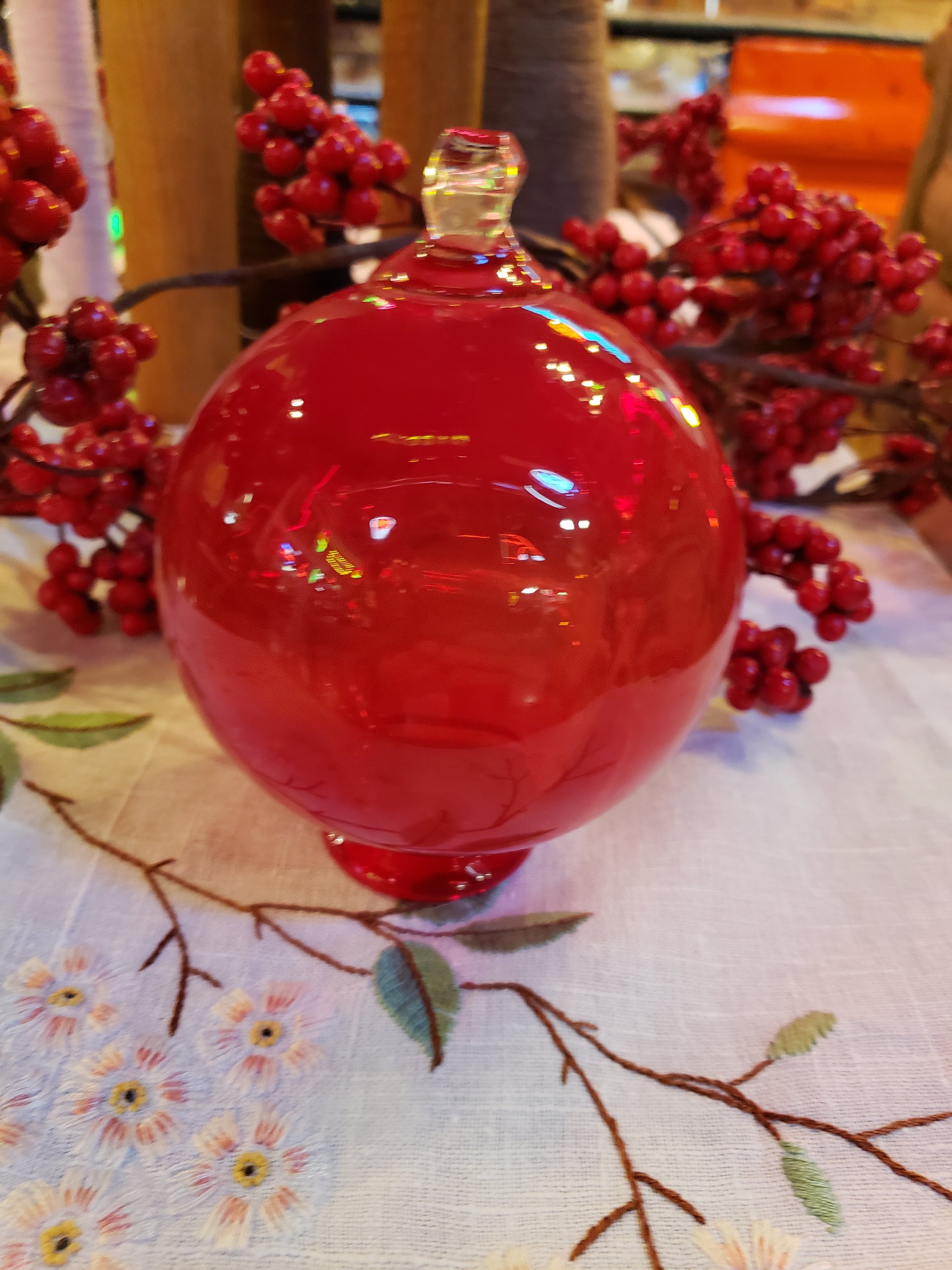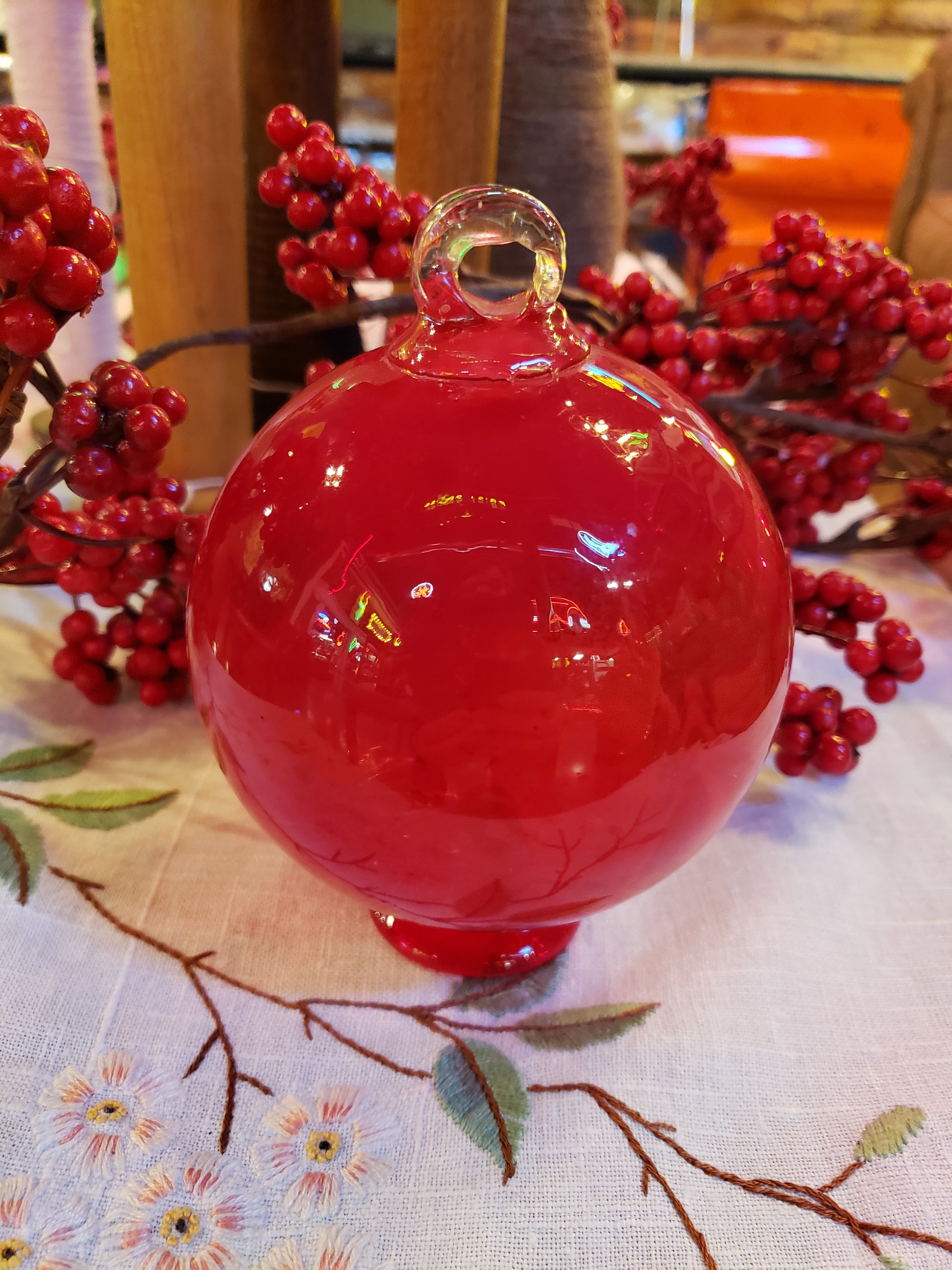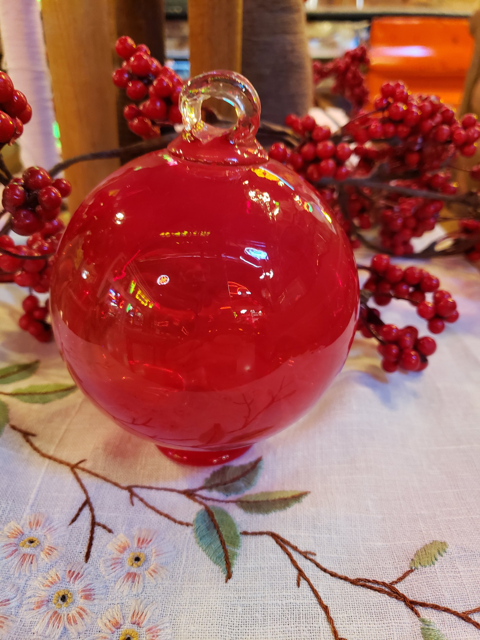 1950's era hand blown glass ornament. It has a pedestal base so you can use it in an arrangement or hang it up. It measures 3.5 inches across. It is in fair vintage condition. When you hold it up to the light, the inside appears to be ribbed and gives an orangeish glow.