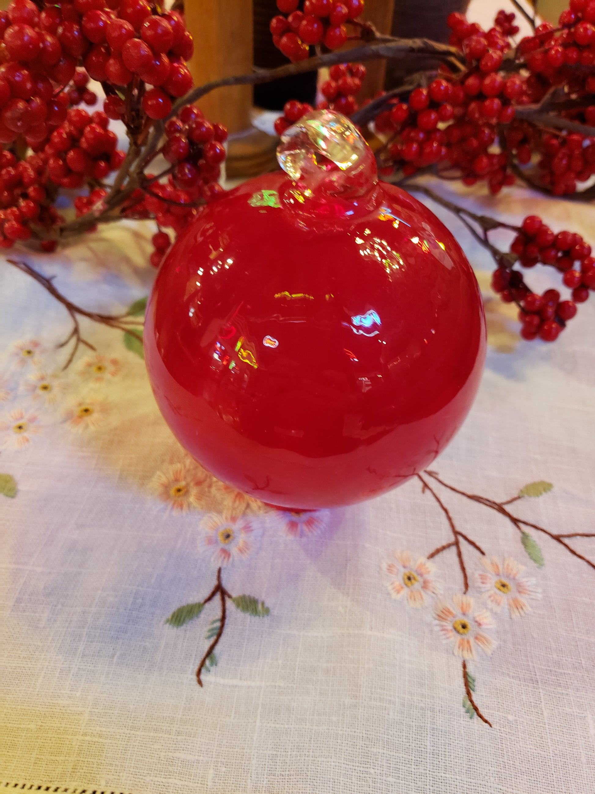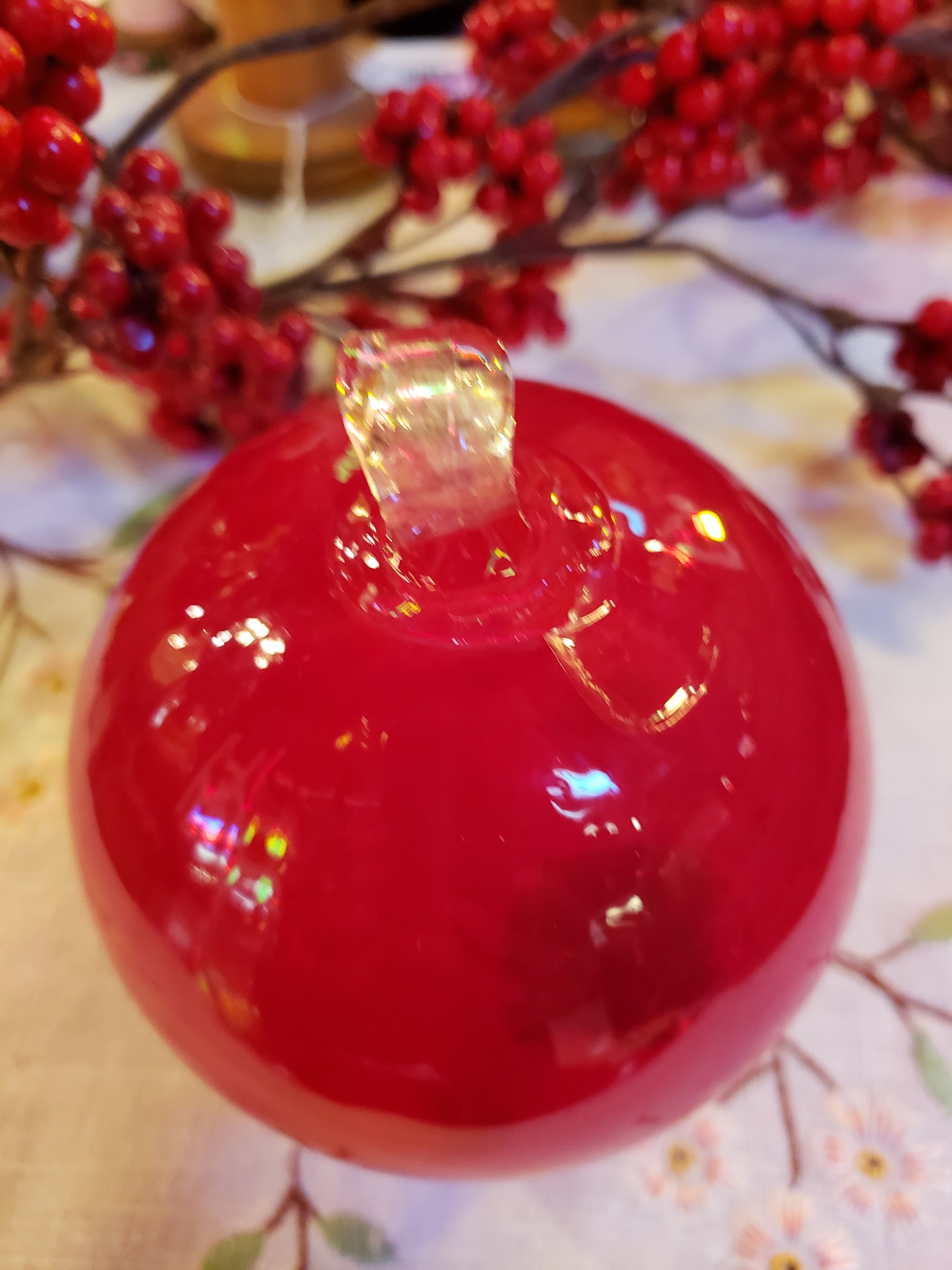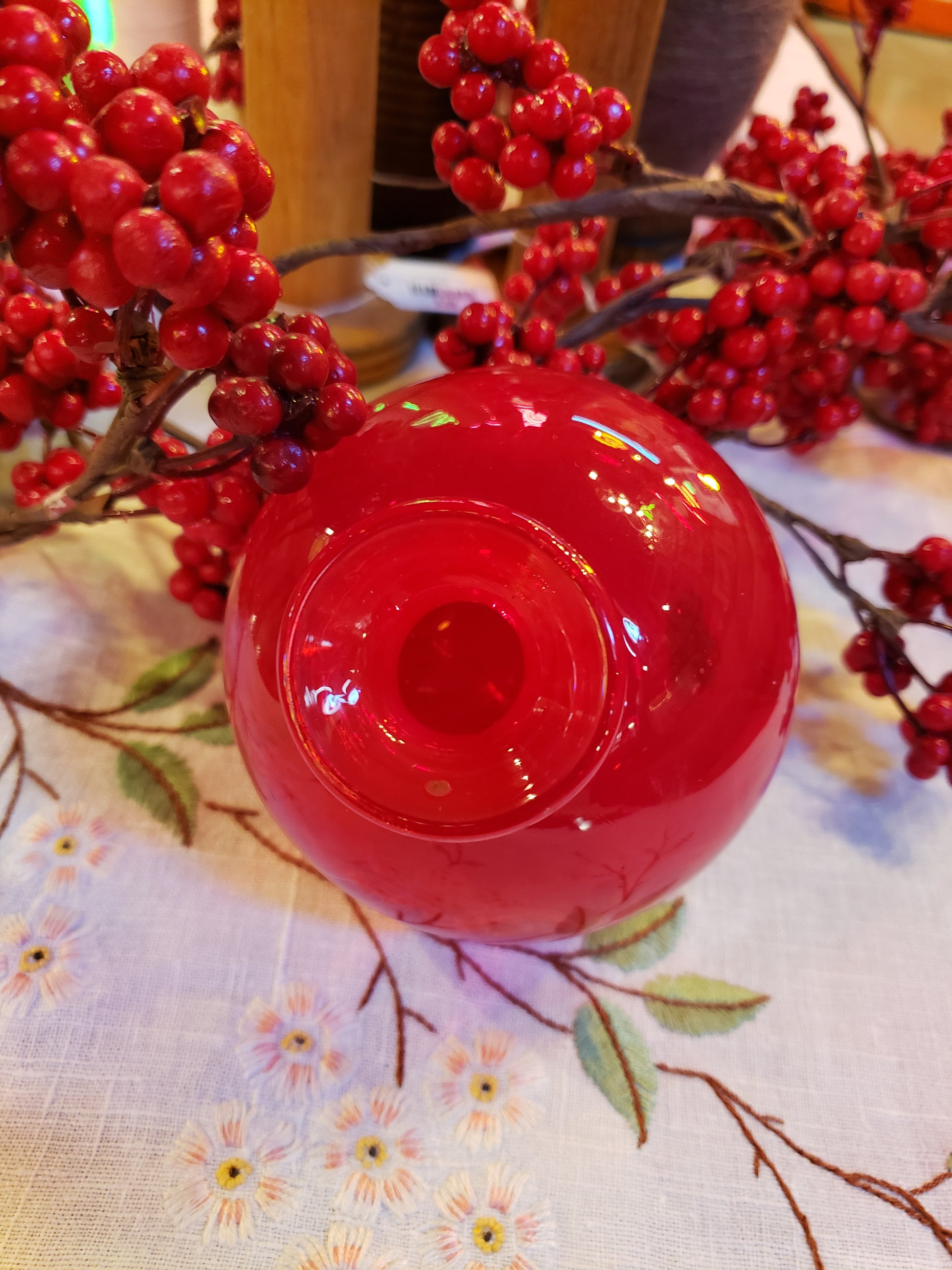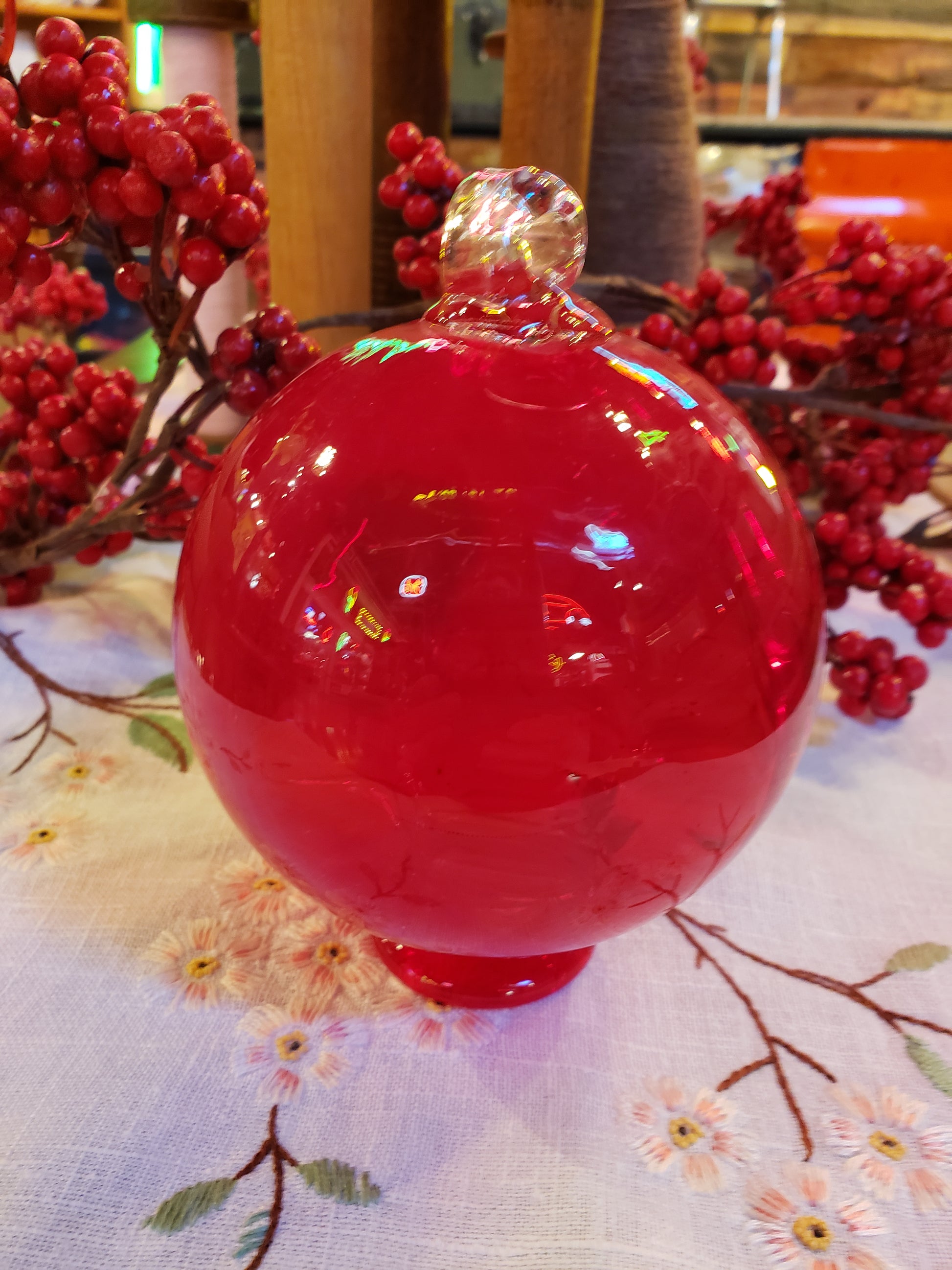 1950's era blown glass ornament with a pedestal base so you may hang it up or display it in an arrangement. It does have a smooth chip in the ball by the tip, see photos. It measures 3.5 inches across and is in fair vintage condition. When held to the light, it has a ribbed appearance to the interior and a red orange glow.
