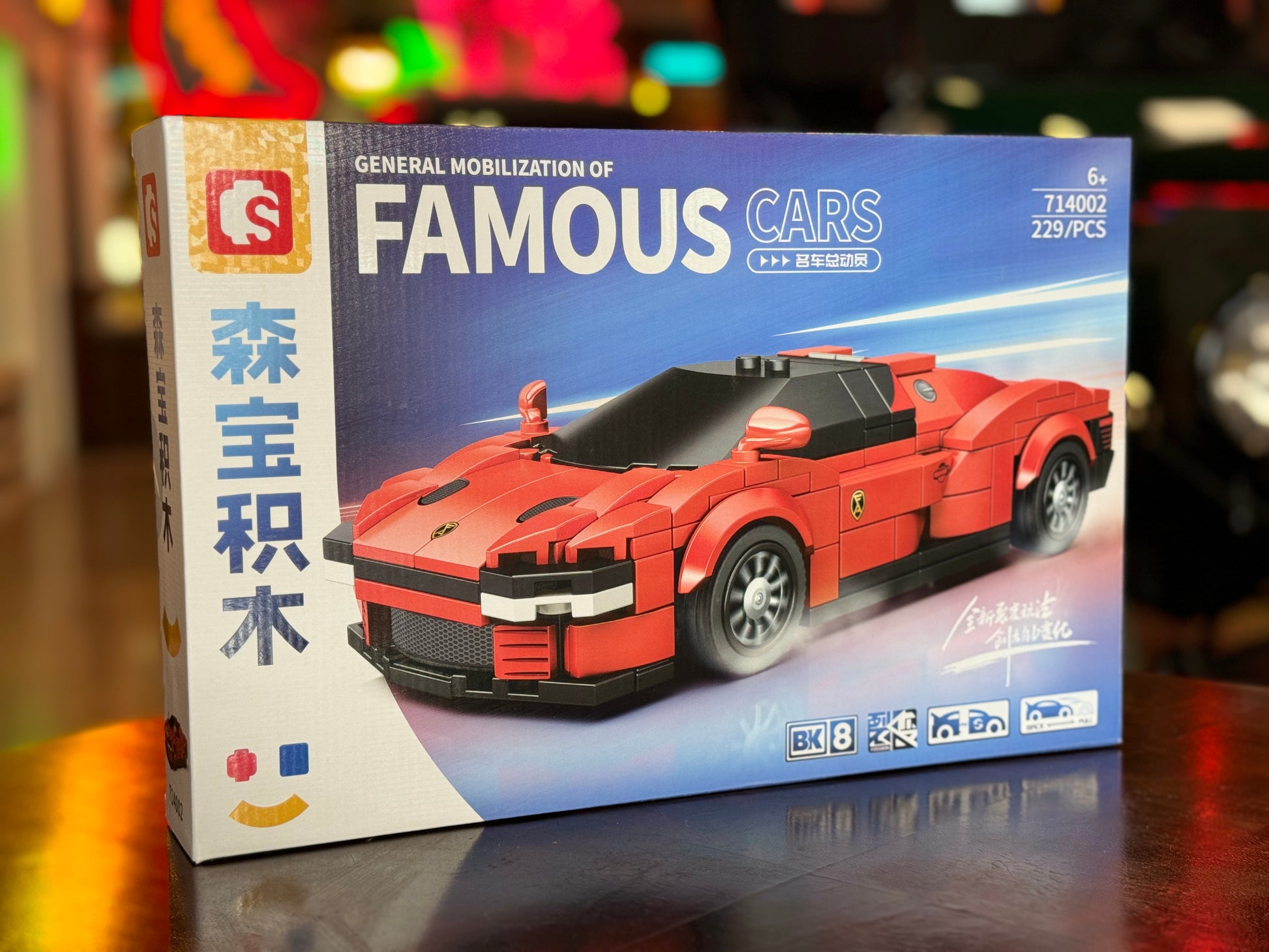 Red Supercar Building Blocks with built-in spring that launches the car when pulled back. Modeled after a Ferrari. One of 4 models we carry that can be interchanged with the others to create unique combinations. Sembo Blocks Famous Cars 714002 229pcs.
