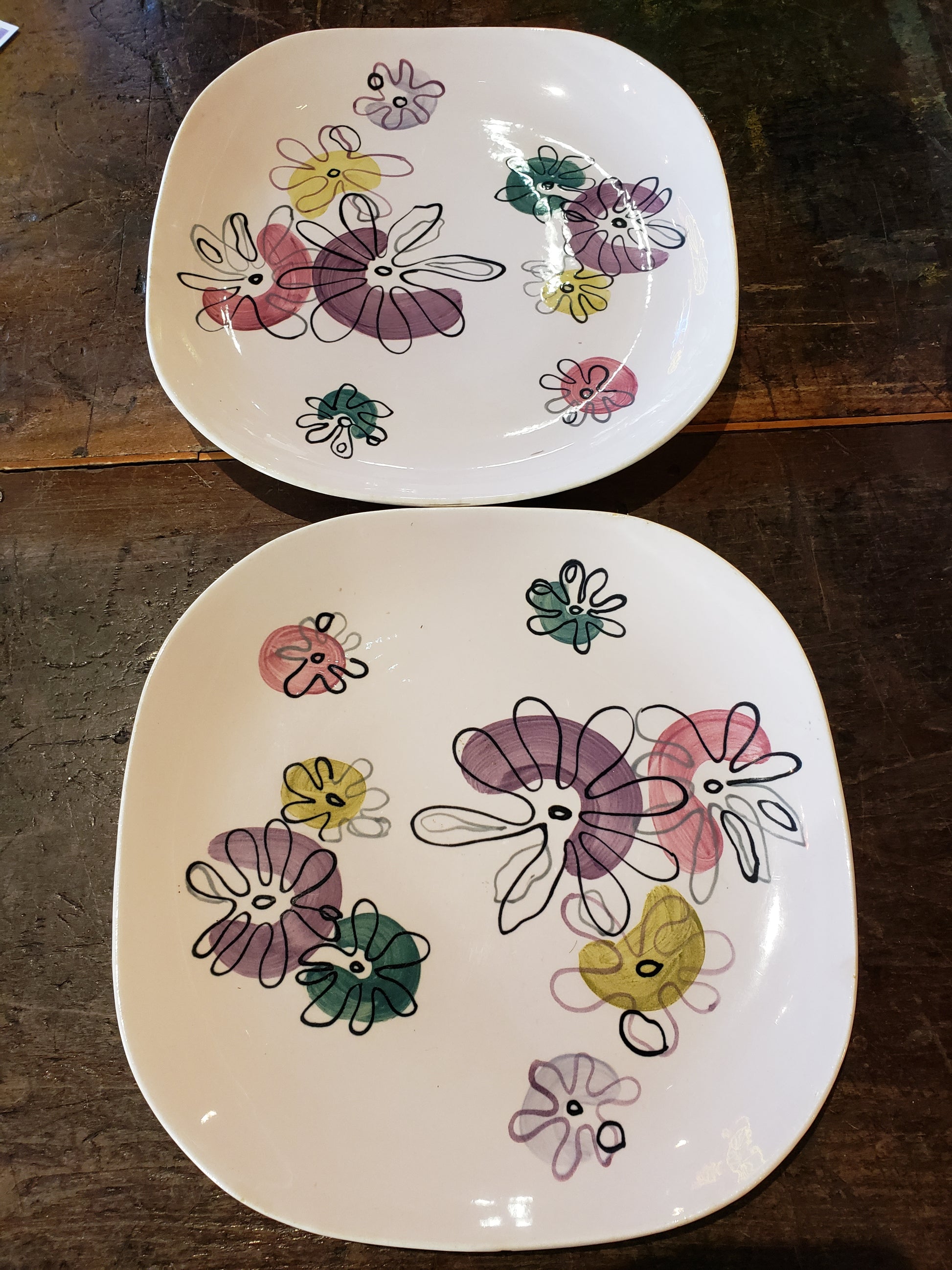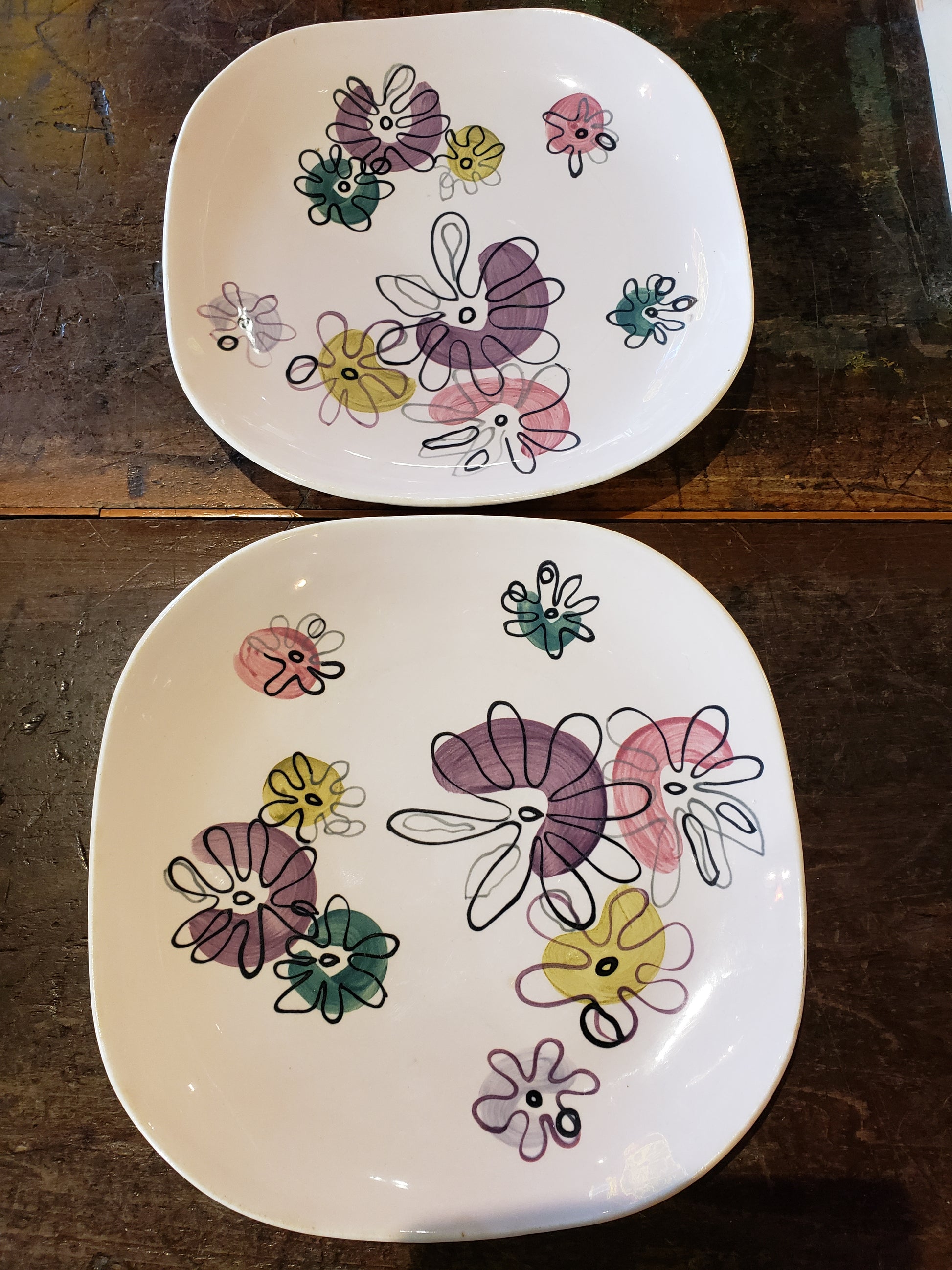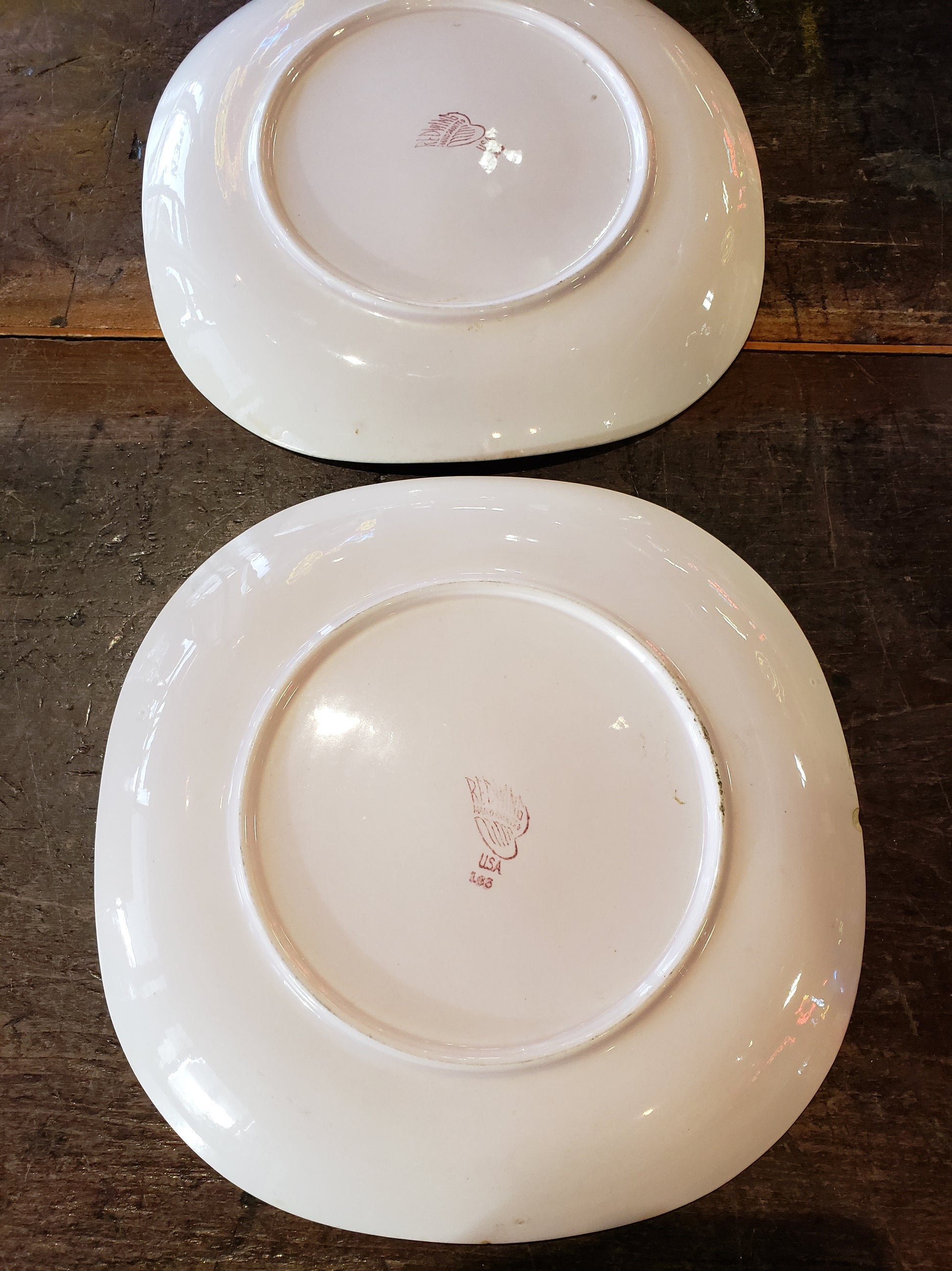 RARE Red Wing plates in the Fantasy pattern. Four 10.5 inch square plates with a fun floral pattern. These were part of the Concord line (1941). One of the plates has a few chips along the rim, the other three plates are chip free. See photos for details. They are stamped Red Wing 183 on the bottom of each plate. Fair vintage condition. RED TAG SALE!