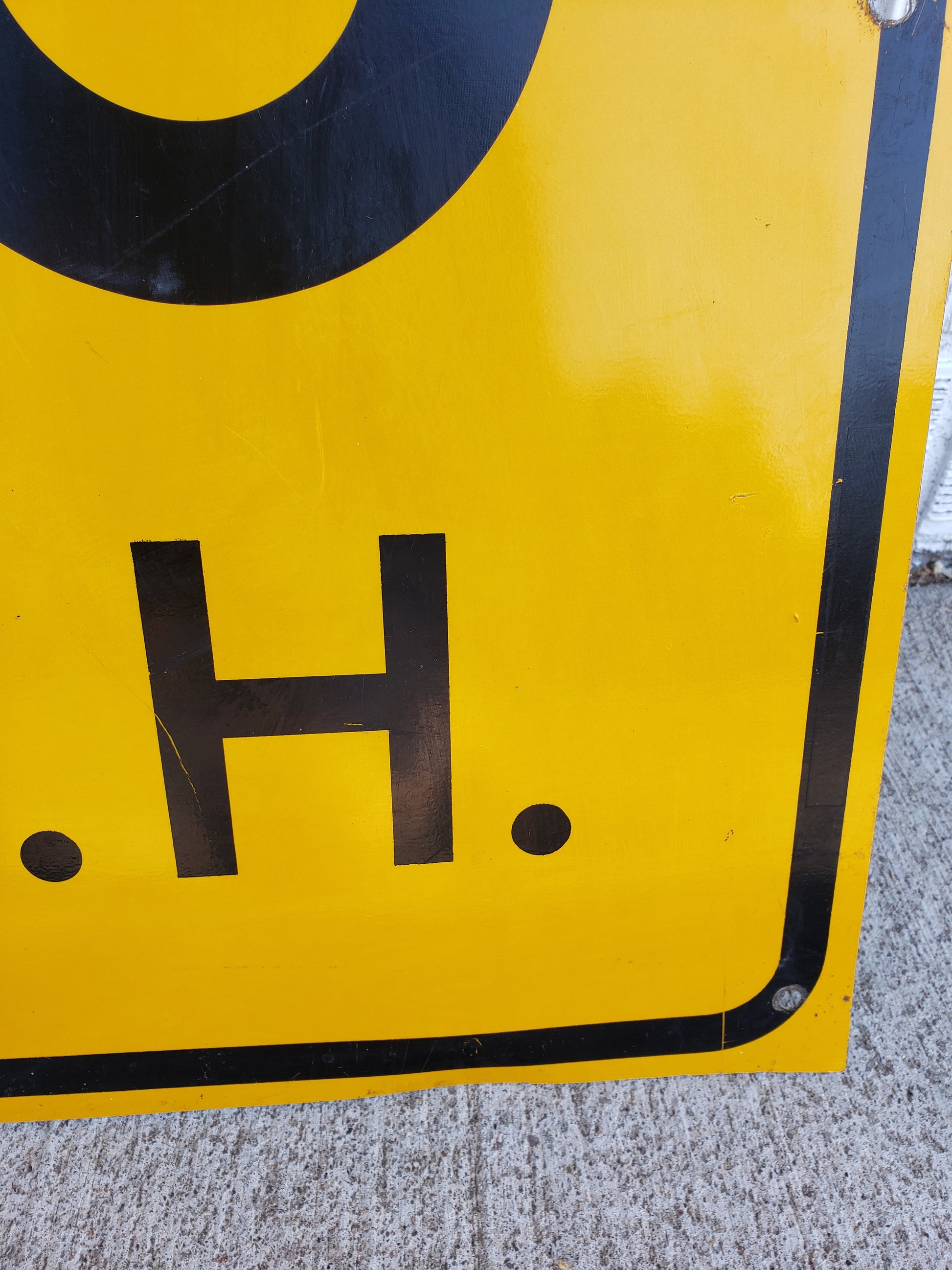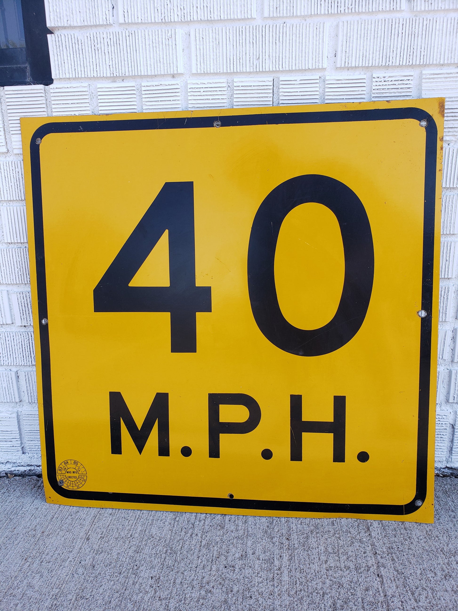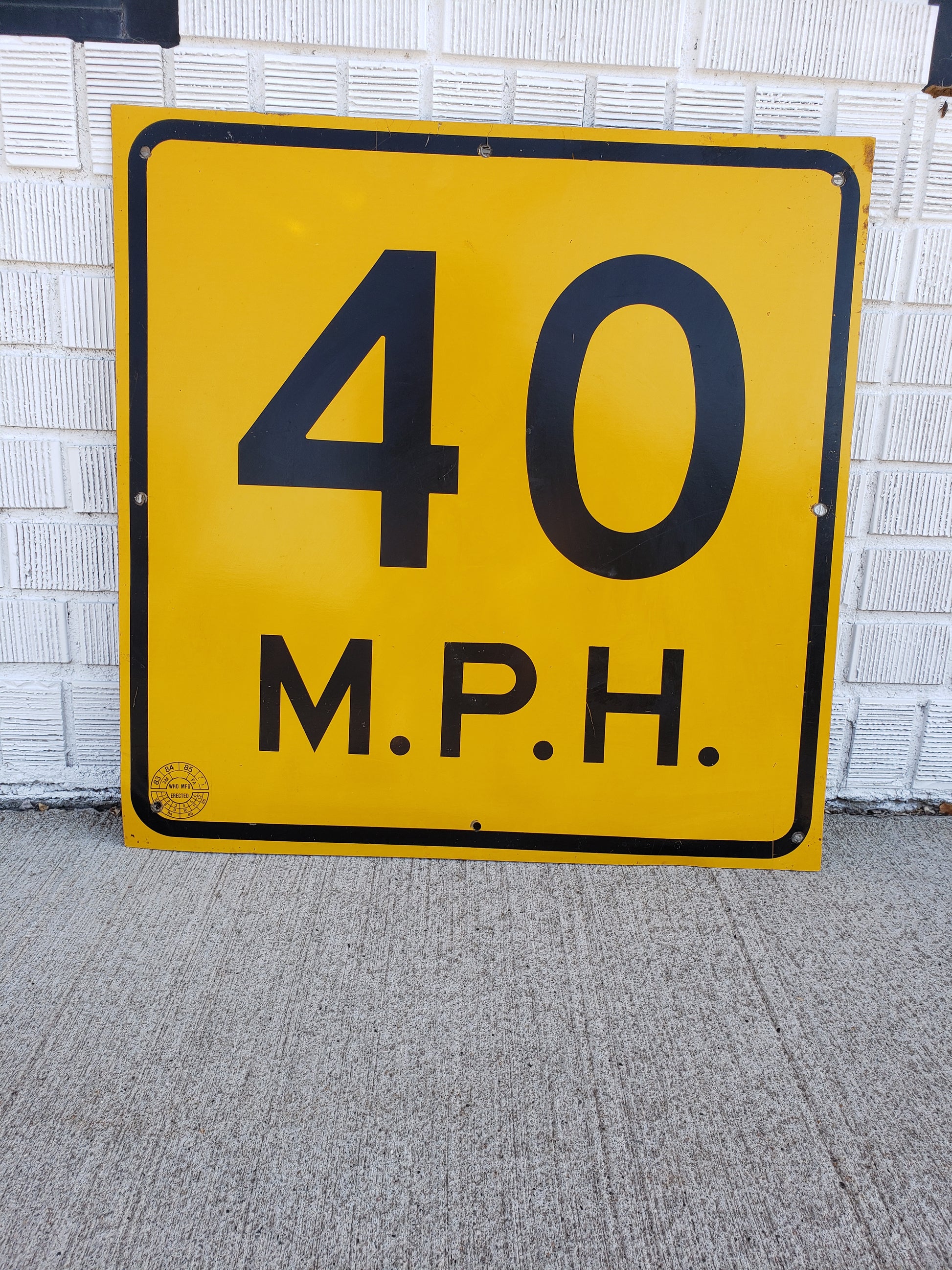 This is a genuine 40 MPH highway sigh that has been retired. It measures 24 x 24 inches. It has some dings and rusty spots as expected of a sign that has been displayed outside for a long time. It's in fair used condition, a bright addition to a garage or man cave or teenager's room.