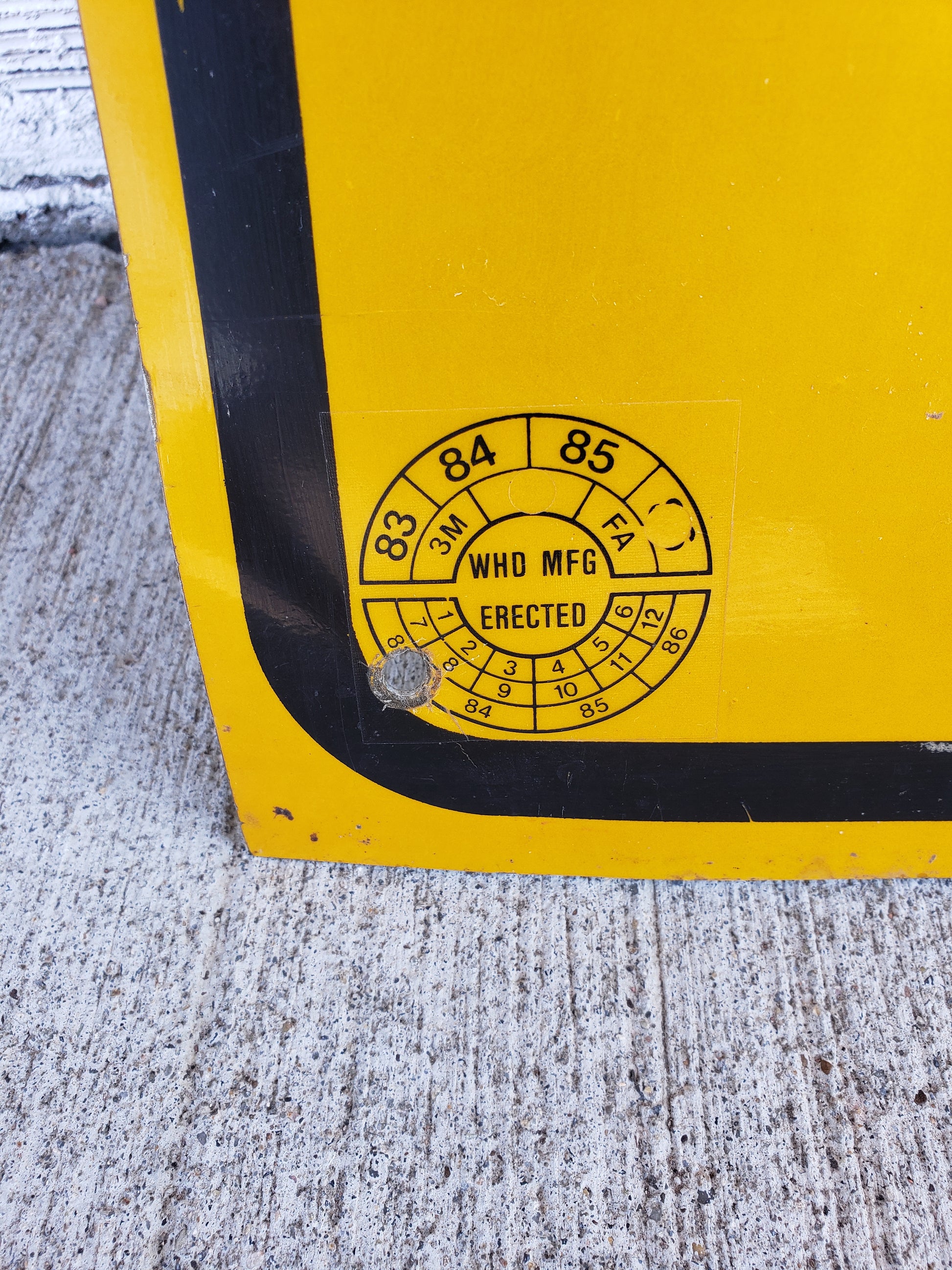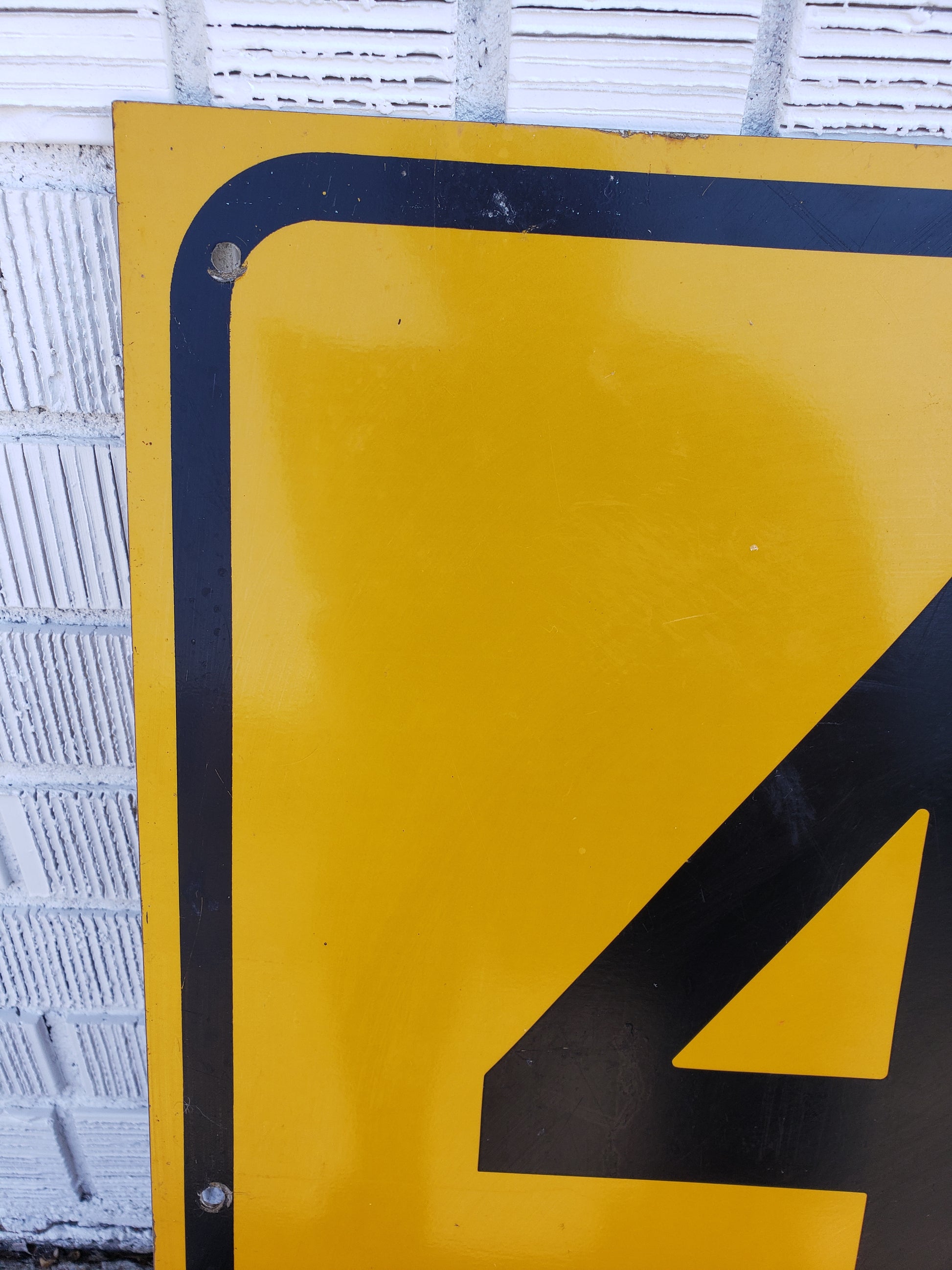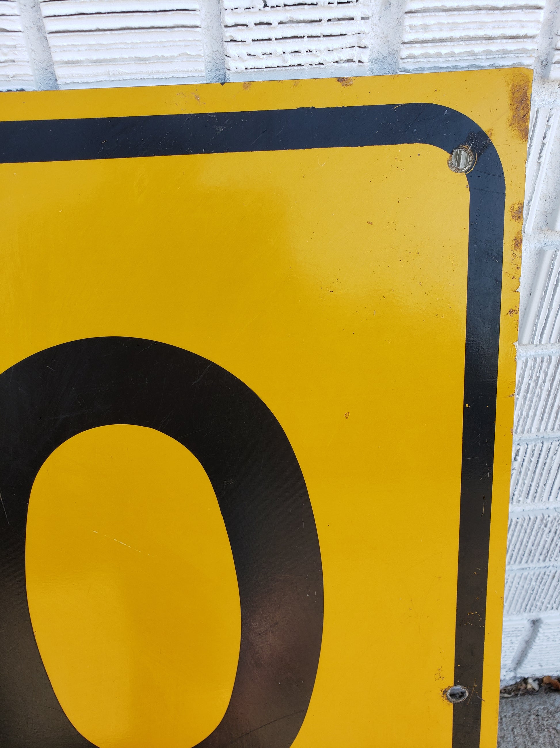 This is a genuine 40 MPH highway sigh that has been retired. It measures 24 x 24 inches. It has some dings and rusty spots as expected of a sign that has been displayed outside for a long time. It's in fair used condition, a bright addition to a garage or man cave or teenager's room.