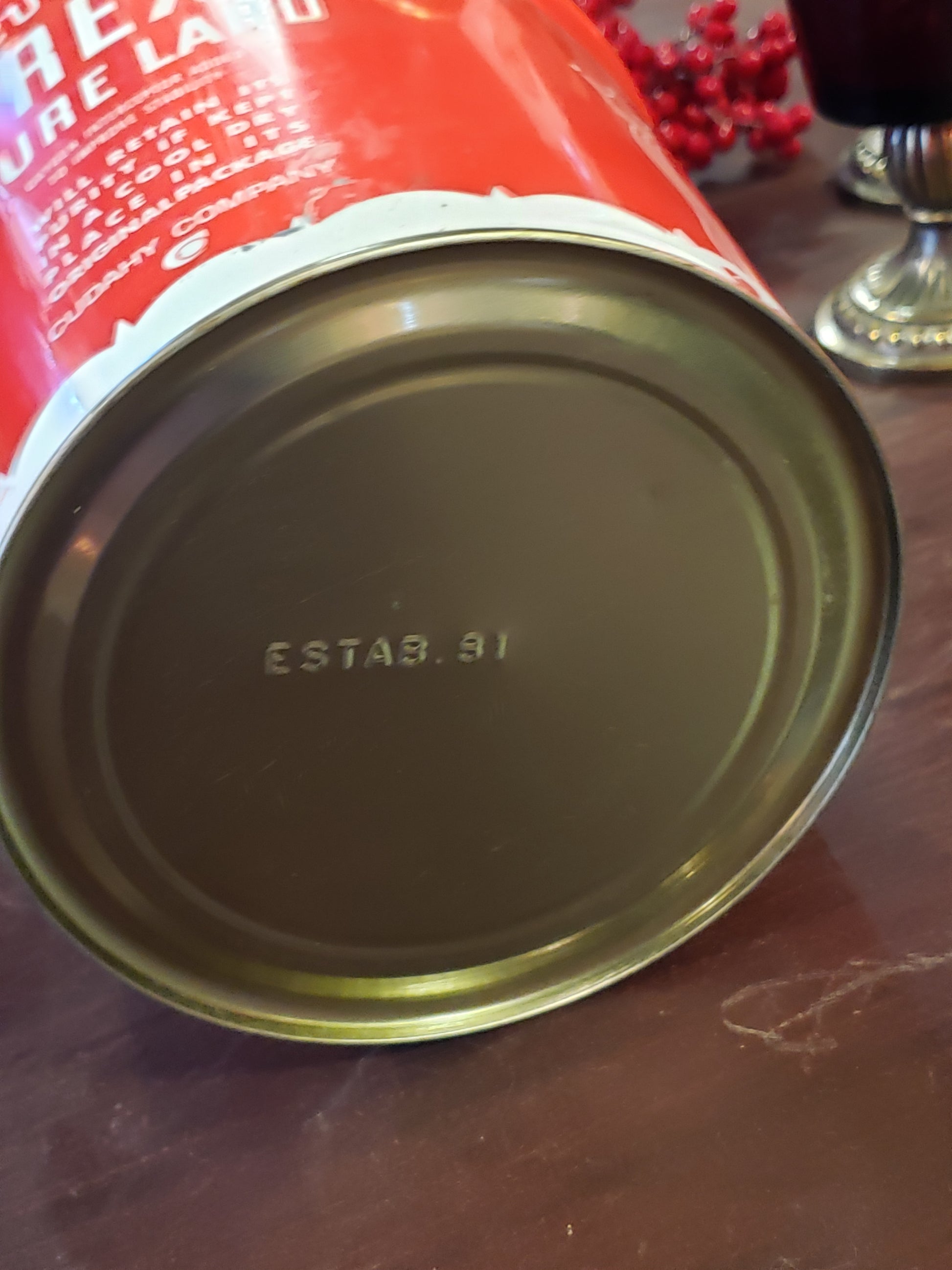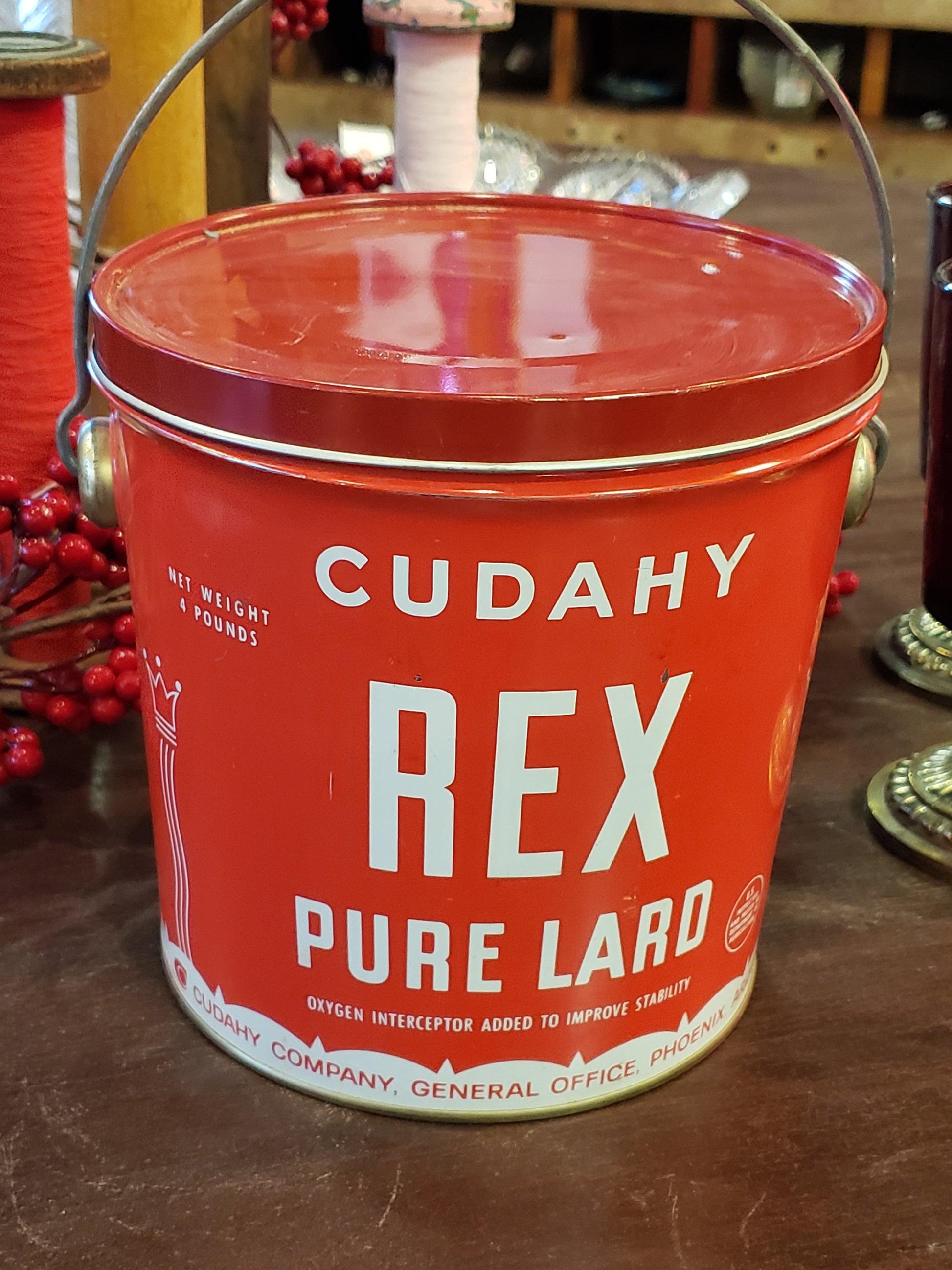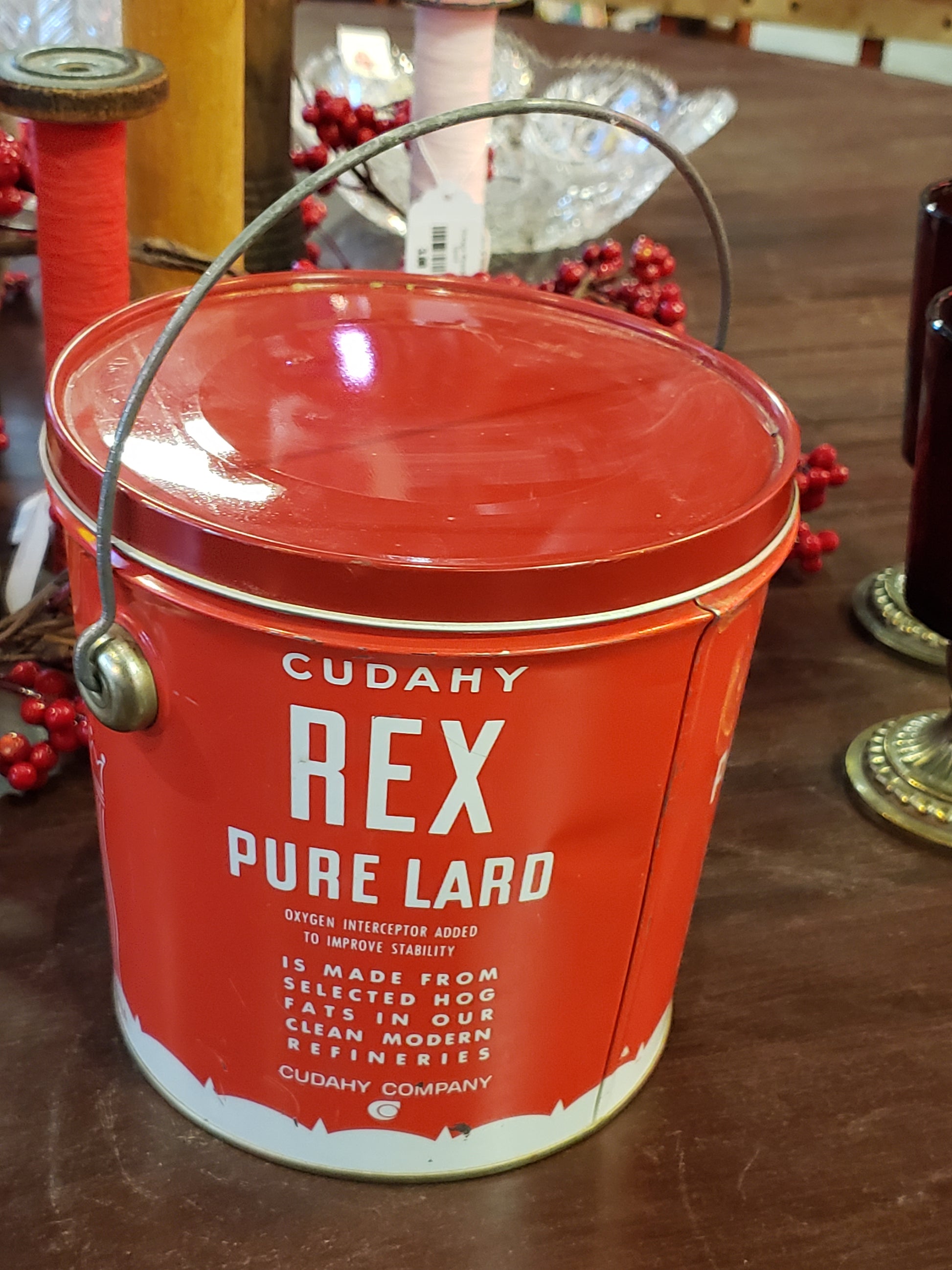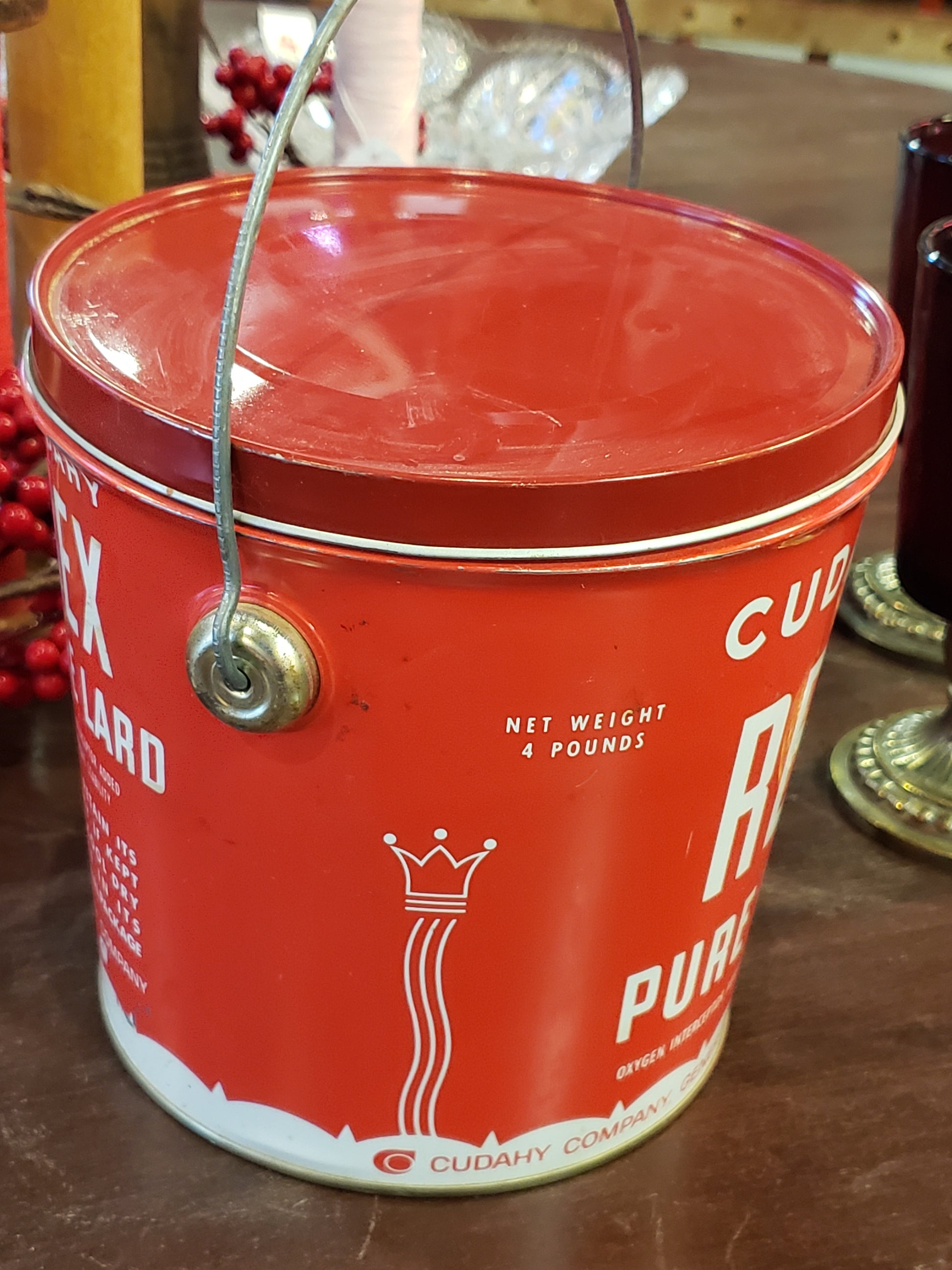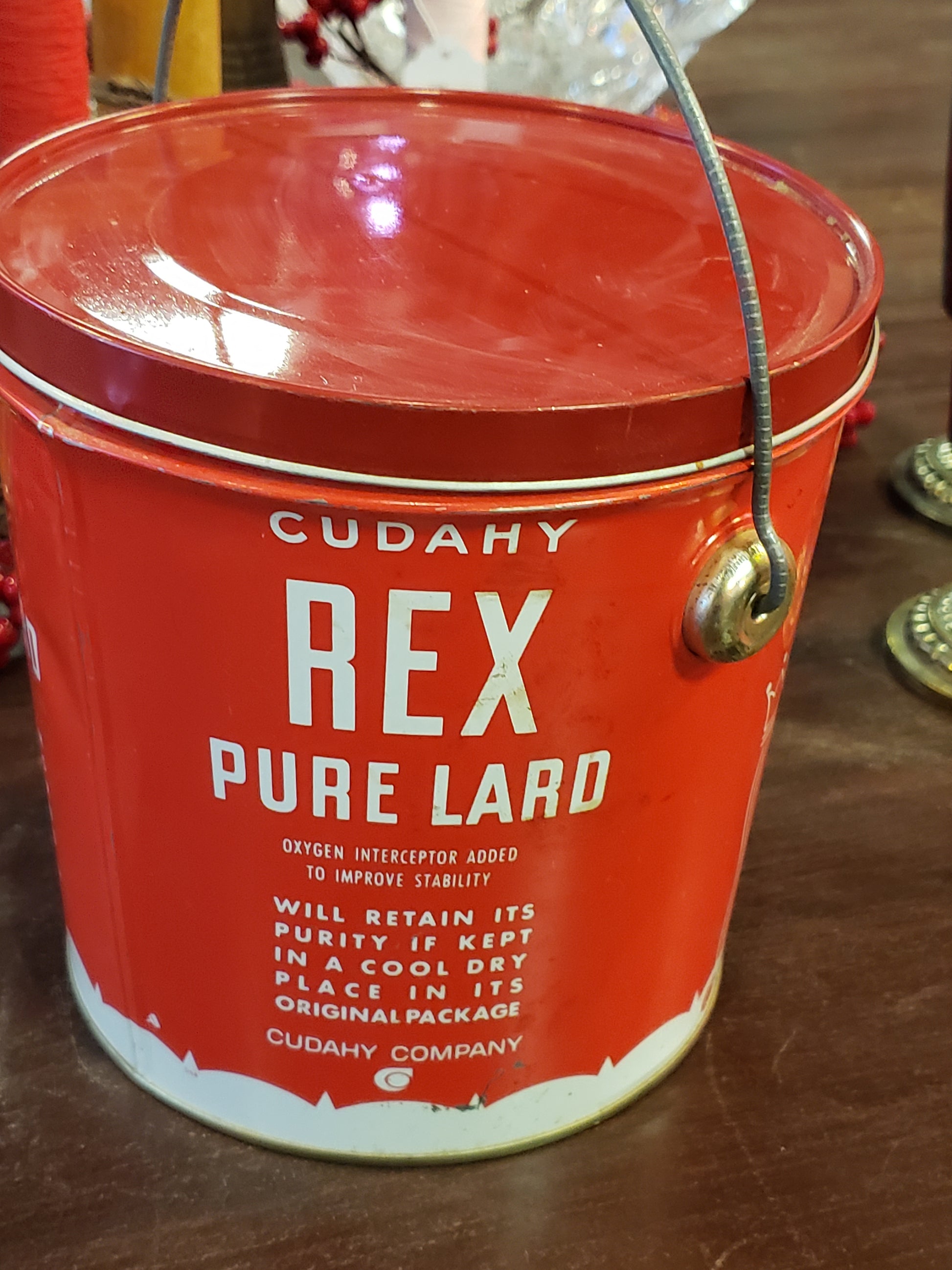 Upgrade your kitchen decor with our vintage REX Cudahy Pure Lard bucket with lid. Once held 4 pounds of lard, now empty and ready to add a touch of nostalgia to your kitchen. A fun pail to use for extra storage or just add a touch of red and white. Fair vintage conditon.