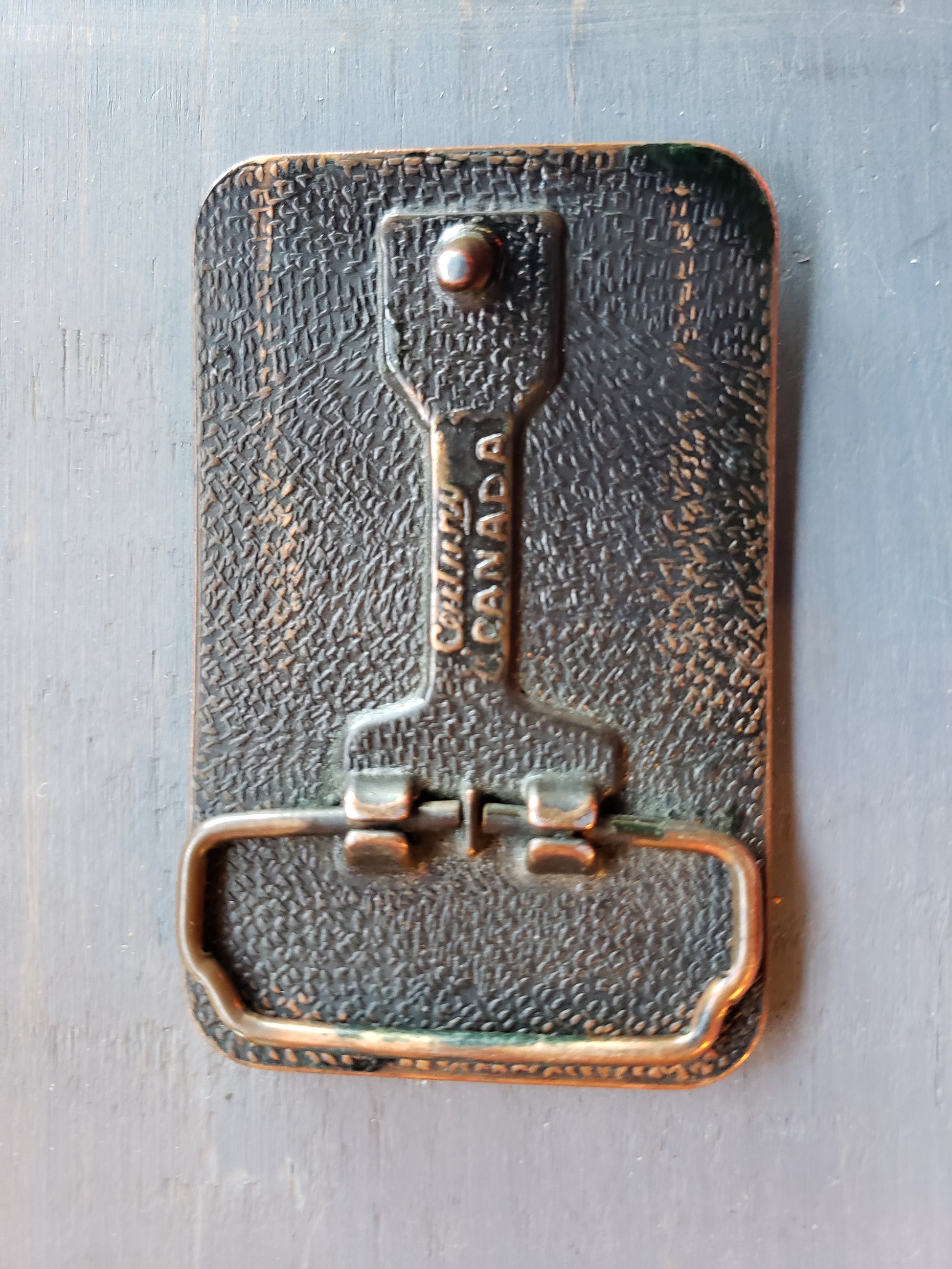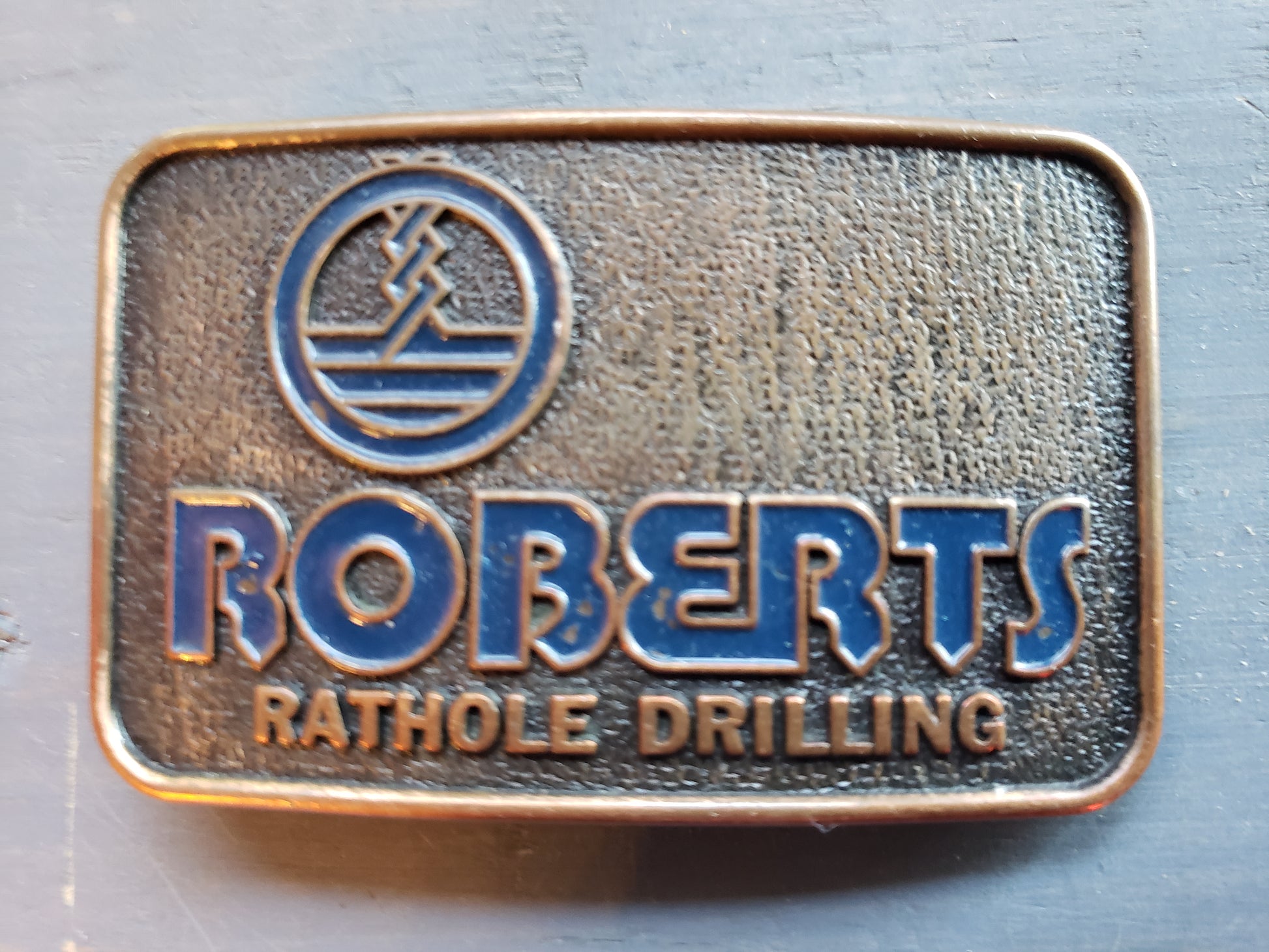 This vintage Robert's Rathole Drilling belt buckle from Canada features a striking copper color with bold blue lettering and logo. A unique collectible for enthusiasts, its pre-owned, fair condition adds authentic character and history. Perfect for adding a distinctive touch to your style or oilfield memorabilia collection.