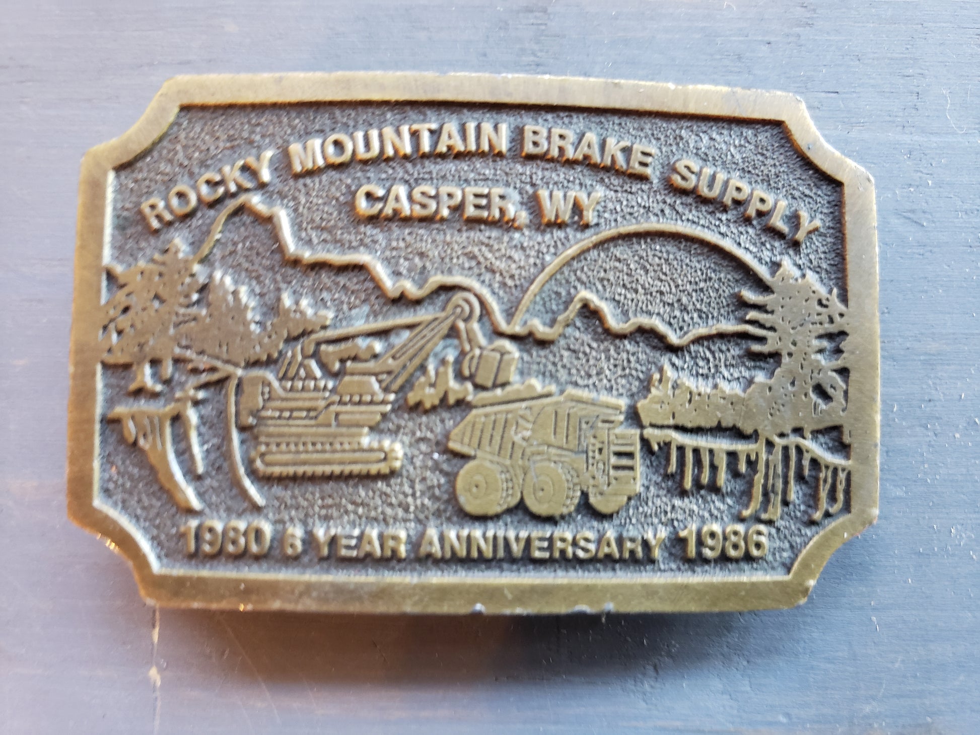 Celebrate a piece of history with this 1986 vintage brass belt buckle commemorating Rocky Mountain Brake Supply's 6-year anniversary. Featuring a detailed raised image of a dump truck and loader, this pre-owned buckle carries authentic charm and rugged character. Its fair condition adds to its vintage appeal, making it a unique accessory for collectors or fans of industrial heritage. Wear a symbol of durability and tradition that stands out with every outfit.