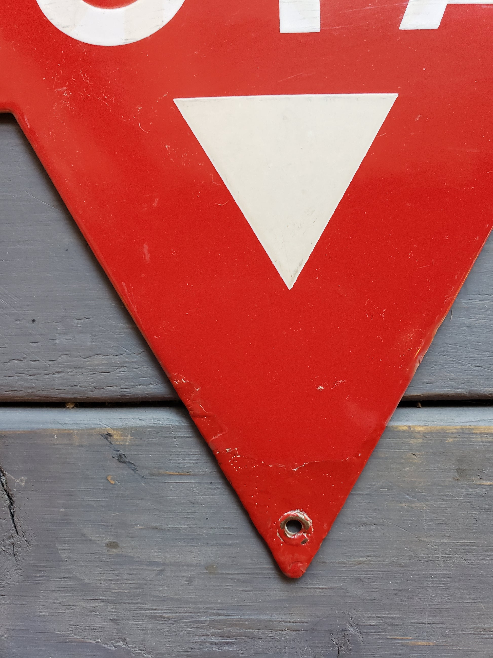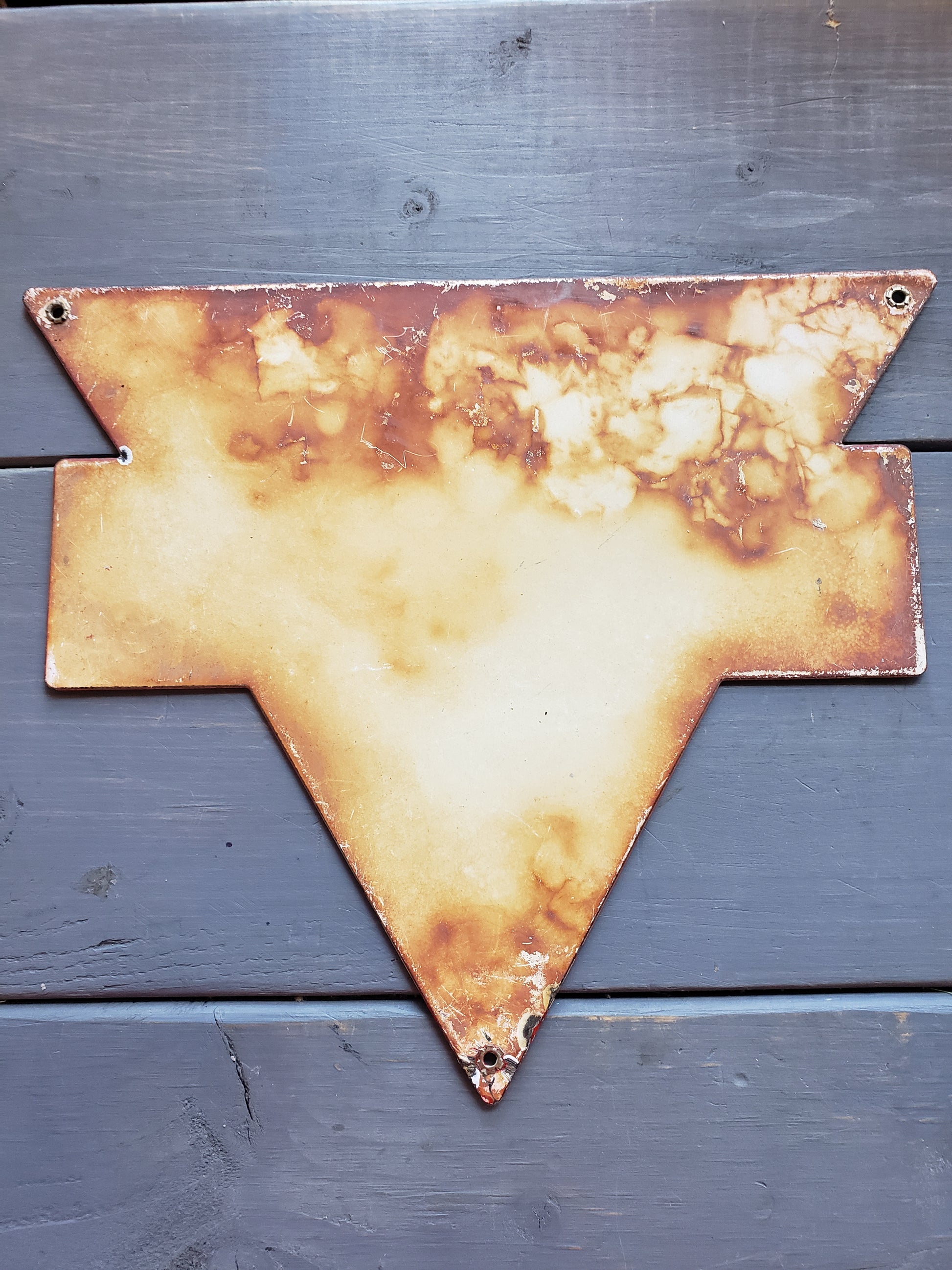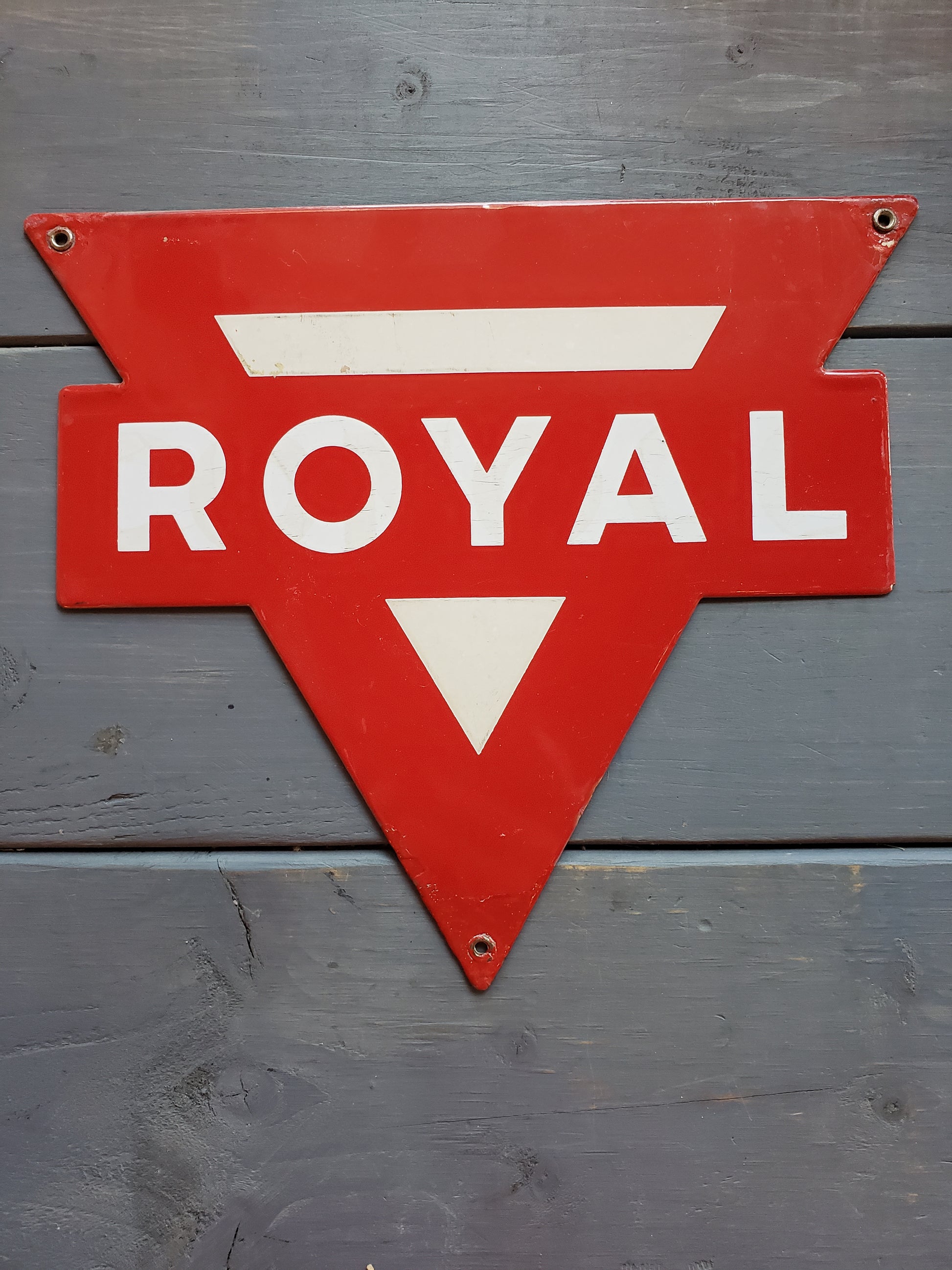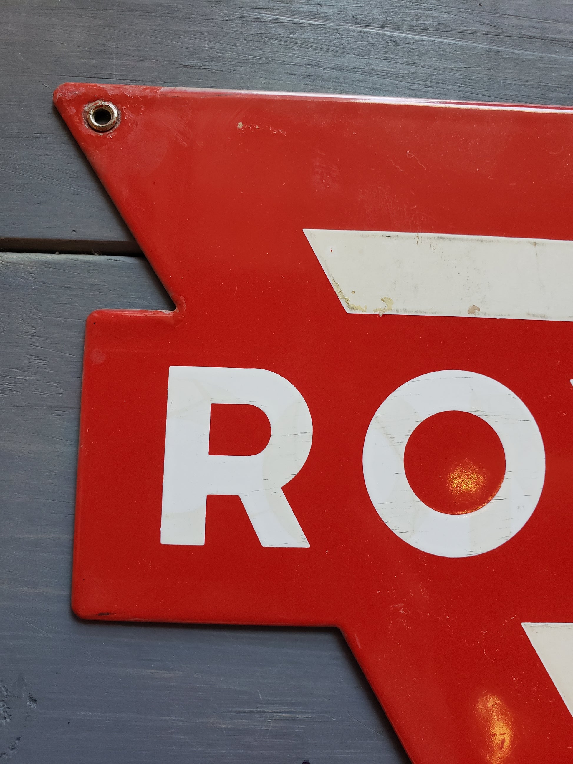 1950's Die Cut Porcelain gas pump plate advertising Royal Conoco. This sign is 8.5 x 10 inches and is in fair used condition. This is a rare original sign and would be a colorful addition to your garage or man cave, or a handy part for restoration.