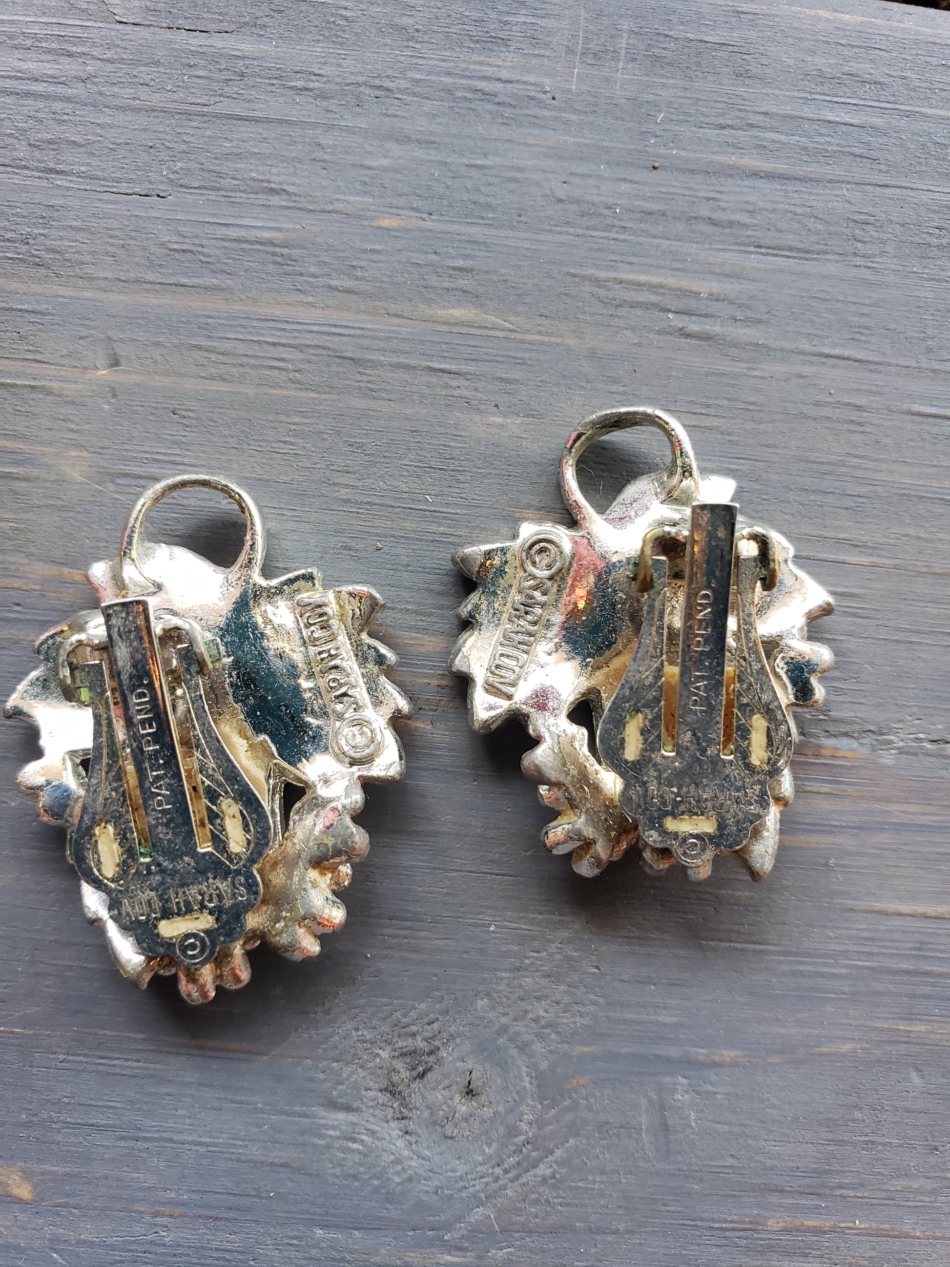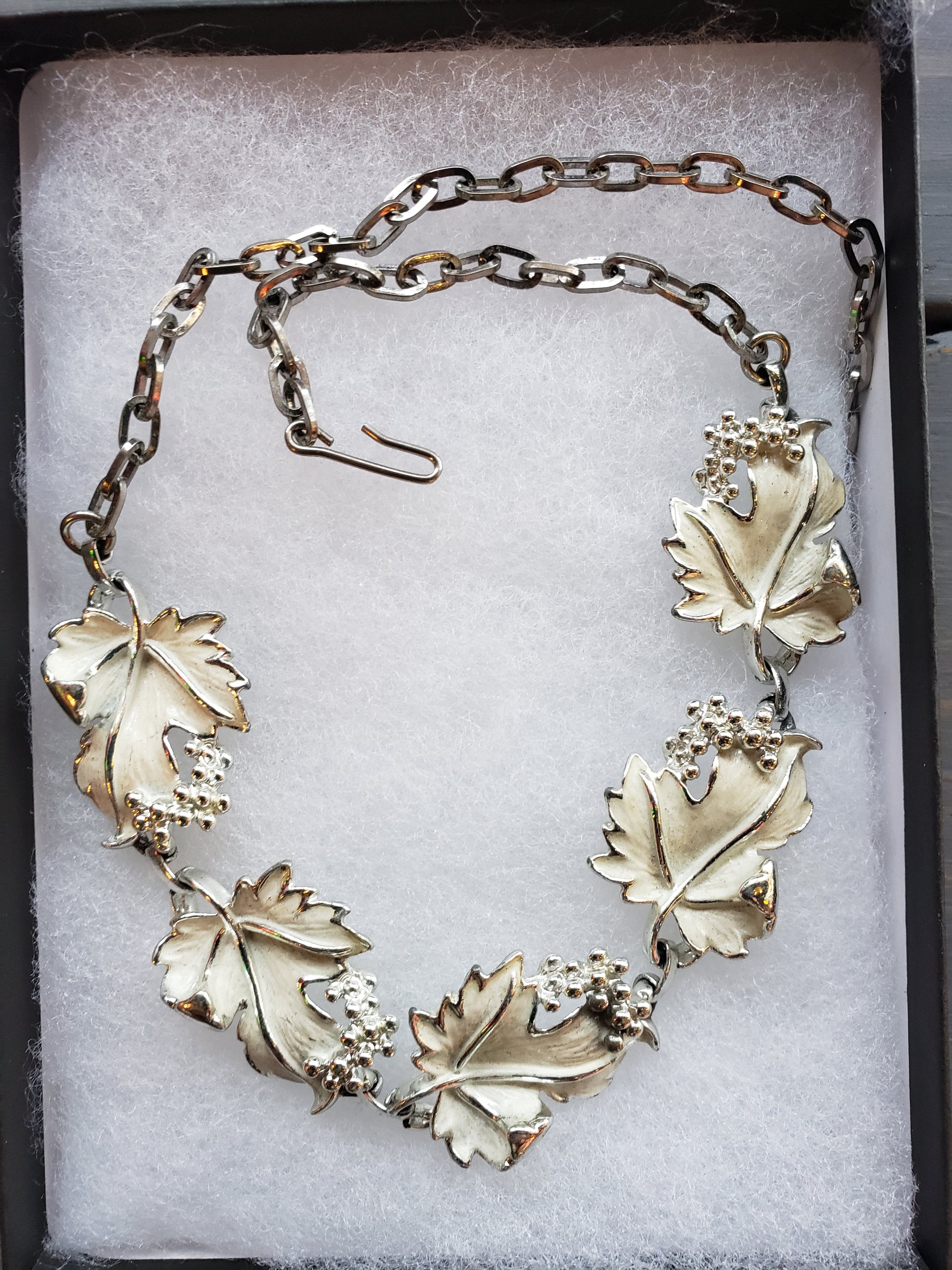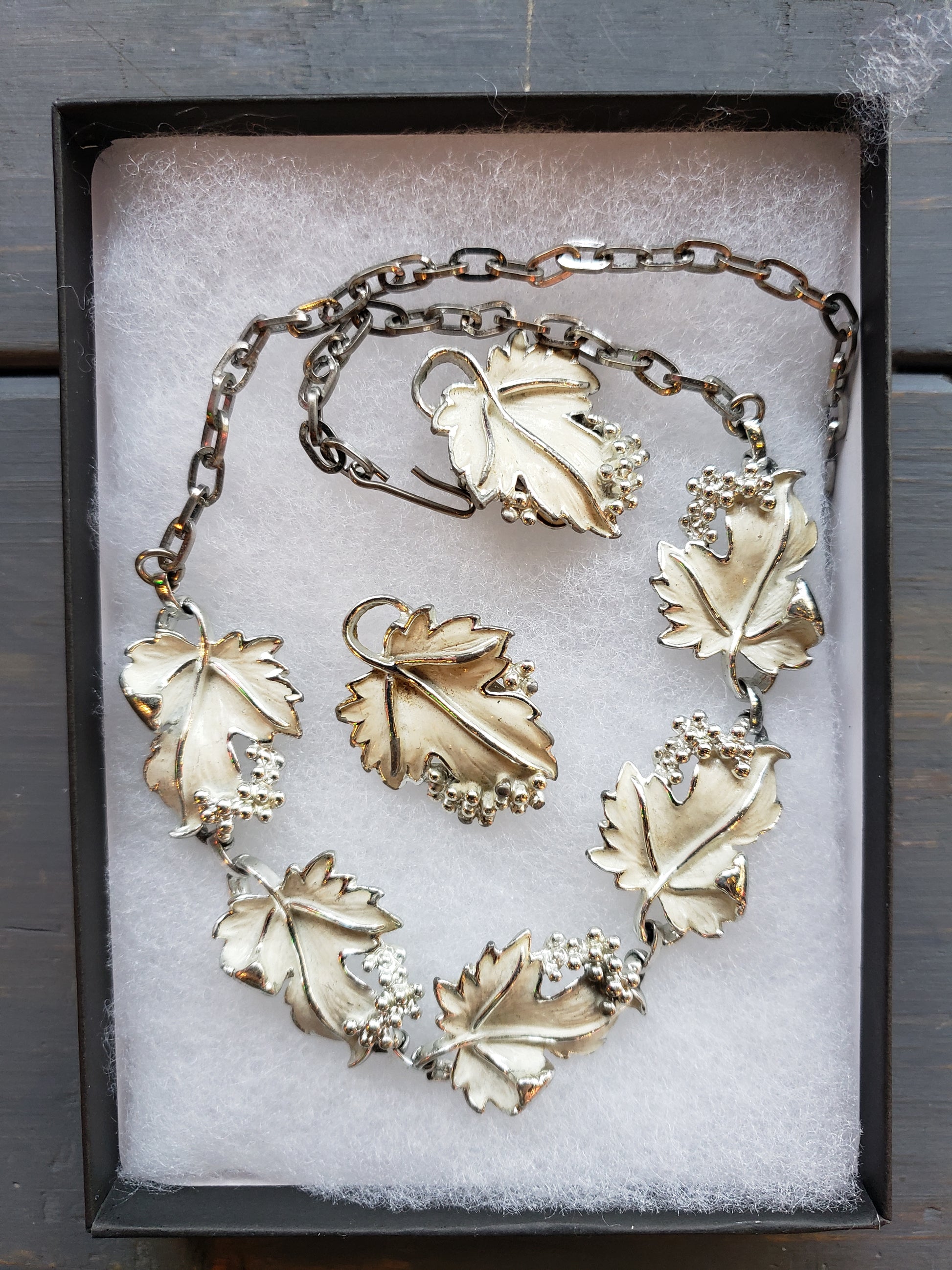 This vintage Sarah Coventry set features a white enameled leaf necklace paired with matching clip-on earrings. Its timeless design adds a touch of elegance to any outfit, perfect for those who appreciate classic style with a unique flair. Despite its age, the set remains in fair condition, making it a charming addition to your jewelry collection or a thoughtful gift for vintage lovers.