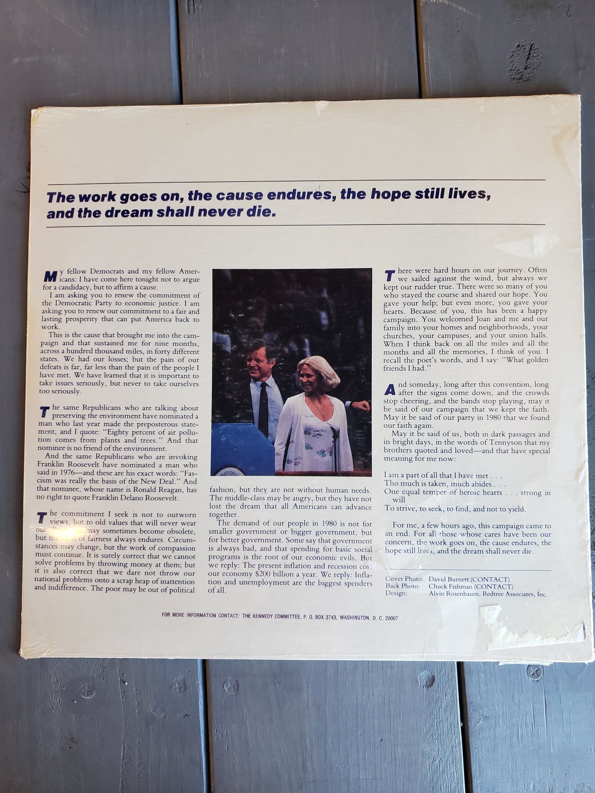 The address of Senator Edward M. Kennedy at the Democratic National Convention on August 12, 1980. Sealed vinyl album.