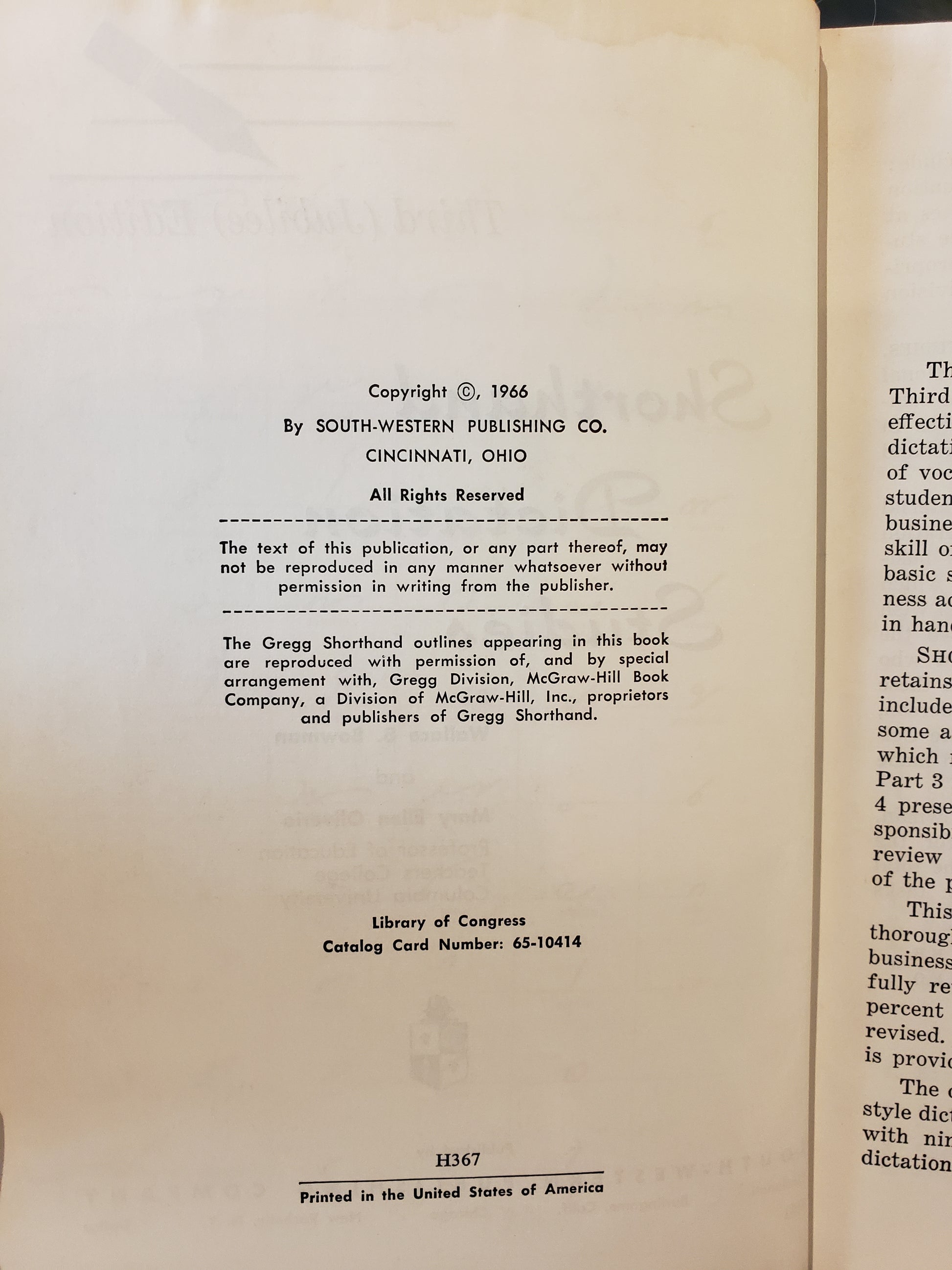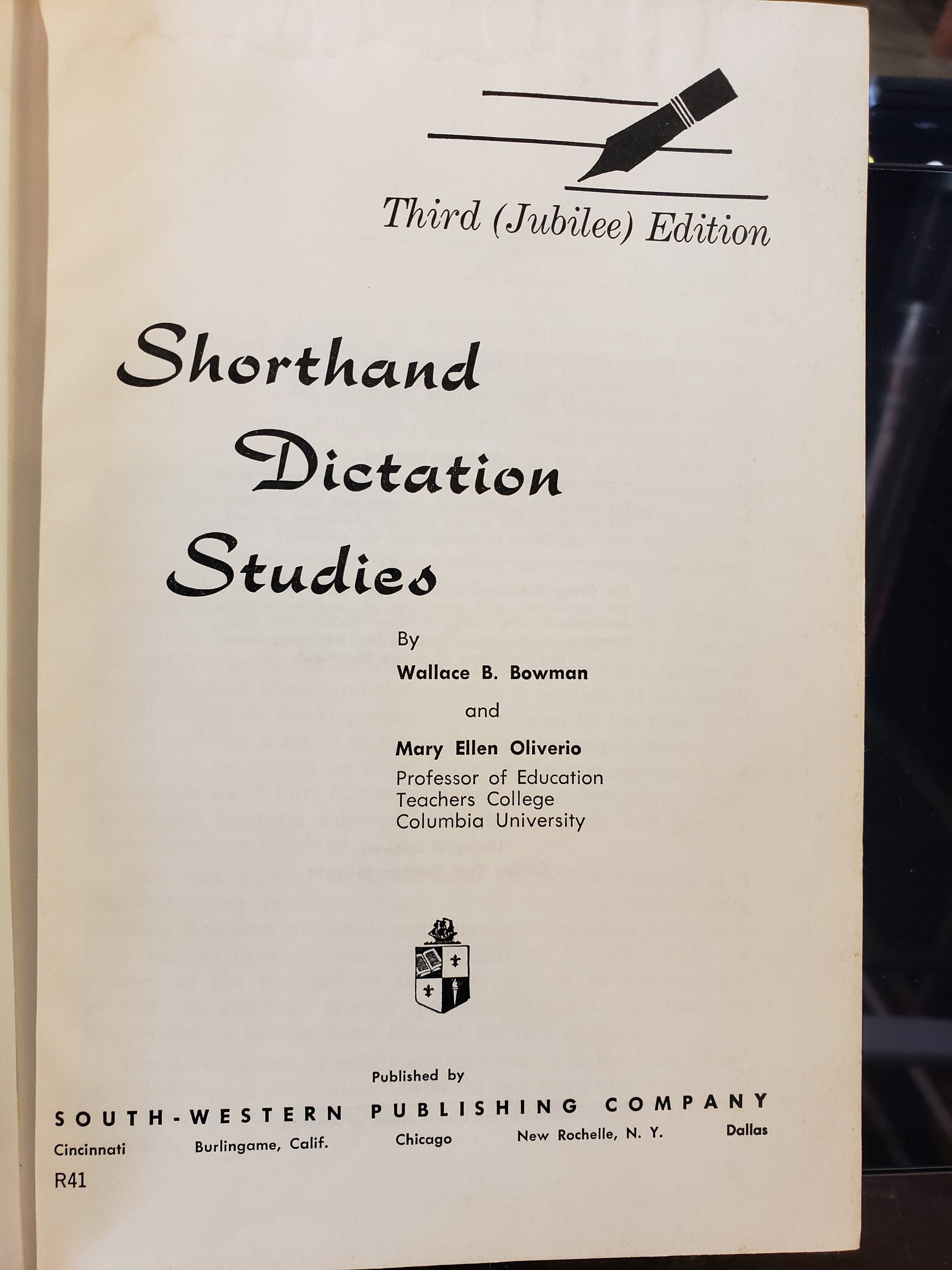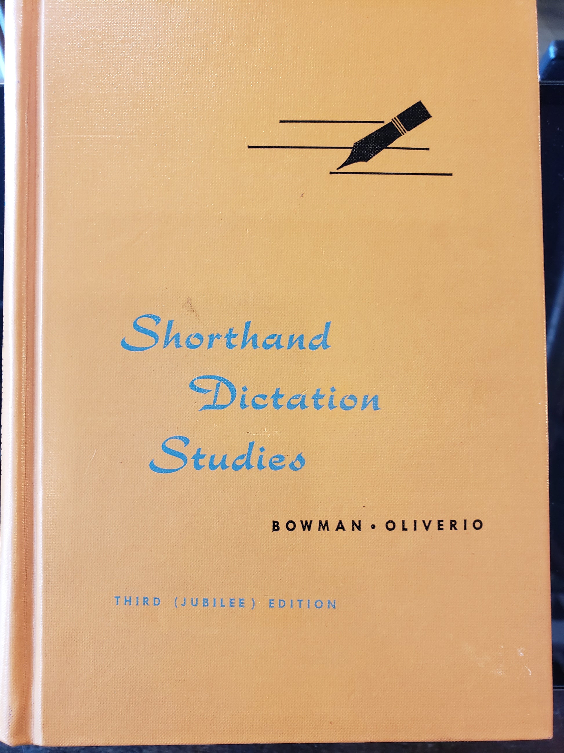 Shorthand Dictation Studies Third (Jubilee) Edition by Bowman- Oliverio. 674 page hardback published in 1966. Textbook to teach the language of dictation to future office workers. It is in fair vintage condition. There is slight water damage across the top, please see pictures for details. This informative book not only teaches shorthand, it also teaches standard business practices such as office organization, office machines, supplies, attitude and much more.