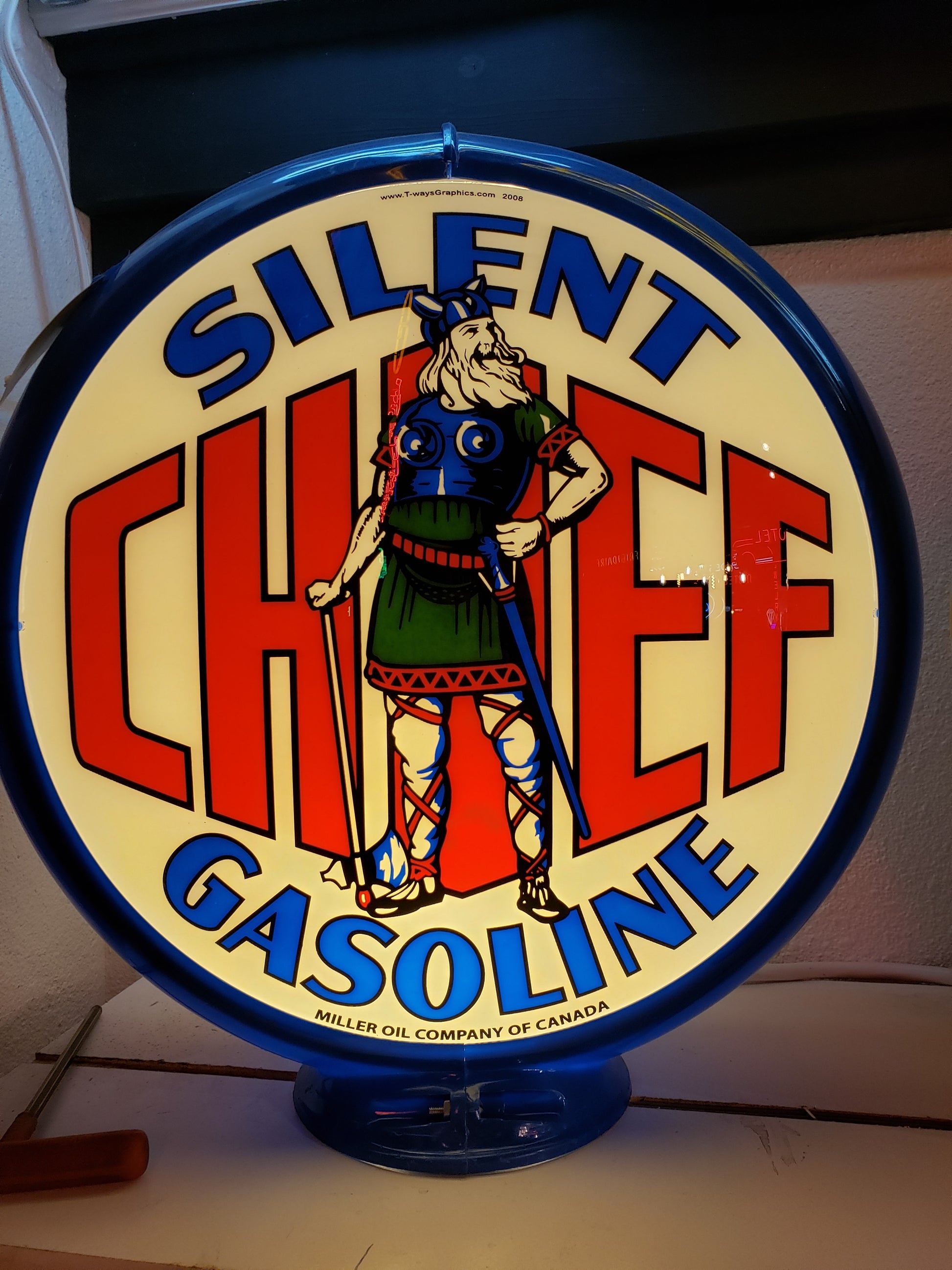 Reproduction 13" Silent Chief Gasoline Gas Globe in blue plastic body. Globe only, lighted base not included.