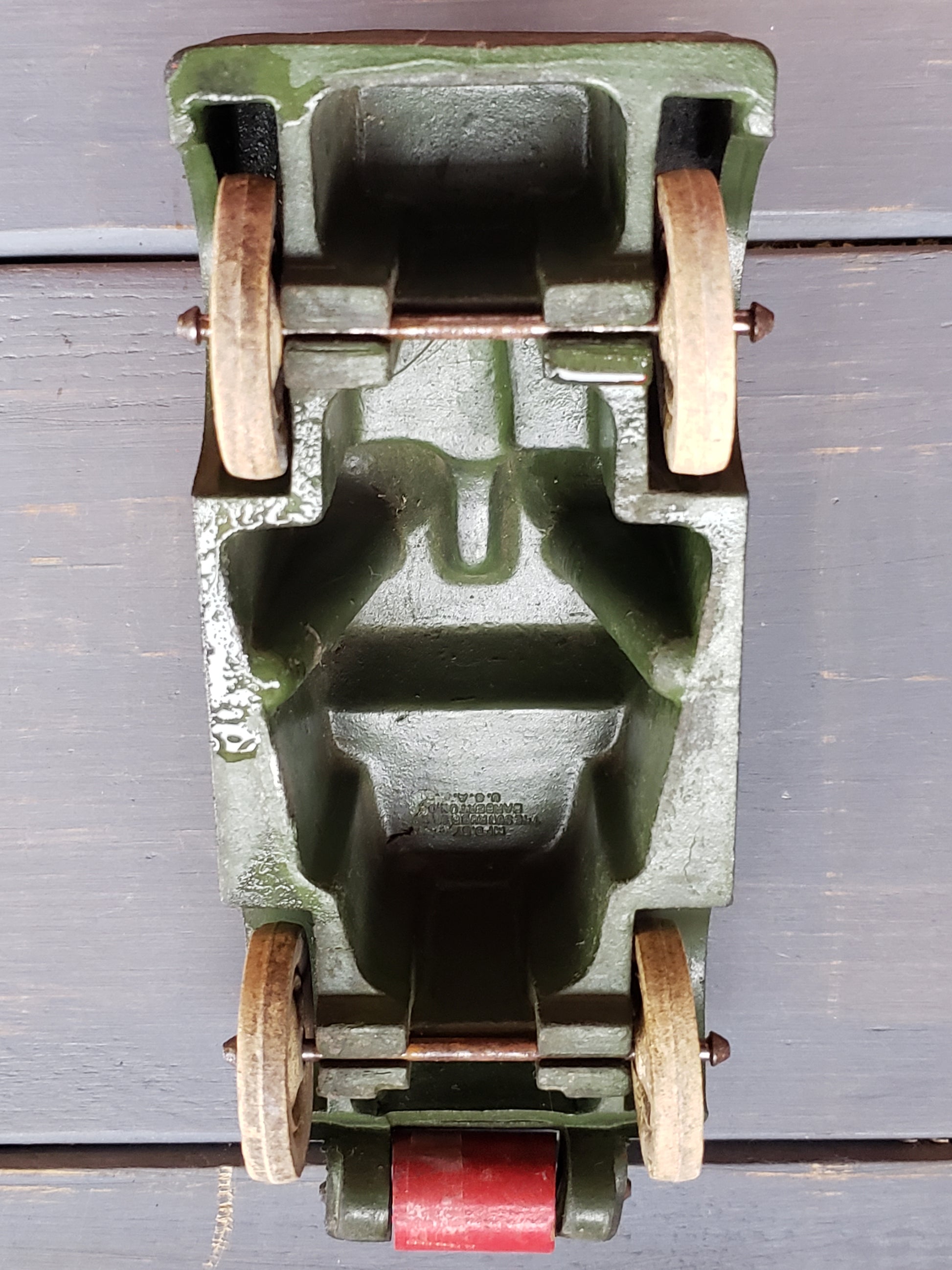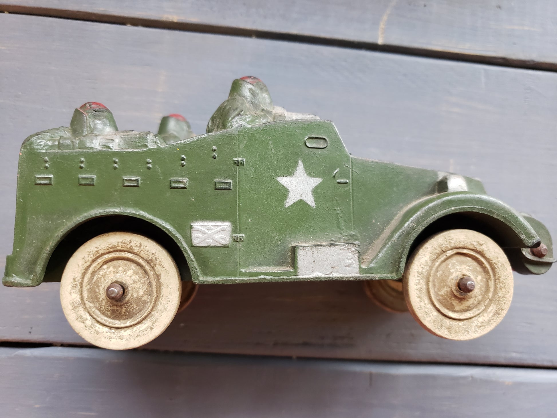 The Sun Rubber Military Armored Car Pre WWII is a detailed, vintage-style collectible that captures the rugged essence of military vehicles from before World War II. Crafted with care, it offers enthusiasts an authentic piece to complement their collections or displays. Its classic design serves as a reminder of historic armored vehicles, making it a meaningful addition for fans of military history. It has been played with, the tires are soiled and some of the color is worn. Fair vintage condition.