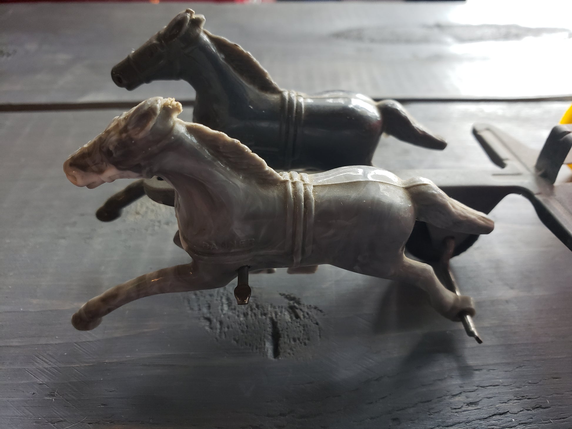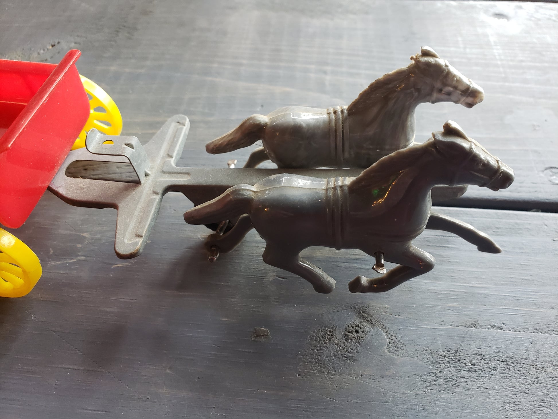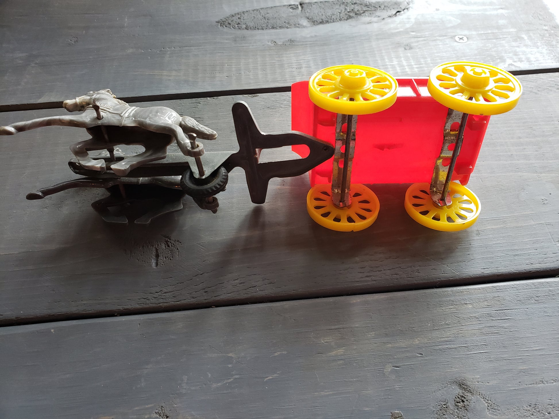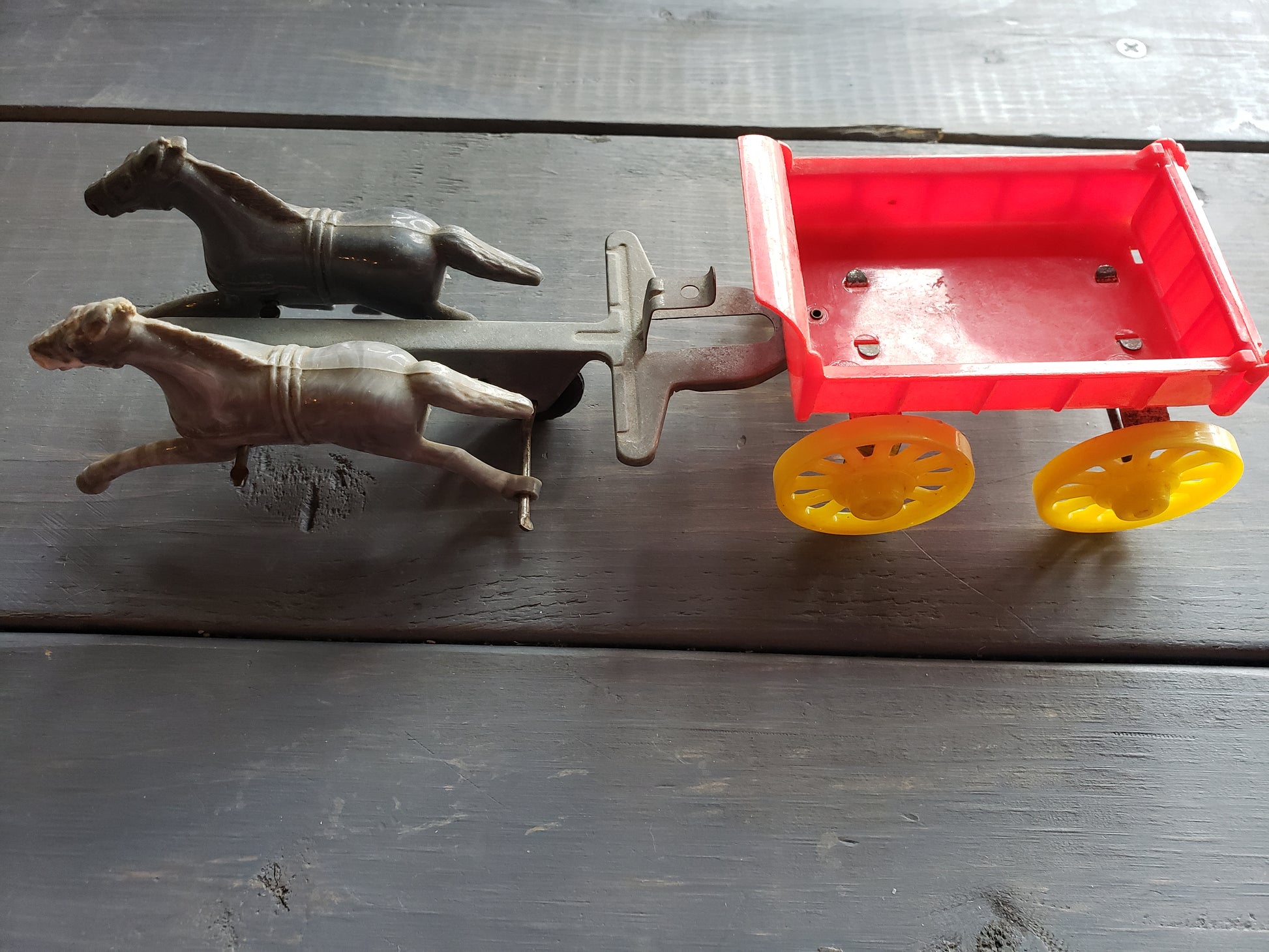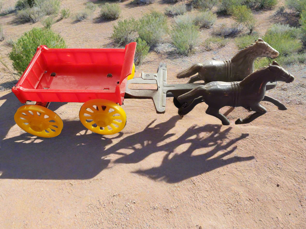 Introduce your children to the joys of the past with the Sunshine Dairy Cream Wagon! From the 1950's, this vintage toy features a plastic wagon and horses with a metal yoke. As you push it, watch as the horses gallop away. A delightful playtime experience for all ages. 8.5 inches long, fair condition.