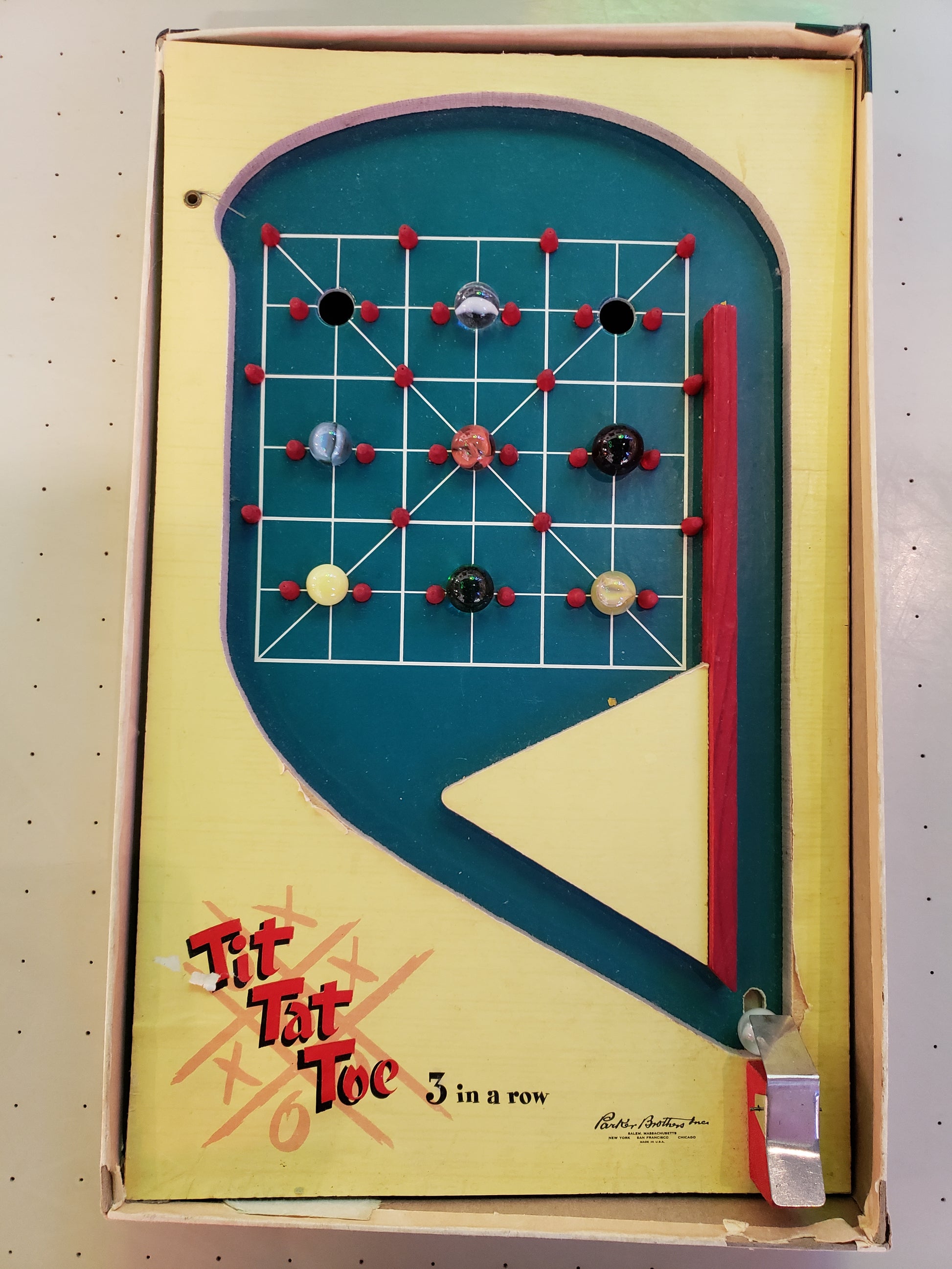 Experience the classic fun of the Tit Tat Toe 3 in a Row game by Parker Brothers, a unique blend of pinball excitement and tic tac toe strategy. Whether playing solo or with a partner, this vintage game offers engaging entertainment that challenges your skills and sharpens your mind. Perfect for game nights or nostalgic moments, it’s a timeless addition to any game collection. The box has some wear on the edges. It comes with 8 marbles.