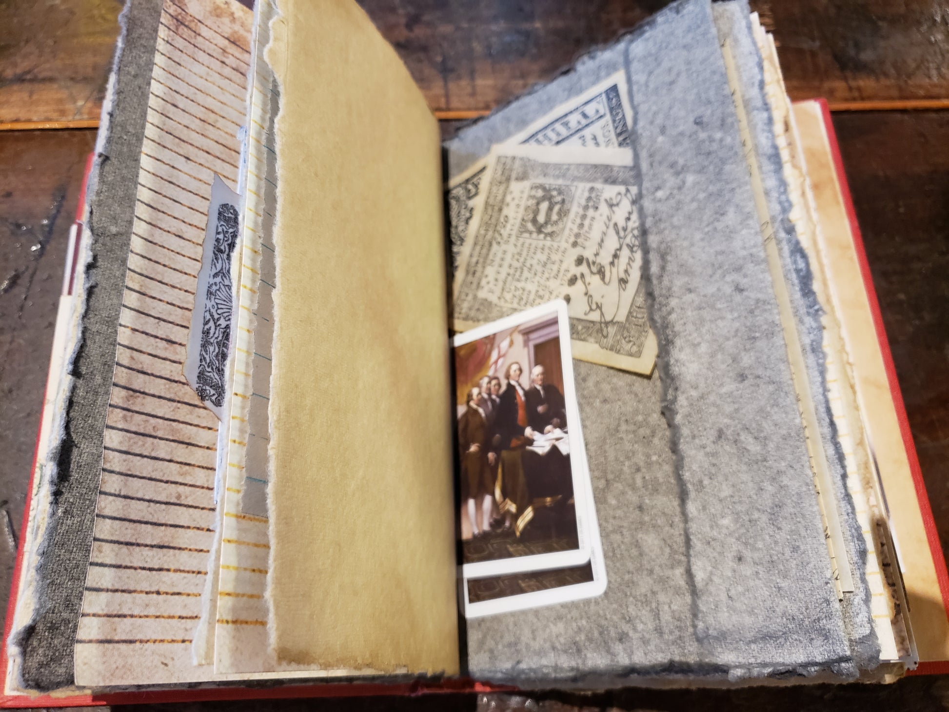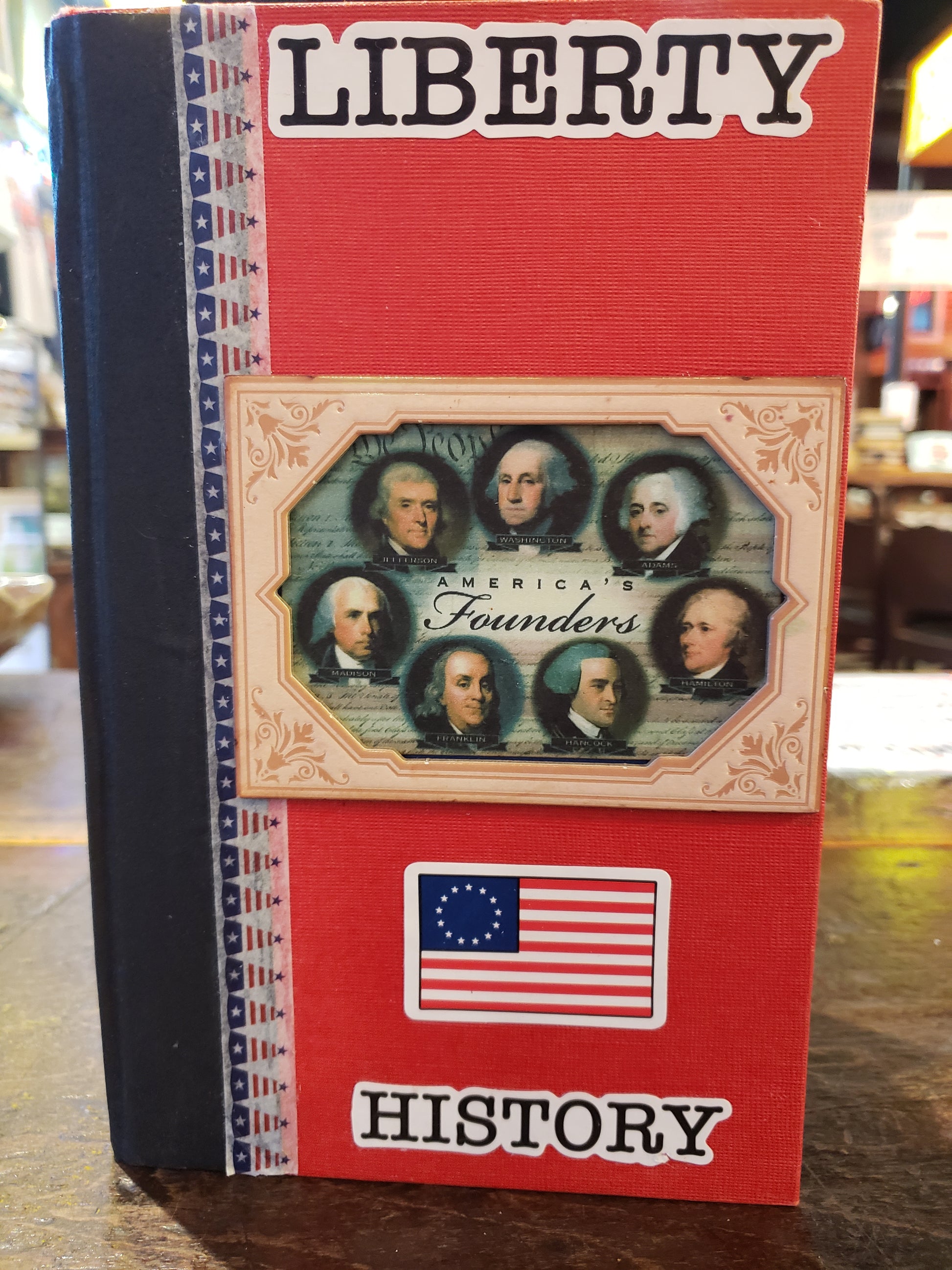 Expertly crafted and made by hand, our U.S. History themed journal includes unique playing cards, bookmarks, and trivia cards along with plenty of pages to jot notes and pockets to store keepsakes. Enhance your journaling experience with this one-of-a-kind addition. Perfect for history lovers who want to add a special touch to their writing. Created by "Handmade from the Heart" of Gillette, Wyoming. A unique gift for the History buff.