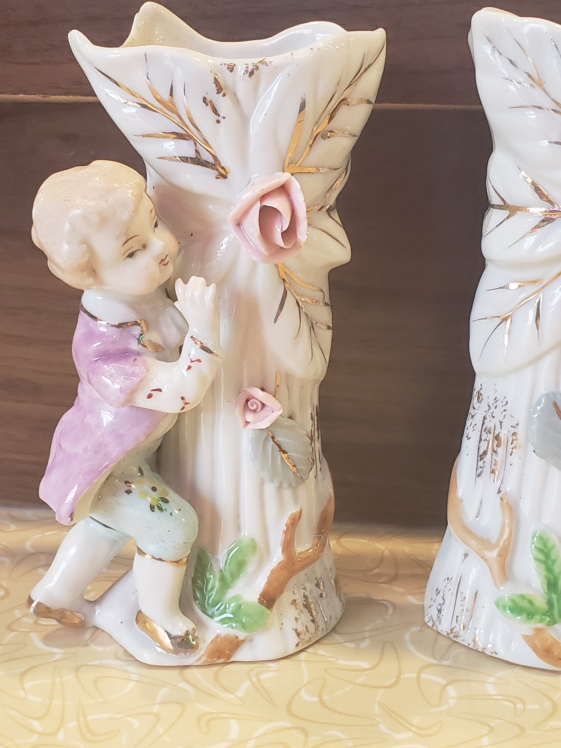 Discover the charm of vintage collectibles with this delightful UCAGCO 1950s porcelain vase set. Each 5.25-inch bisque piece features intricately raised leaves and flowers complemented by hand-painted details that showcase the craftsmanship of mid-century artisans. The real magic lies in the playful child peeking around each vase's side—a whimsical touch that captures the nostalgic spirit of the era. Perfect for collectors seeking authentic vintage treasures or anyone looking to add character and warmth to their home décor. These charming pieces are conversation starters that celebrate a beloved period in American design history.