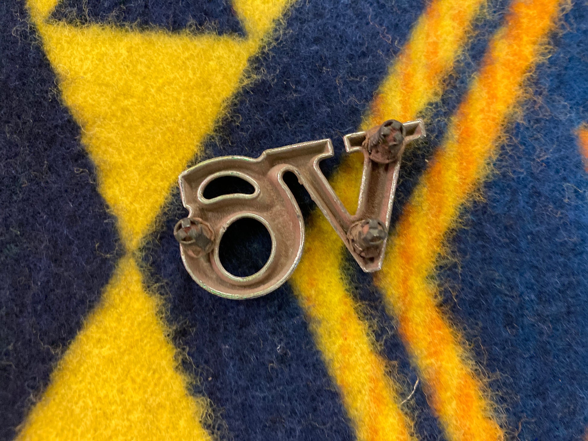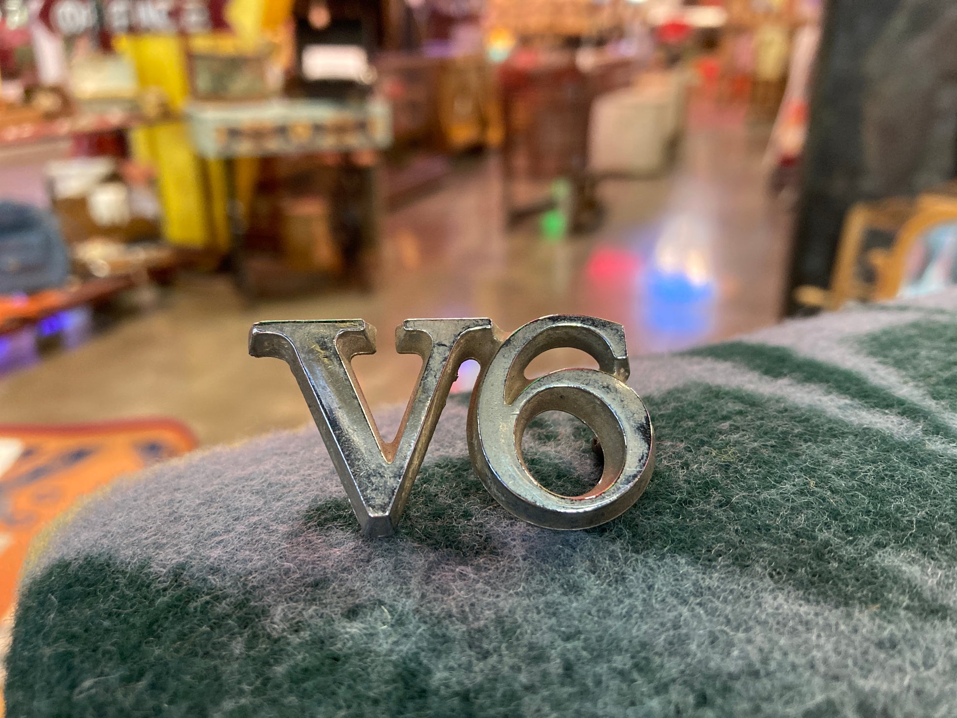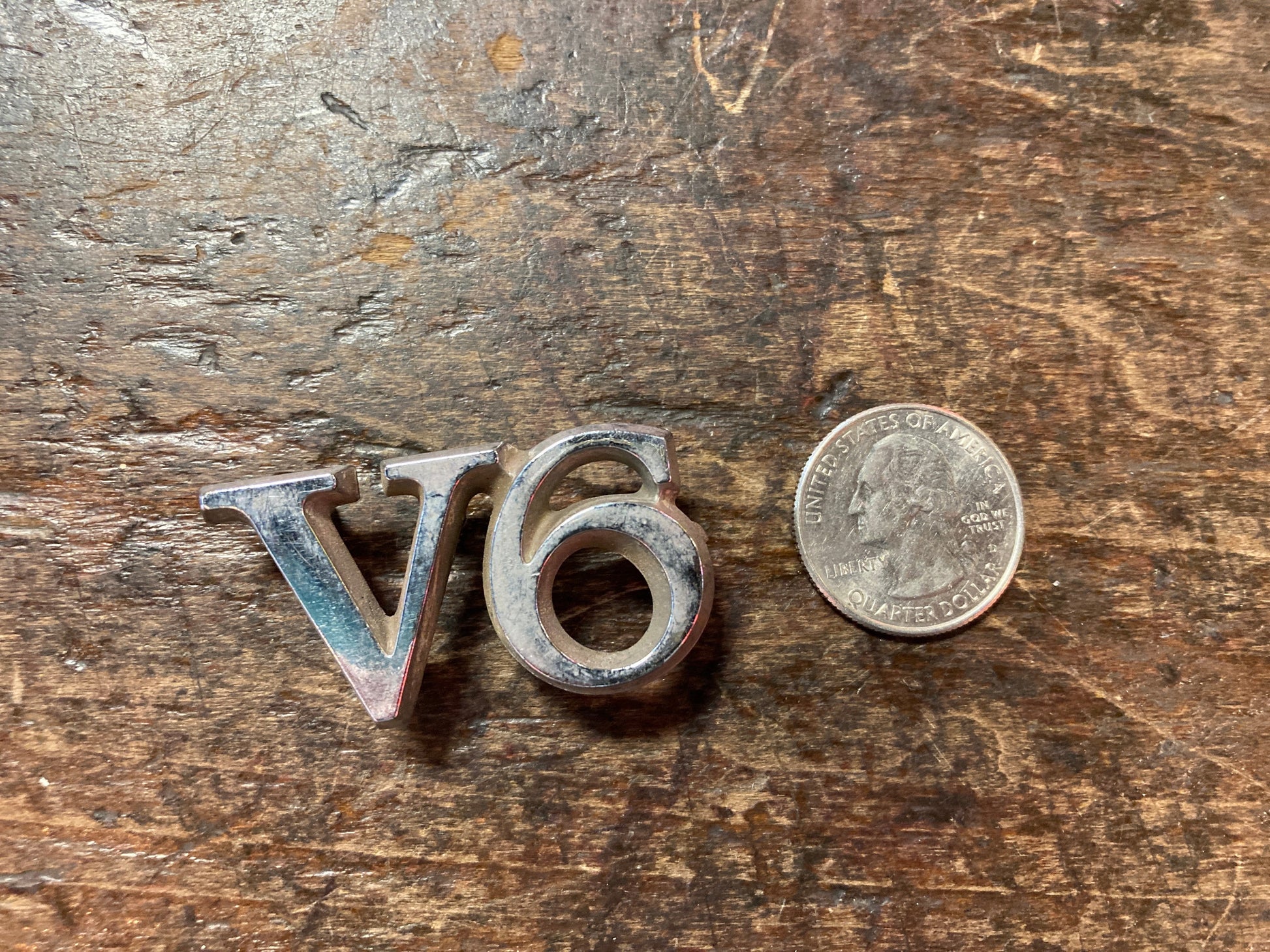 V6 Car Emblem. 1.75 inches wide x 7/8 inch tall. Has three tabs on the back for mounting. Fair used condition.