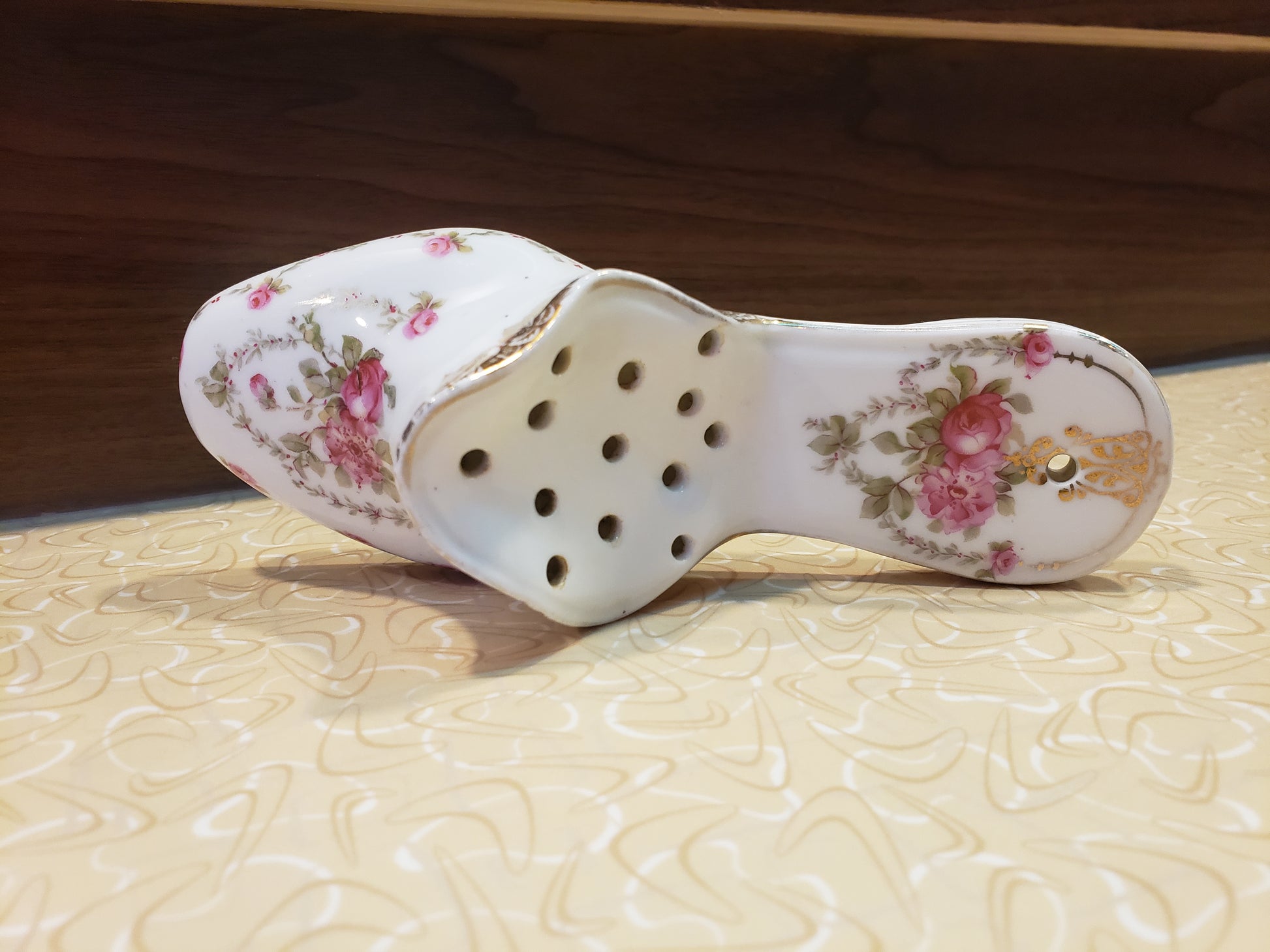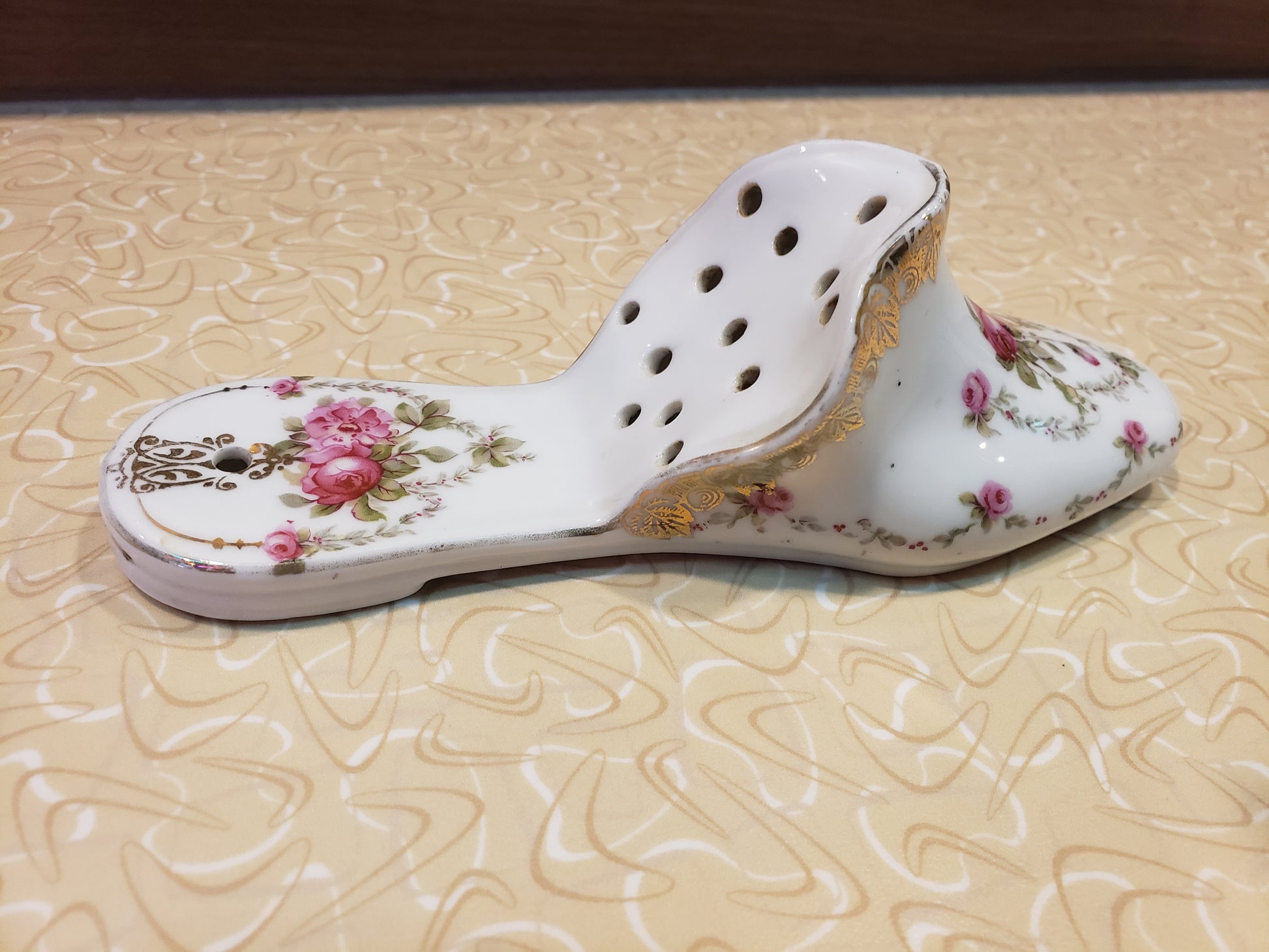 This charming Victorian Rose Porcelain Potpourri Slipper brings timeless elegance to any room. Hand-painted with golden accents on pristine white porcelain with delicate pink roses. It's a decorative treasure that doubles as a functional fragrance holder. The vintage-inspired design features convenient holes for adding your favorite potpourri, while a hole to hang it lets you showcase it as wall décor. At 6.5 inches long, this exquisite piece adds a touch of nostalgic sophistication to bedrooms, bathrooms, or living spaces. Perfect for collectors of vintage home accessories or anyone seeking a unique way to infuse their space with classic beauty and subtle fragrance. Fair vintage condition.