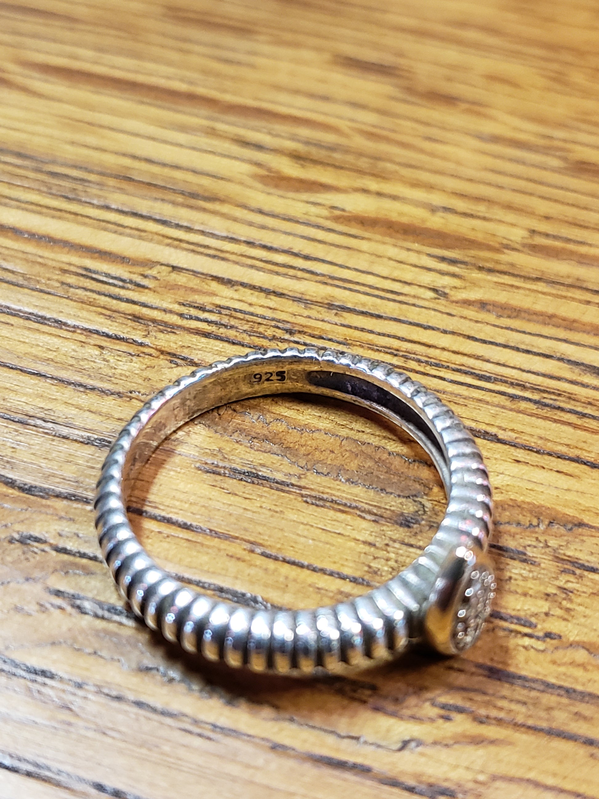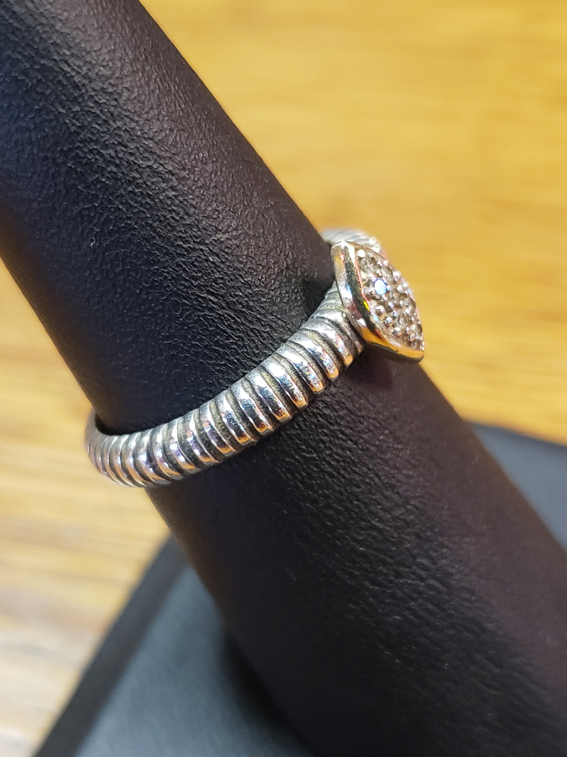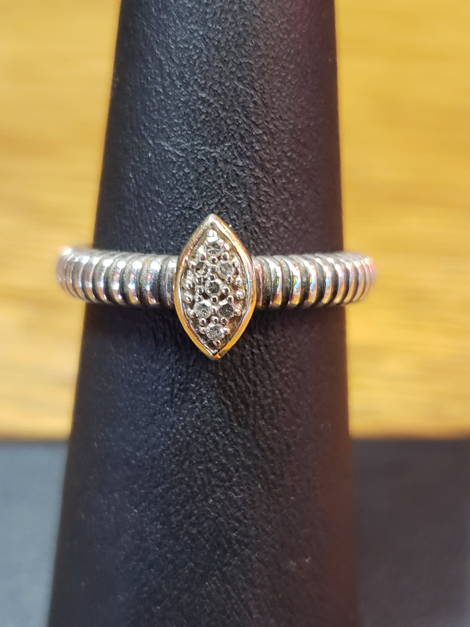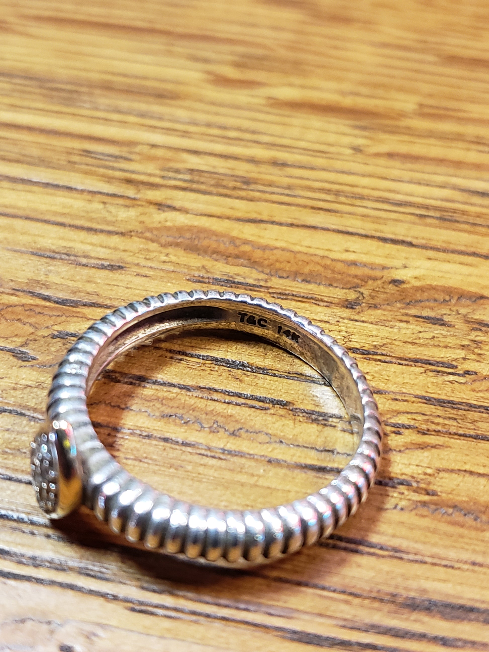 This is a vintage ring with a sterling band and a 14K setting with clear faceted stones. It is size 6.5, and has T & C 14K .925 embossed inside the band. it is in fair vintage condition.