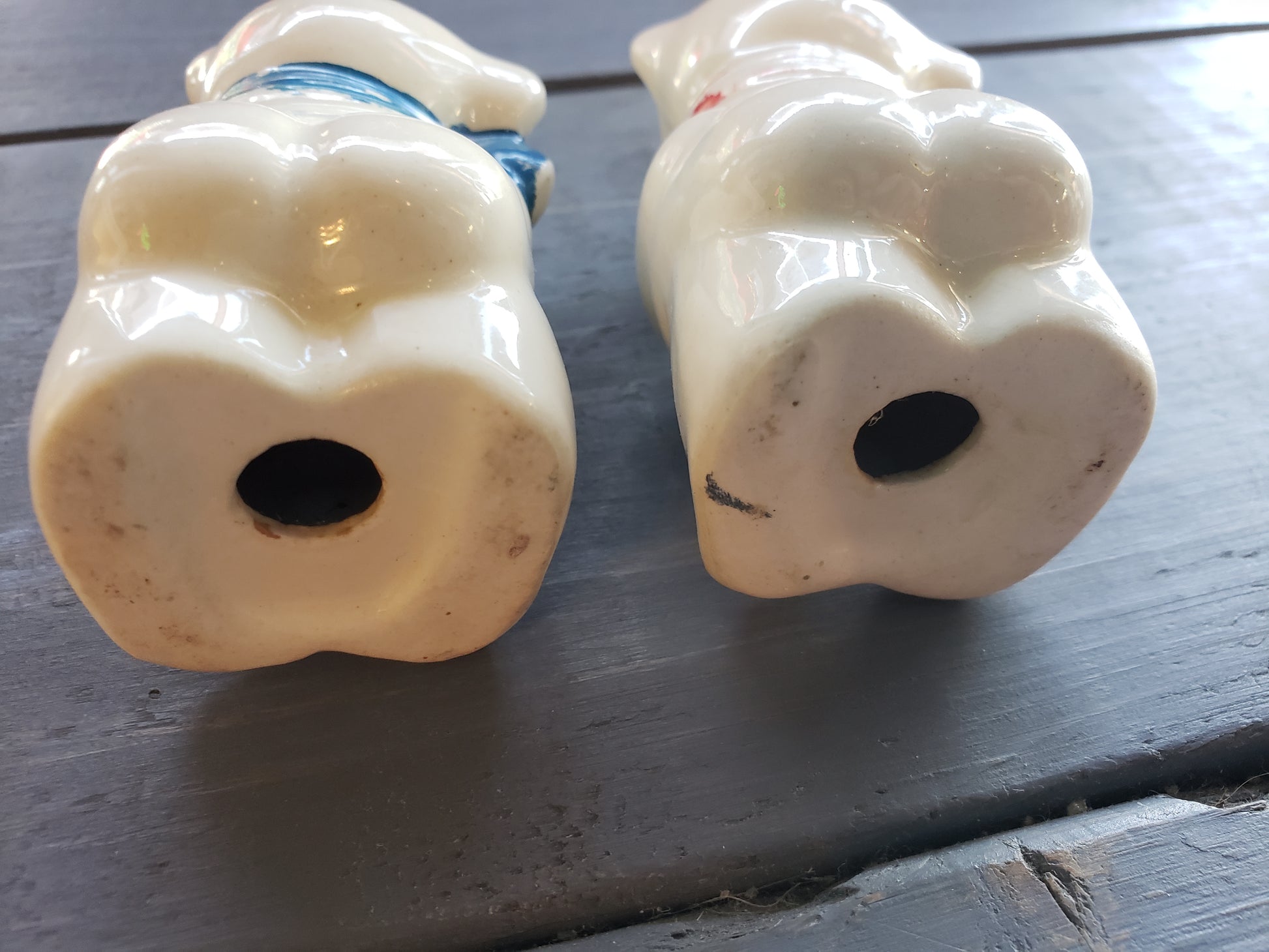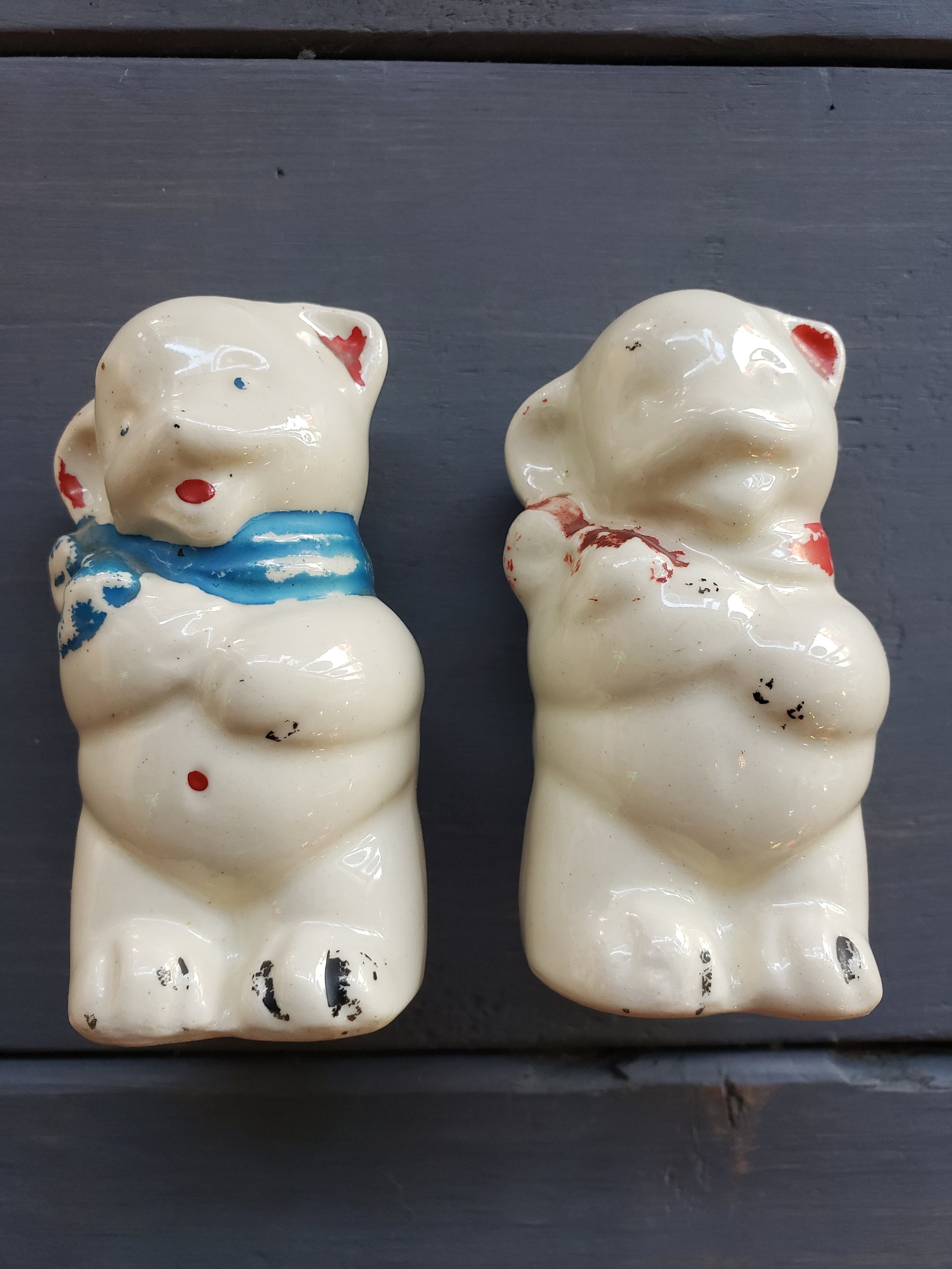 White porcelain bears with blue and red bows. They stand 3.25 inches tall, the paint on the bows is chipped. Mid Century Shawnee Pottery bears with cute little bums. Fair vintage condition.