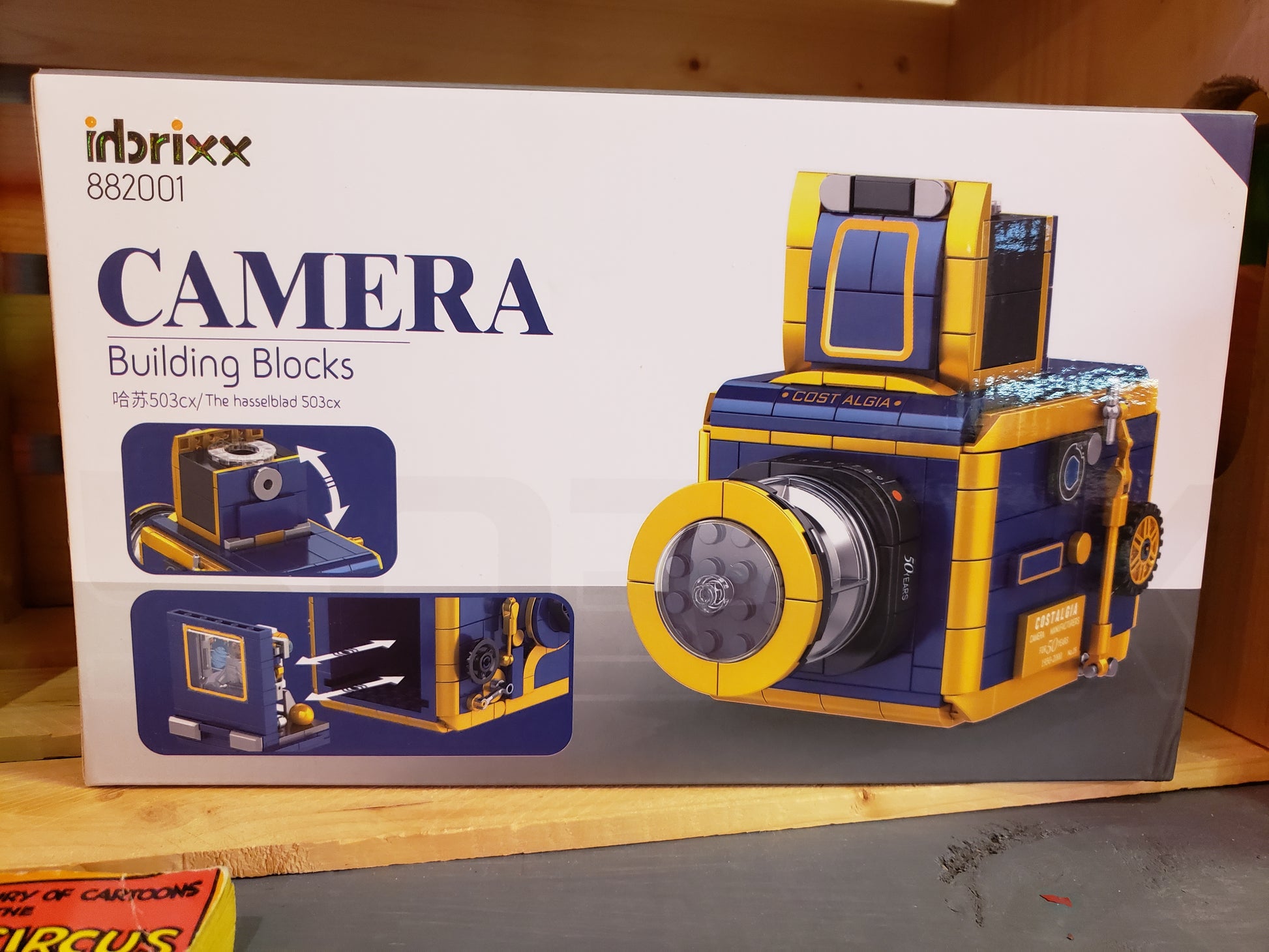 New building blocks toy in the style of vintage Hasselblad 503cx camera.