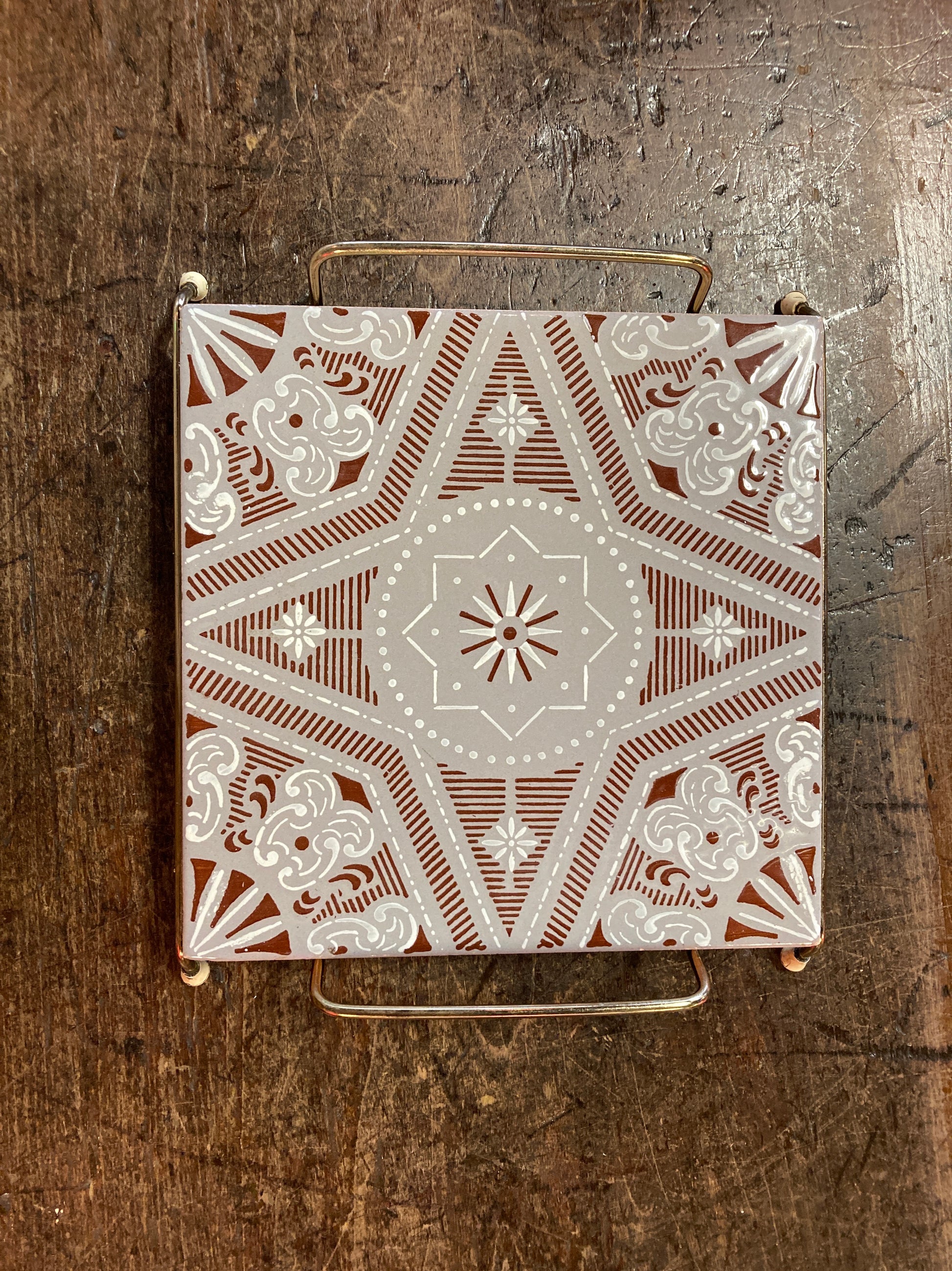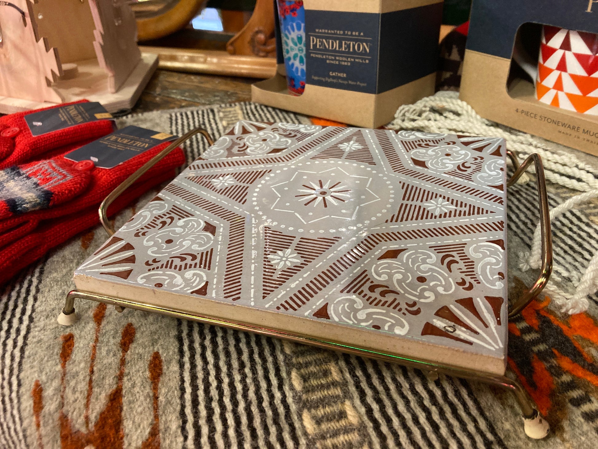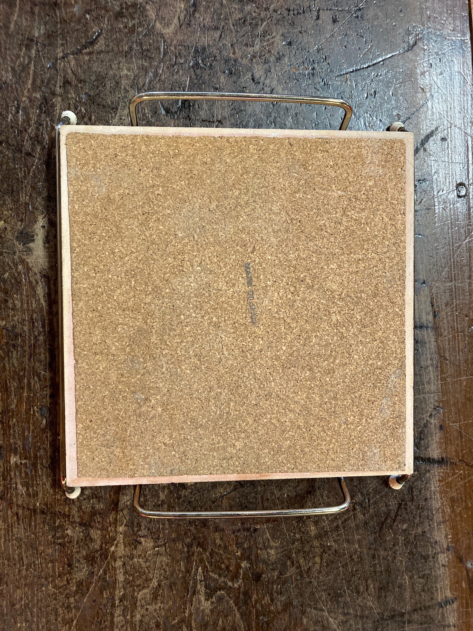Mid-Century Trivet made to hold hot dishes up off your table surface. Pretty Grey, maroon and white Southwest patterned Ceramic Tile with a cork bottom. The brass stand has rubber feet and handles. 8 x 8 inches, this item is in fair vintage condition.