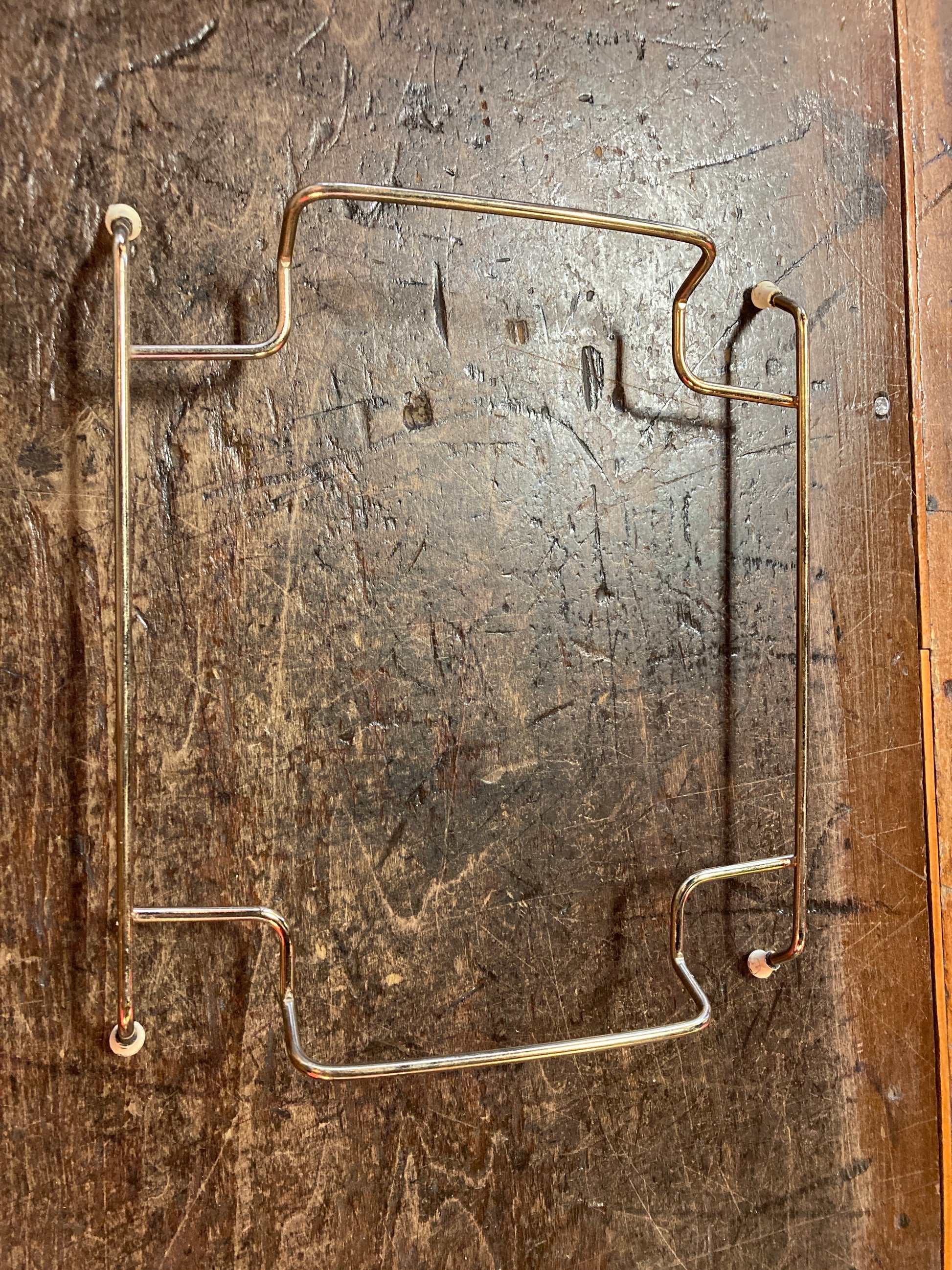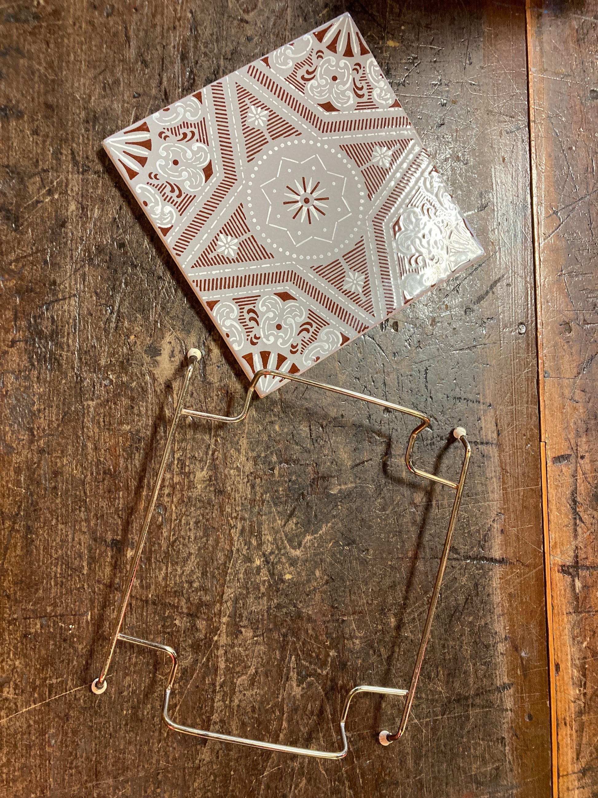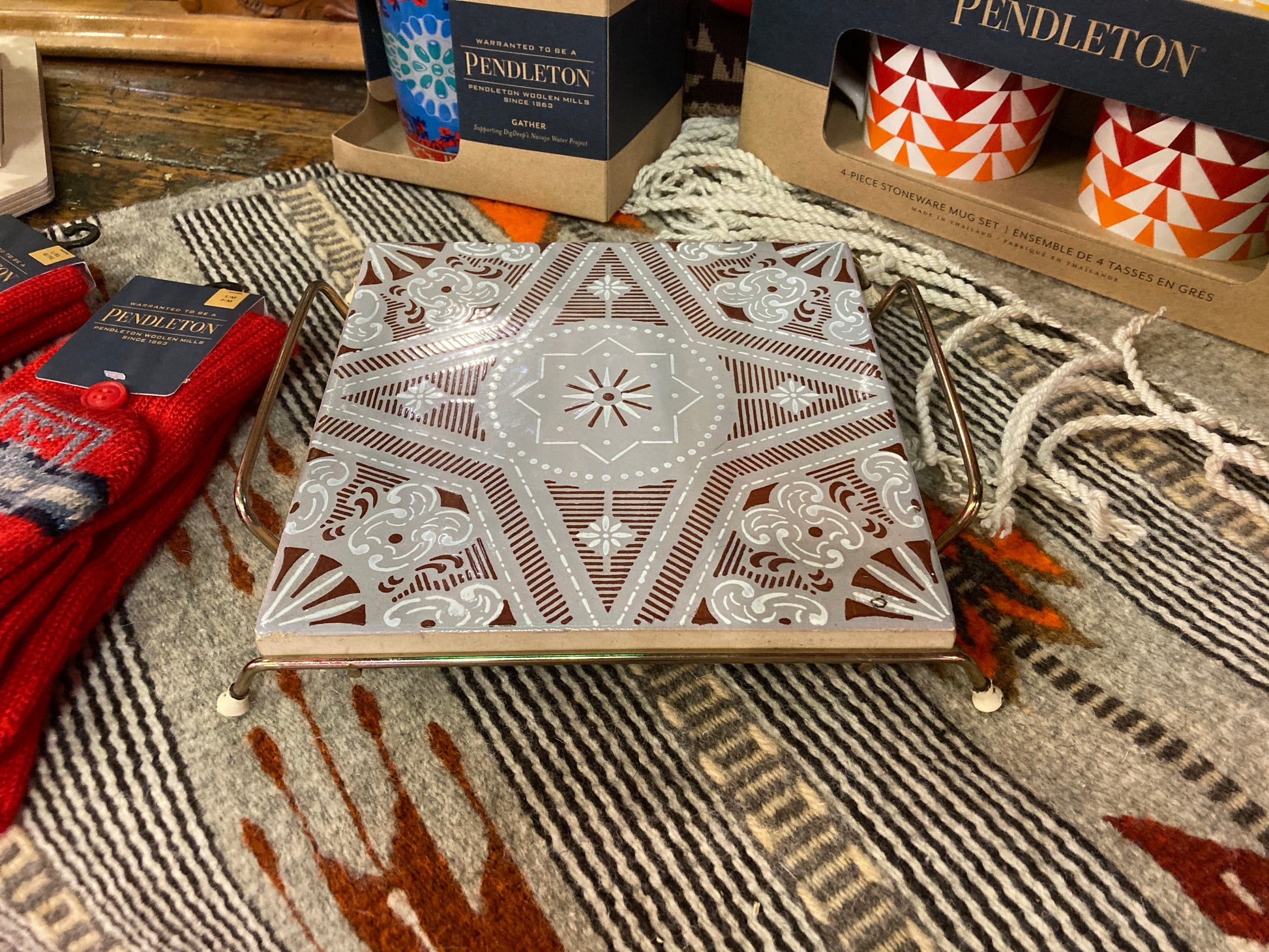 Mid-Century Trivet made to hold hot dishes up off your table surface. Pretty Grey, maroon and white Southwest patterned Ceramic Tile with a cork bottom. The brass stand has rubber feet and handles. 8 x 8 inches, this item is in fair vintage condition.