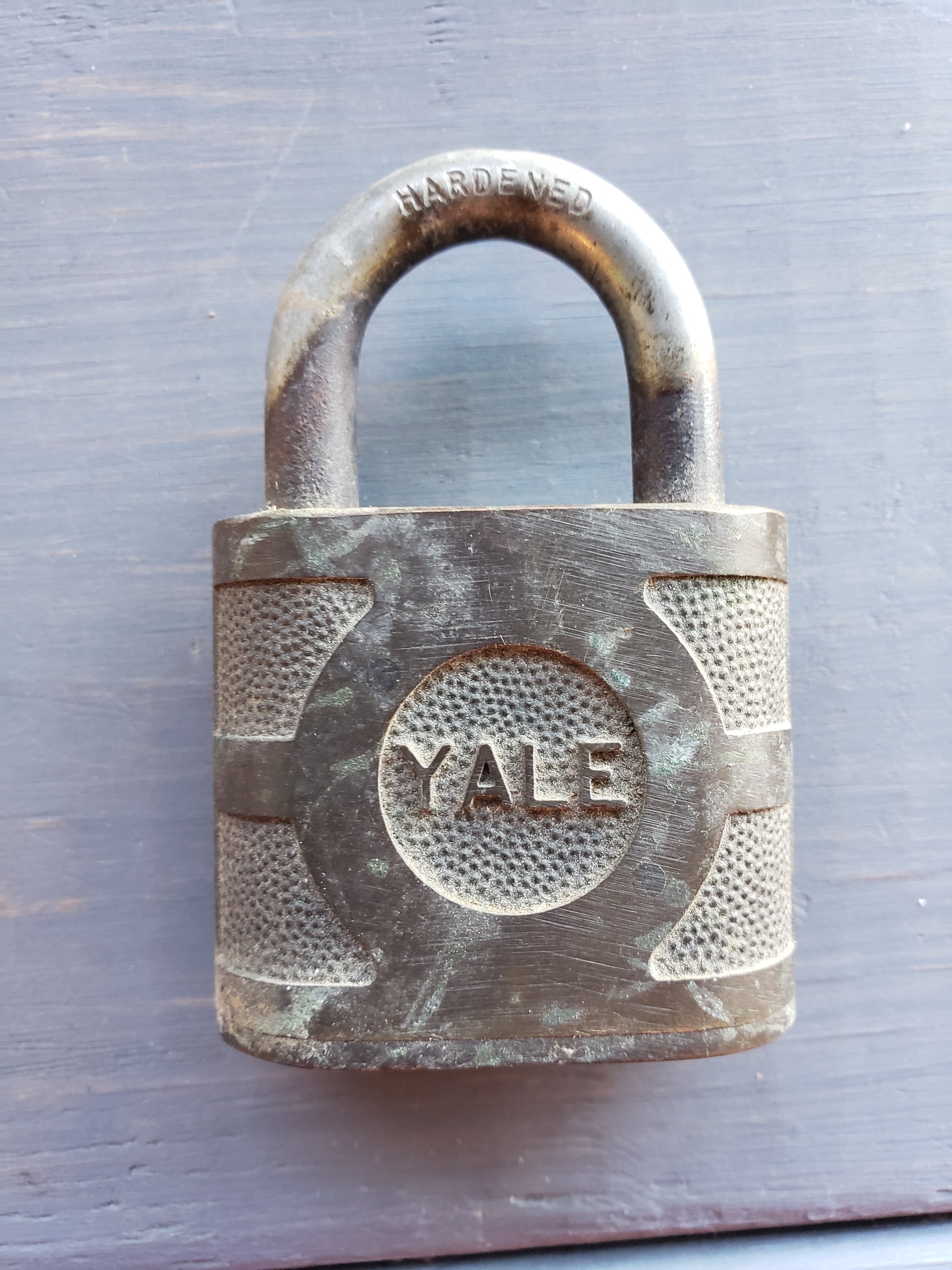 Heavy vintage padlock, has HARDENED embossed on the shank. No key. Vintage condition.
